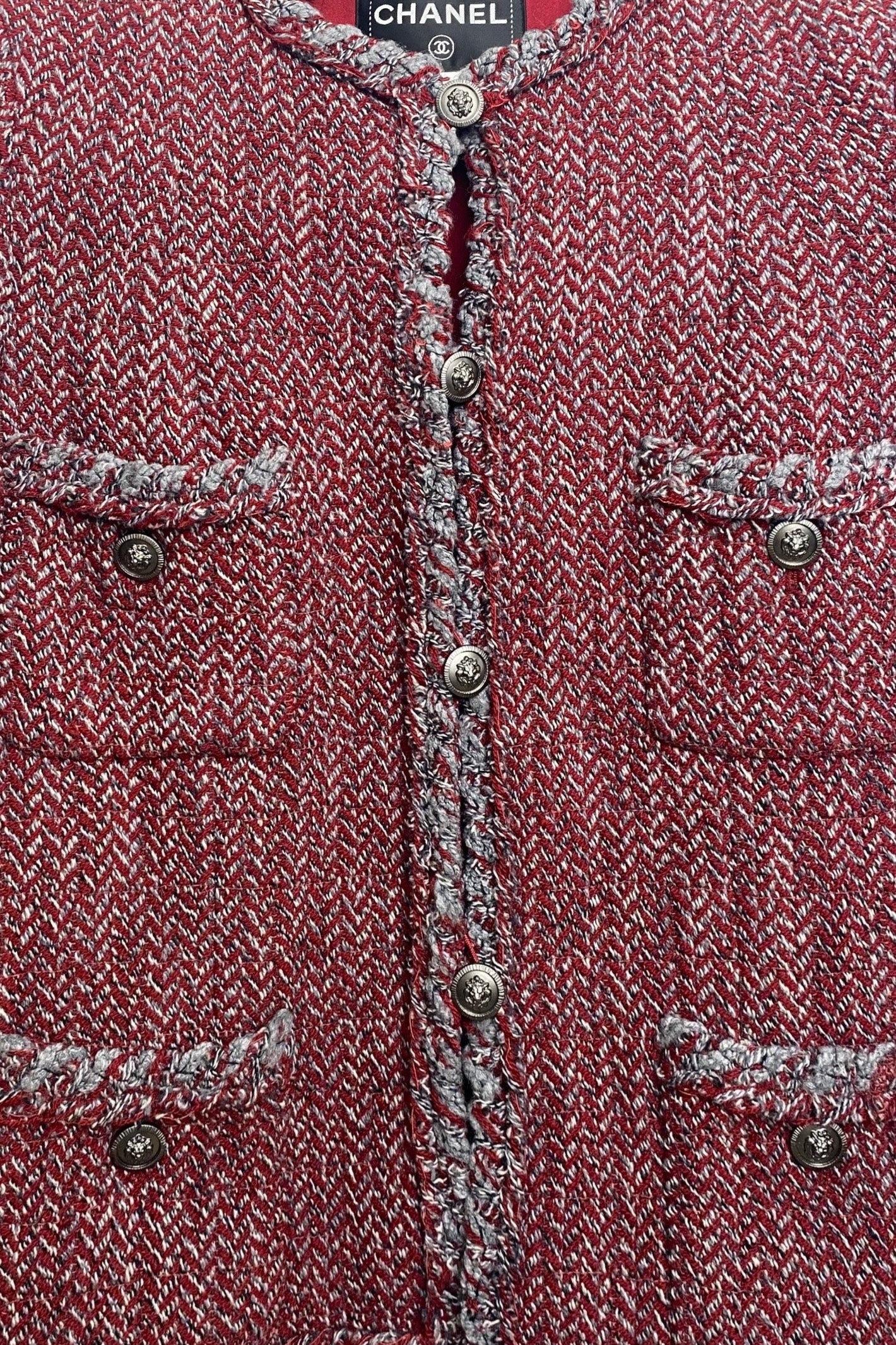 This classic Chanel jacket is a wardrobe essential! Composed of a beautiful burgundy dark red tweed, interwoven with various shades a grey & pretty braided trim, it is the perfect item for fall! The jacket features silver tone buttons ornate with a lion's head and a tiny "CC" logo. Buttons down the front with 4 Buttons, 4 Buttons on each Patch Pocket, and 3 Buttons on each Sleeve, Totaling 14 amazing Buttons! The interior is a soft red camellia silk, with chain at hem.