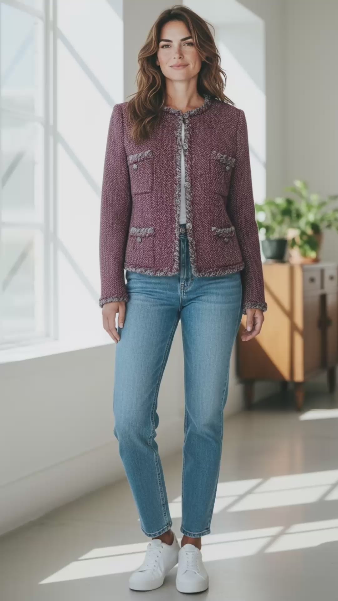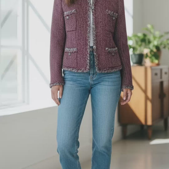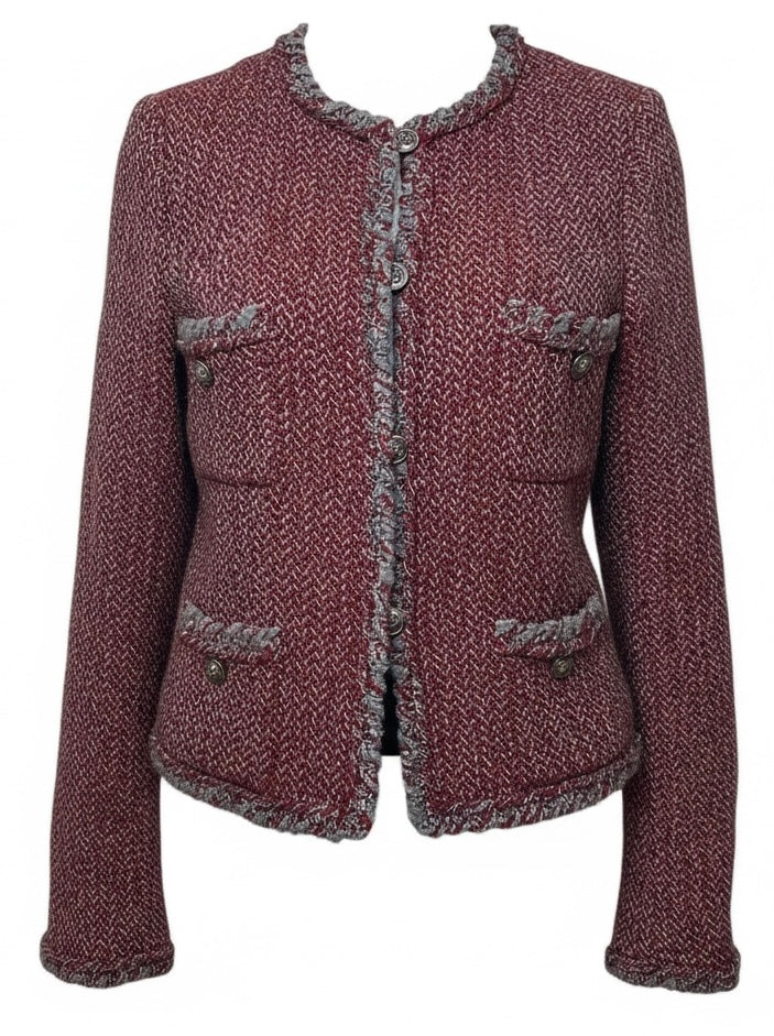 CHANEL 08A BURGUNDY GREY BRAIDED TRIM TWEED JACKET BLAZER FR 38