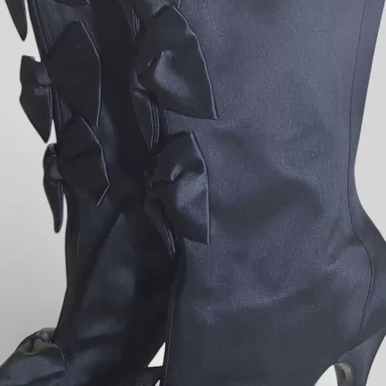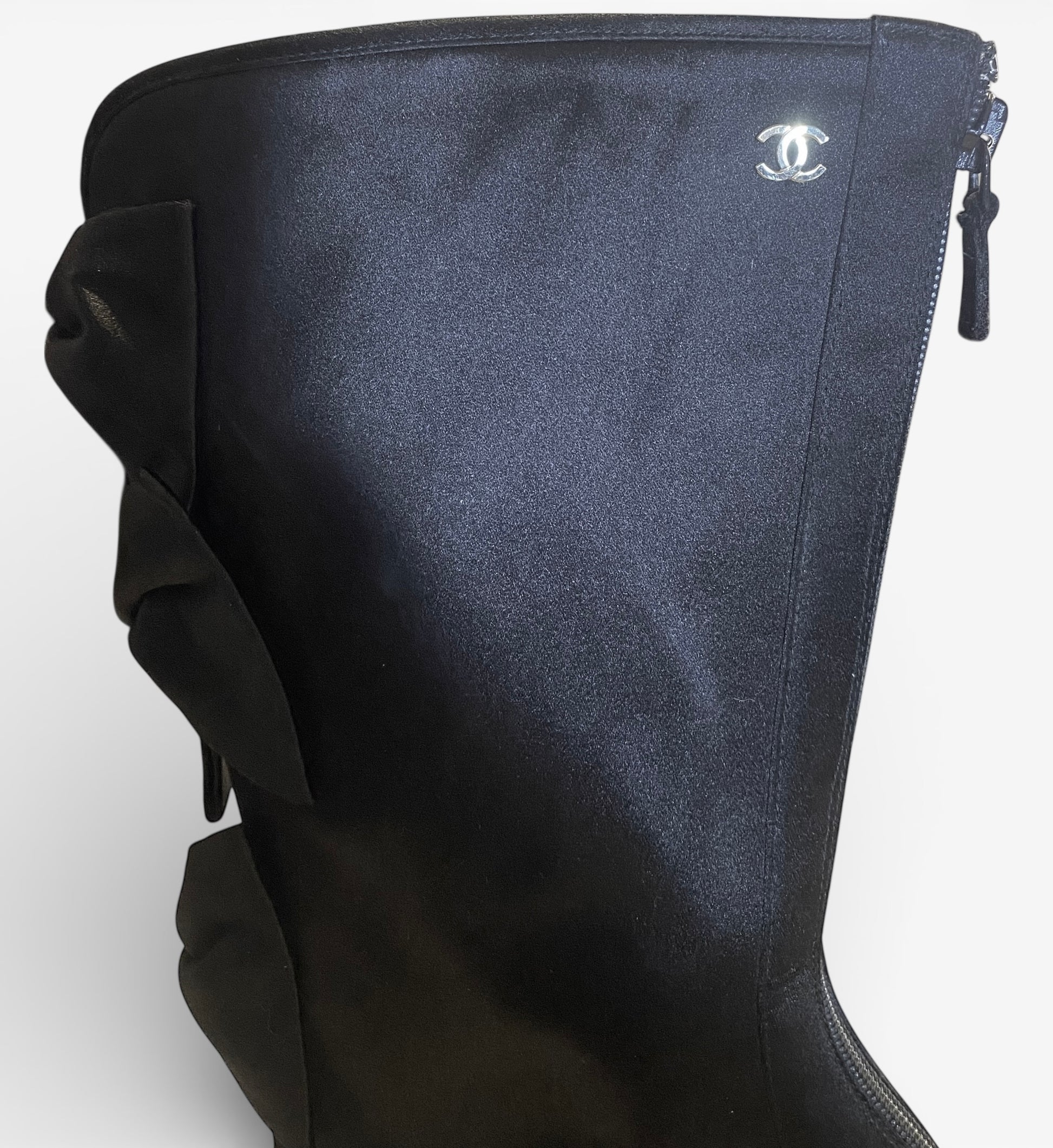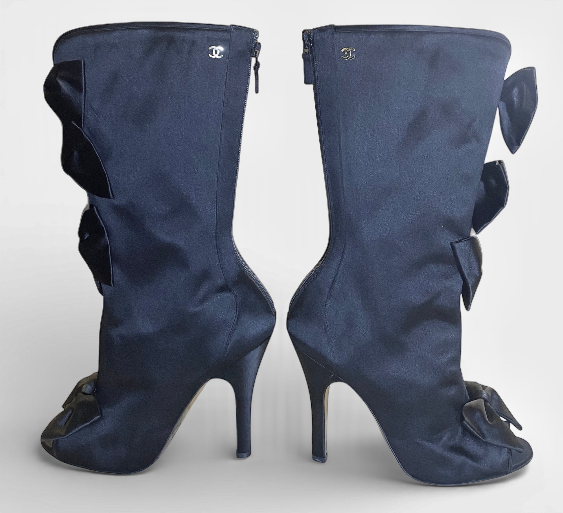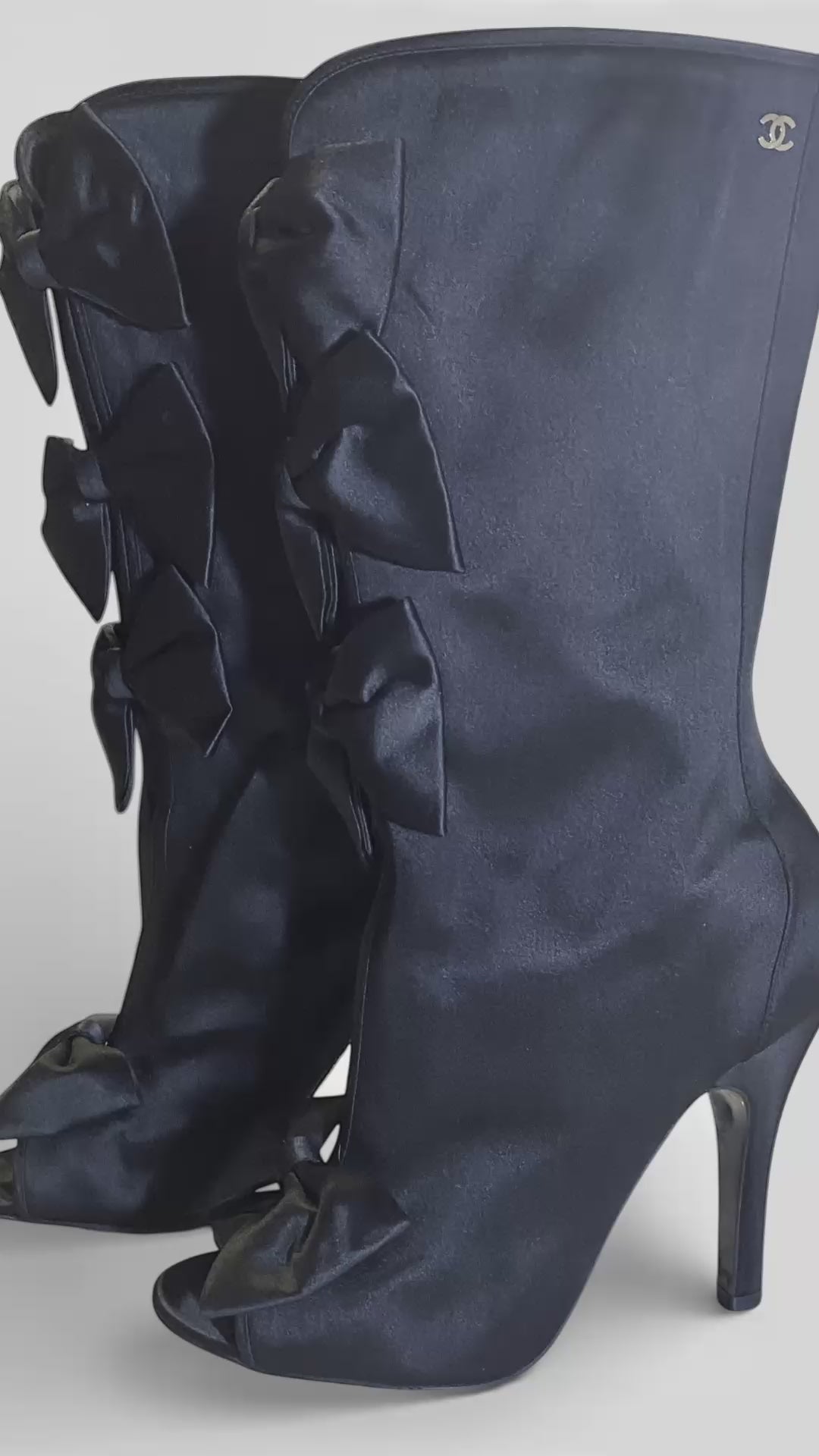 Rare Chanel 09P Black Satin CC Bow Mid Calf Peep Toe Booties Ankle Boot Heels FR 38