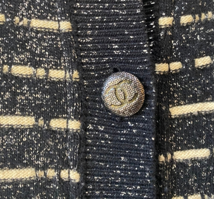 Stunning Chanel Knitted Metallic Stripe Black, Silver, Ecru long cardigan with two functional pockets, & 6 magnificent CC large buttons on the front. There is an attached Brooch in black grosgrain with a black metal Crystal CC on the chest.