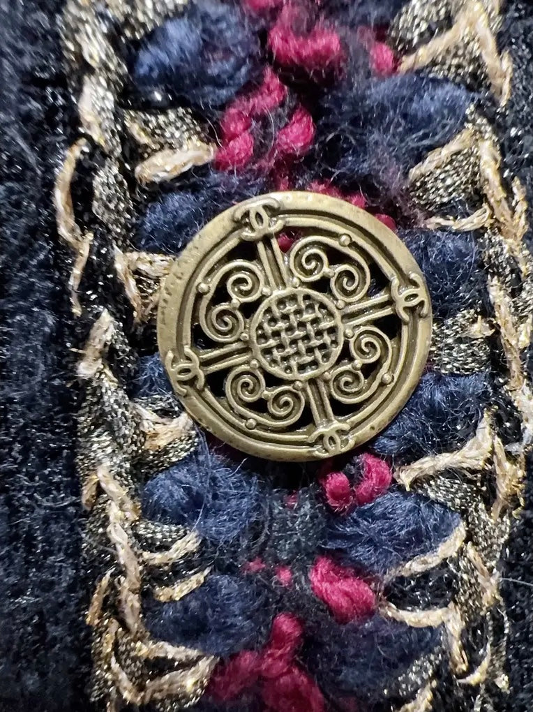 Chanel Tweed Black Jacket with Red, Burgundy, Navy, & Gold Braided trim, patch pockets with Gold CC logo buttons, chain link inside, and Gold CC logo front button closure, vent slit at back, tweed trim at inner elbows. There are 10 Total Gold Intricate CC buttons on this masterpiece!