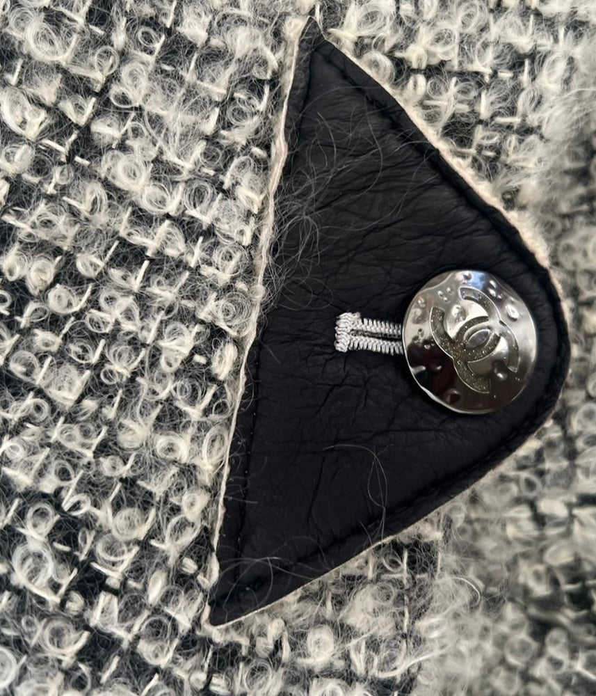 Exquisite Chanel Grey speckled mohair-blend bouclé tweed single breasted collarless tailored jacket with Large CC TurnLock fastening at front. Black Lambskin Leather Trim with 2 Large CC metal buttons at cuffs. 2 Side Slit Leather Trim faux pockets.