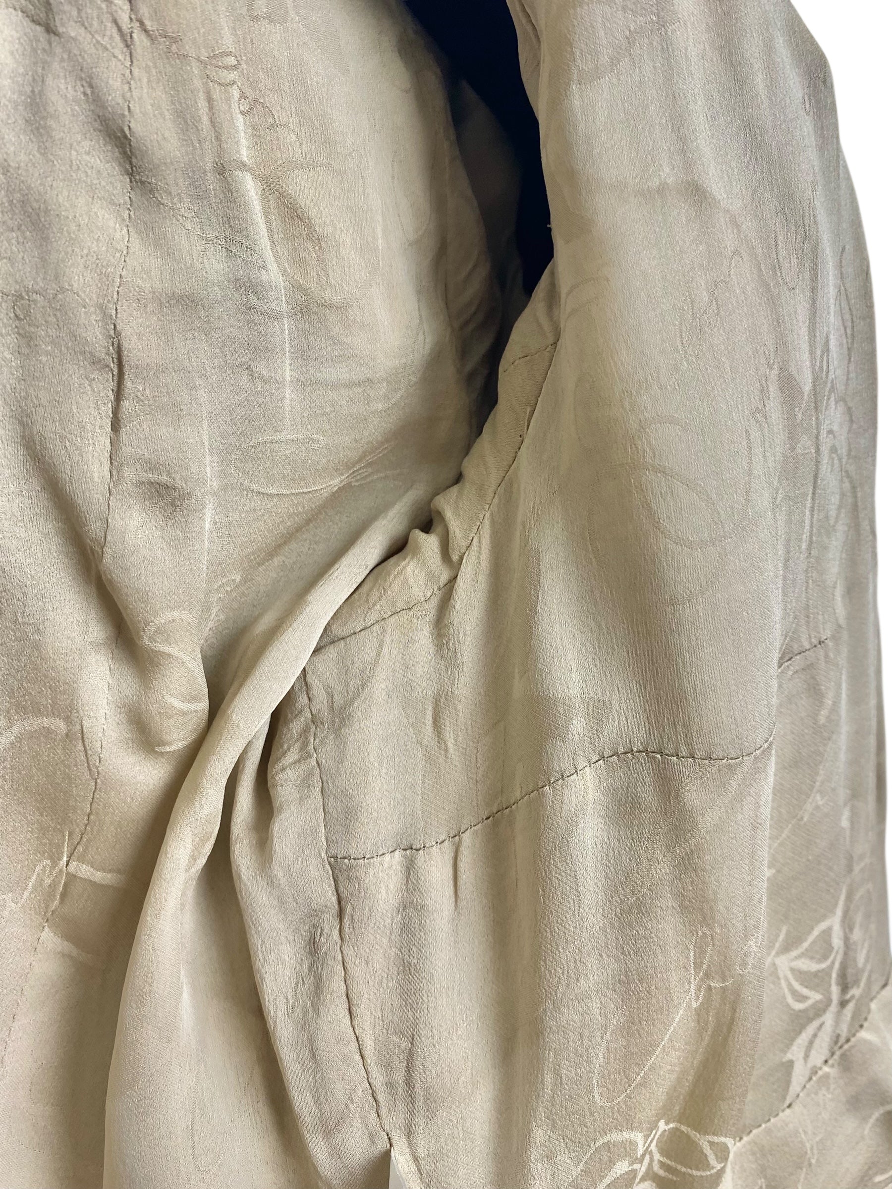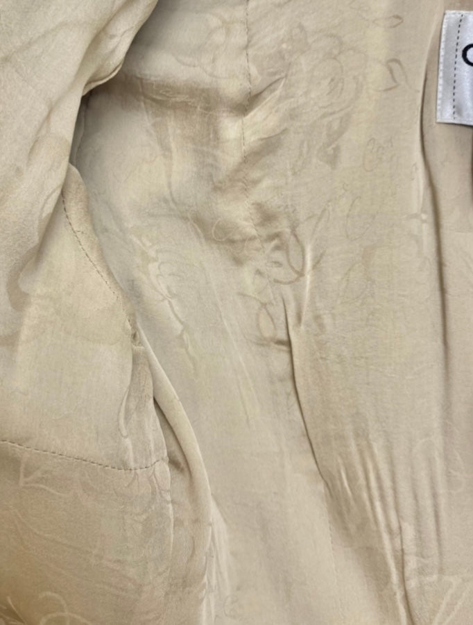 -Full silk lining with camellias, chain link at interior hem for perfect drape