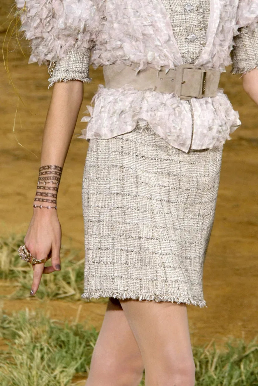 Famous Chanel 3/4 sleeve beige metallic tweed jacket and Matching Skirt Suit Set, from 2010 Spring Runway Metier D'Art Collection. As seen in the Ad Campaign and in numerous magazines. Appeared in ''Les Beiges'' Advert with Gisele Bundchen.