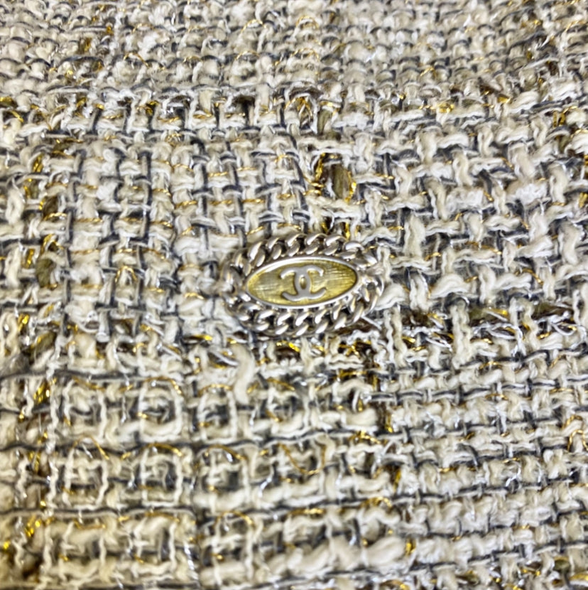 Chanel 10P Fantasy Tweed Beige Metallic Gold Jacket Skirt Suit Set FR 42/44