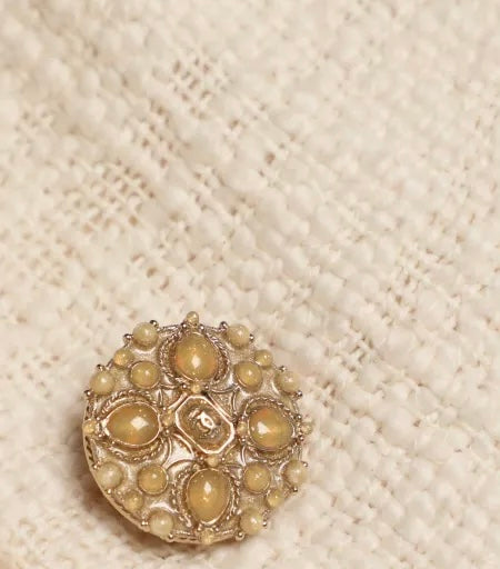 Beautiful Ecru Boucle Cotton Button down Long Jacket with Gripoix Crystal Jeweled Buttons. Four Large front and three smaller at each cuff. Two side slit pockets and vent slip at back. Fully lined in camellia silk. Small shoulder pads. Retail $6.7k