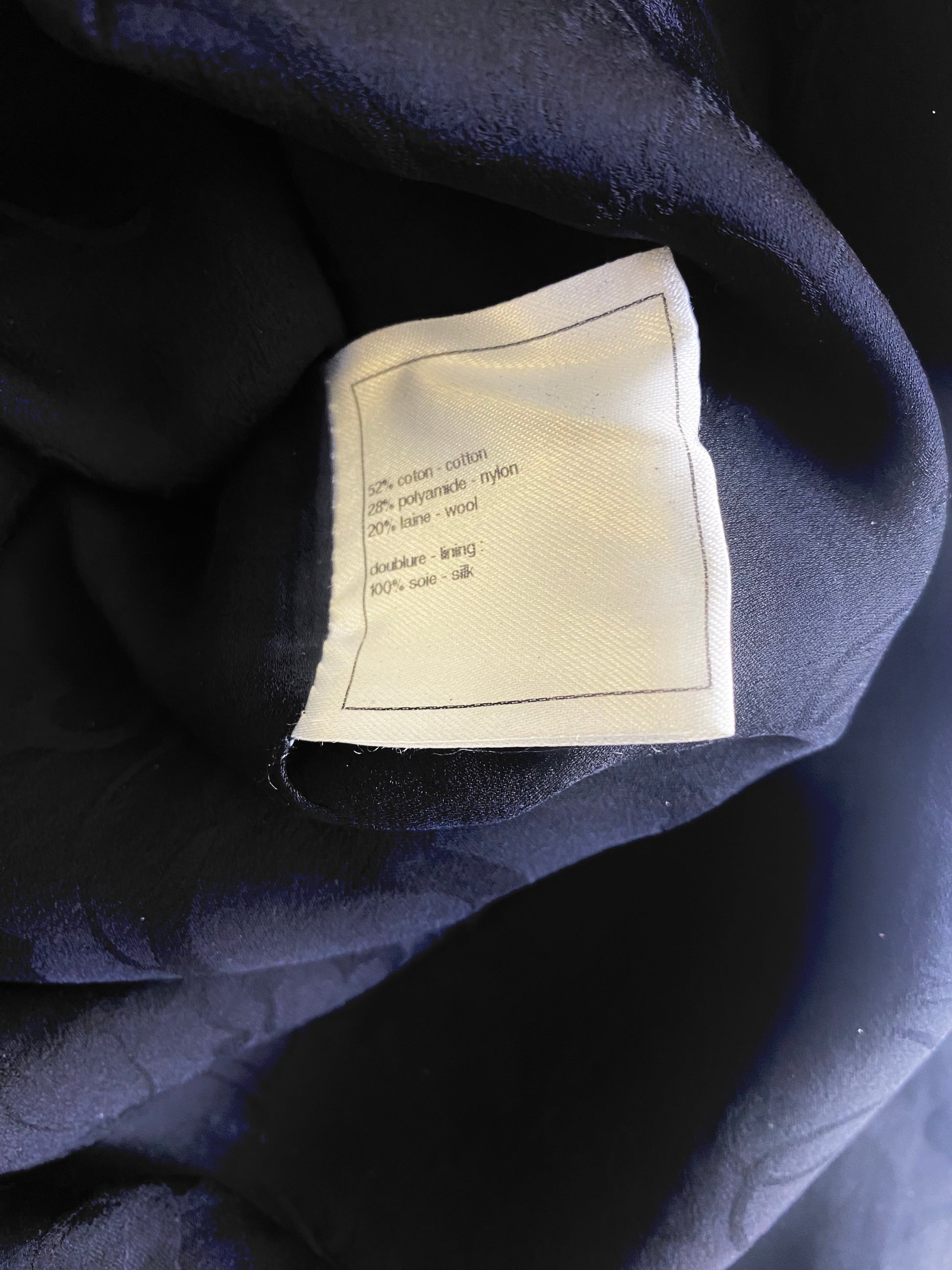 Fabric: 52% Cotton, 28% Polyamide, 20% Wool; Lining 100% Silk