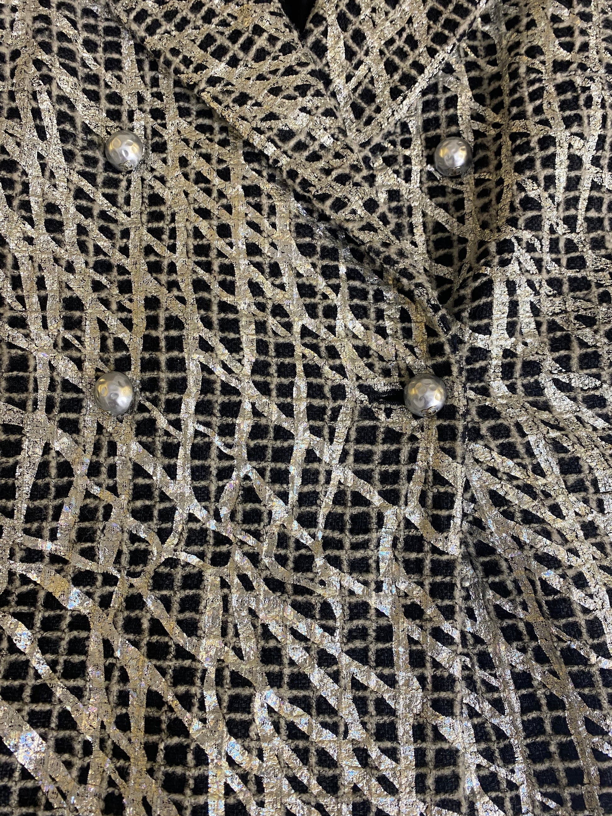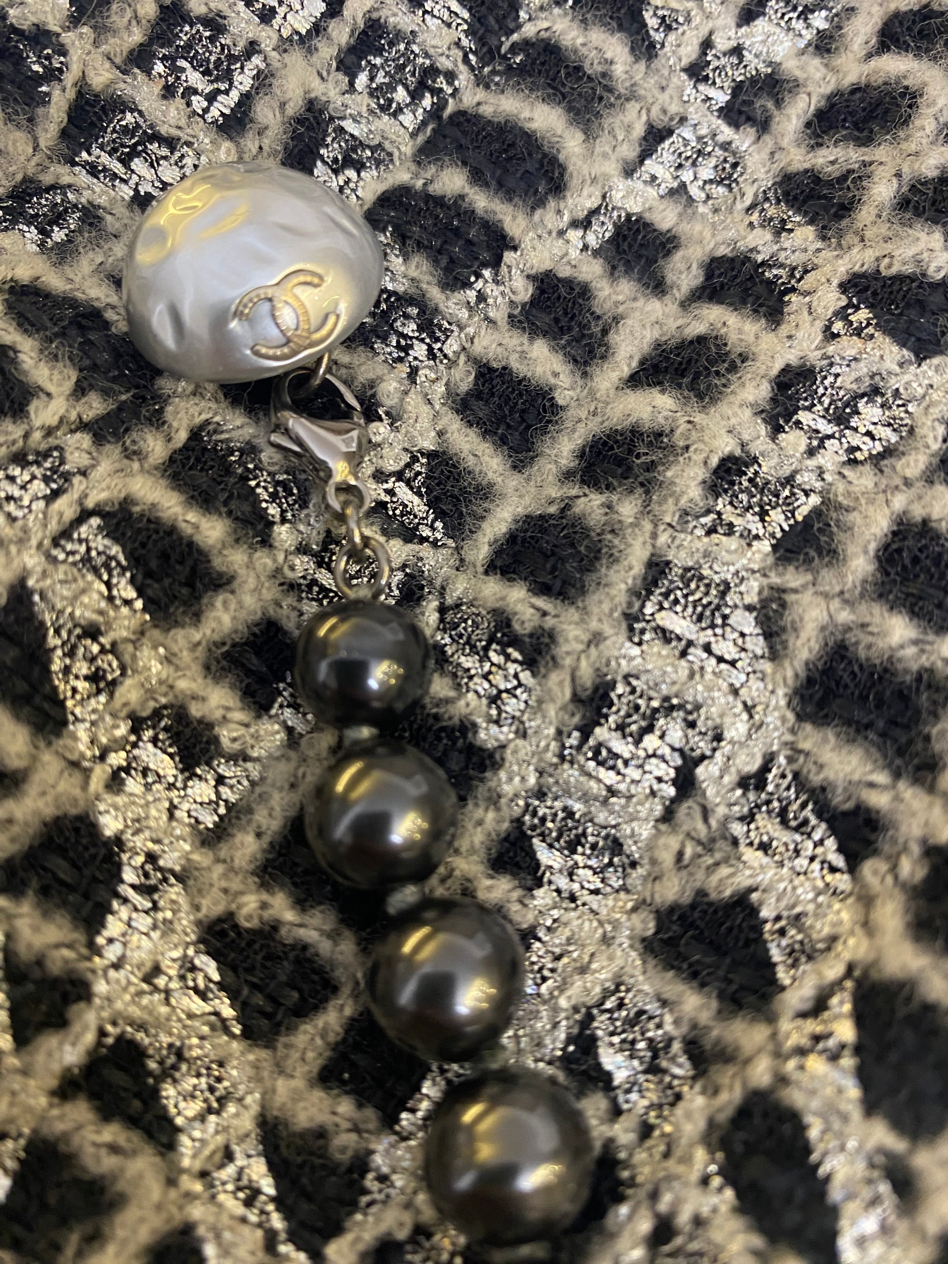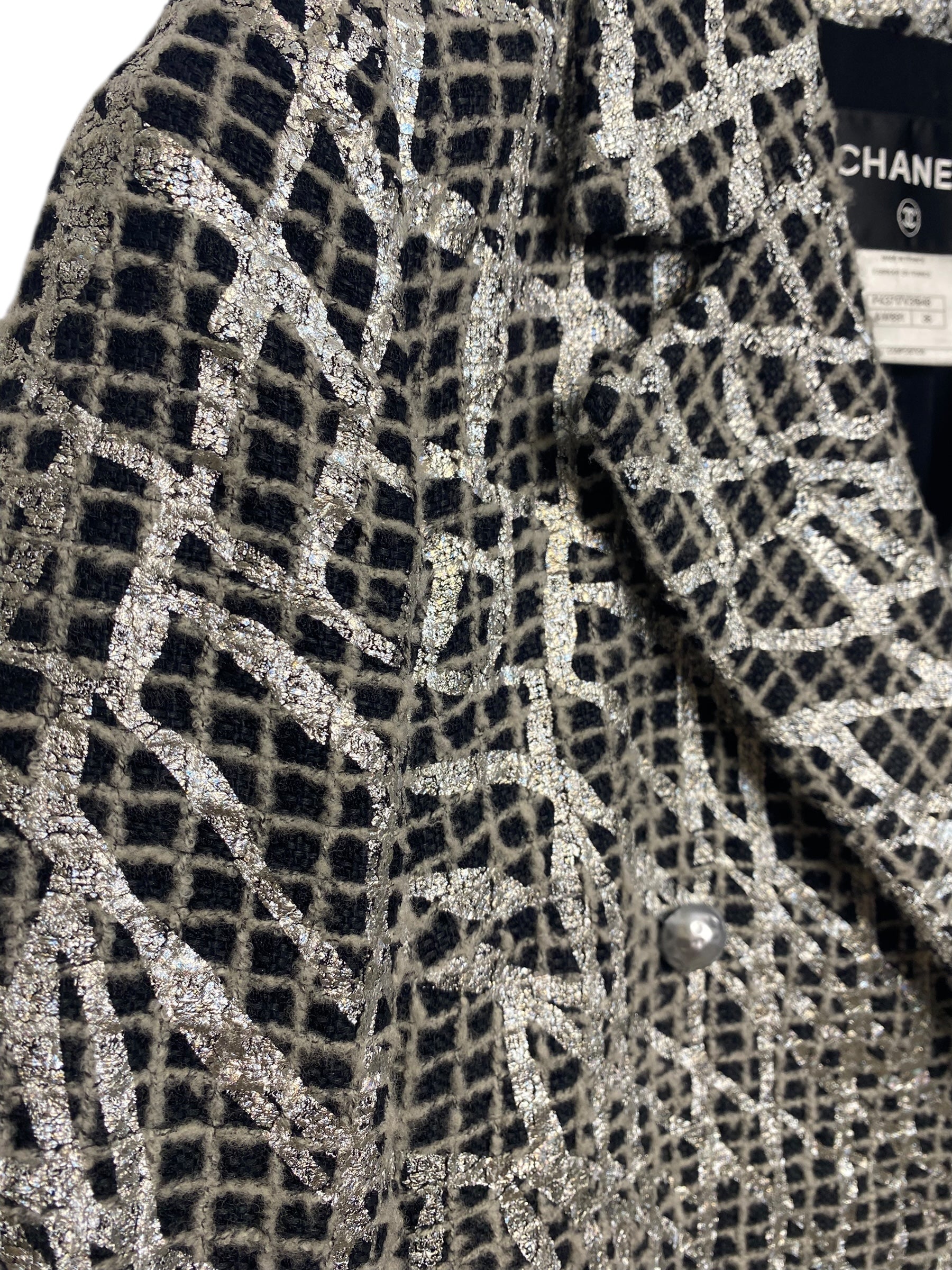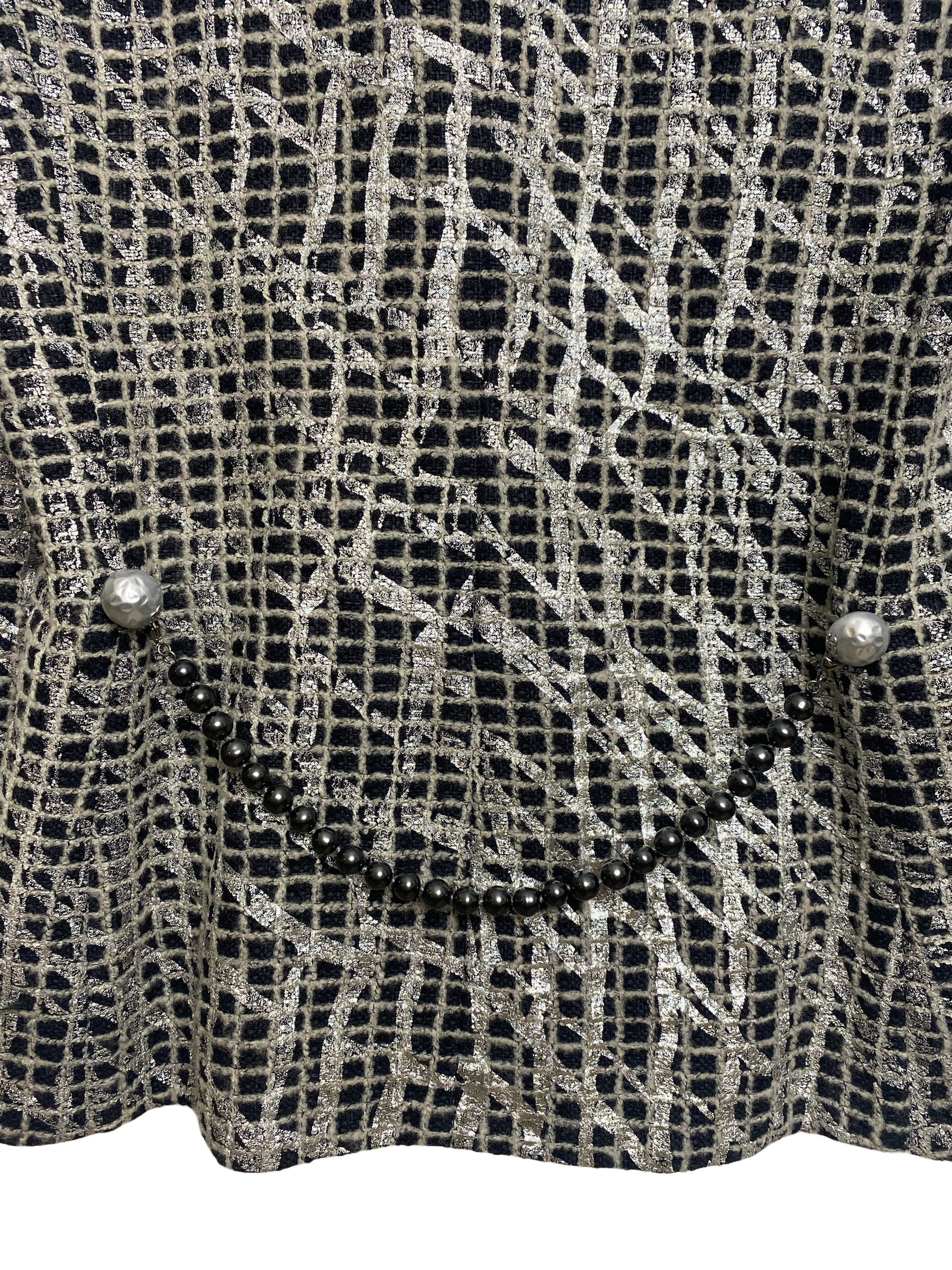 Chanel 12P Double Breasted Silver Metallic Graffiti Black Removable Pearls Jacket FR 36