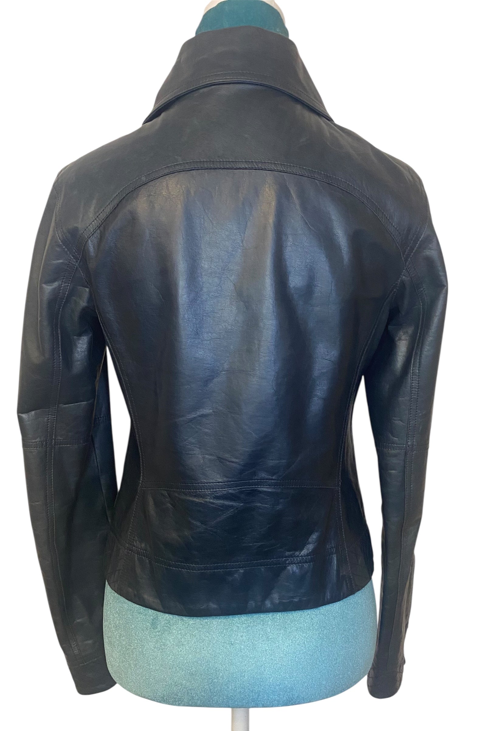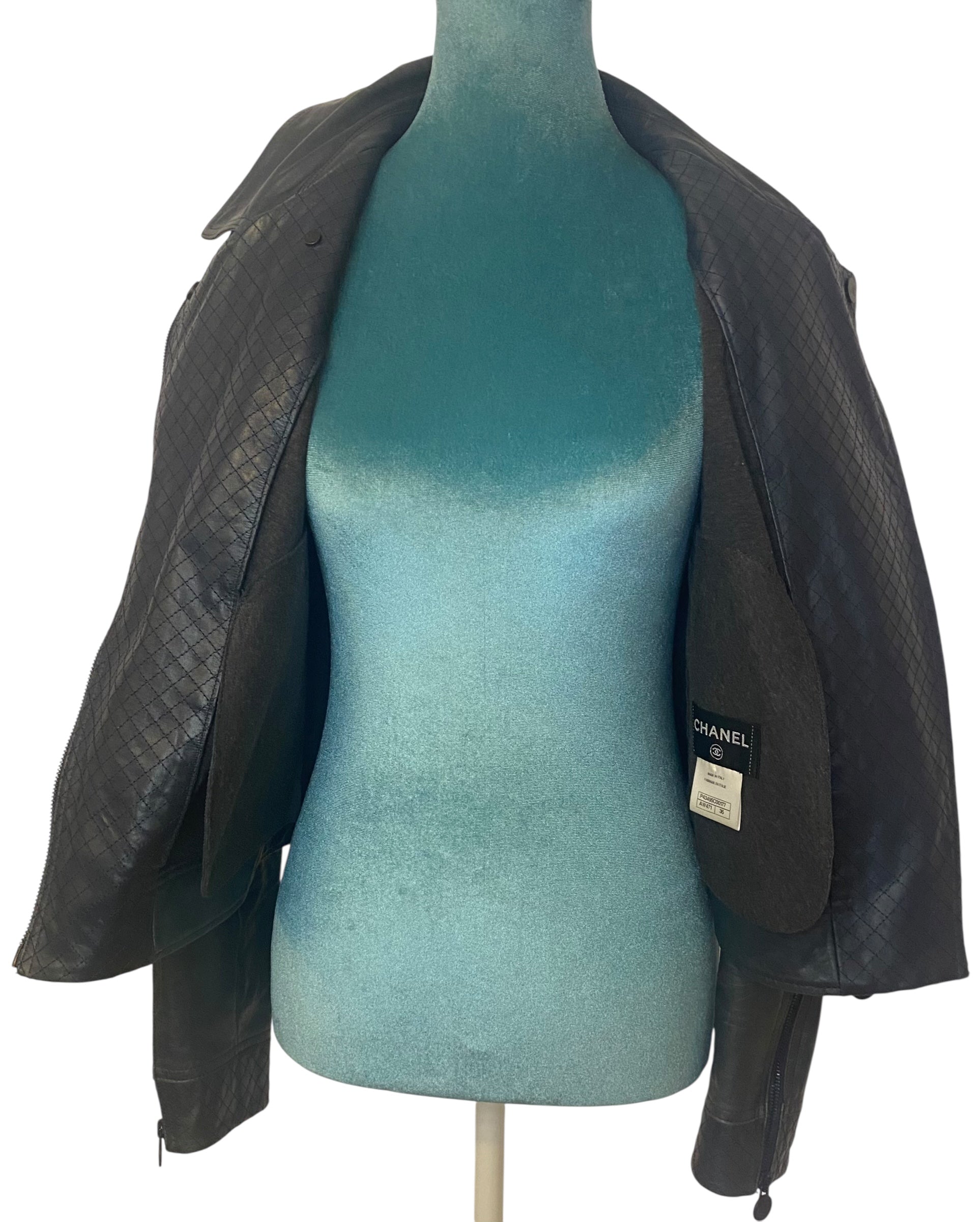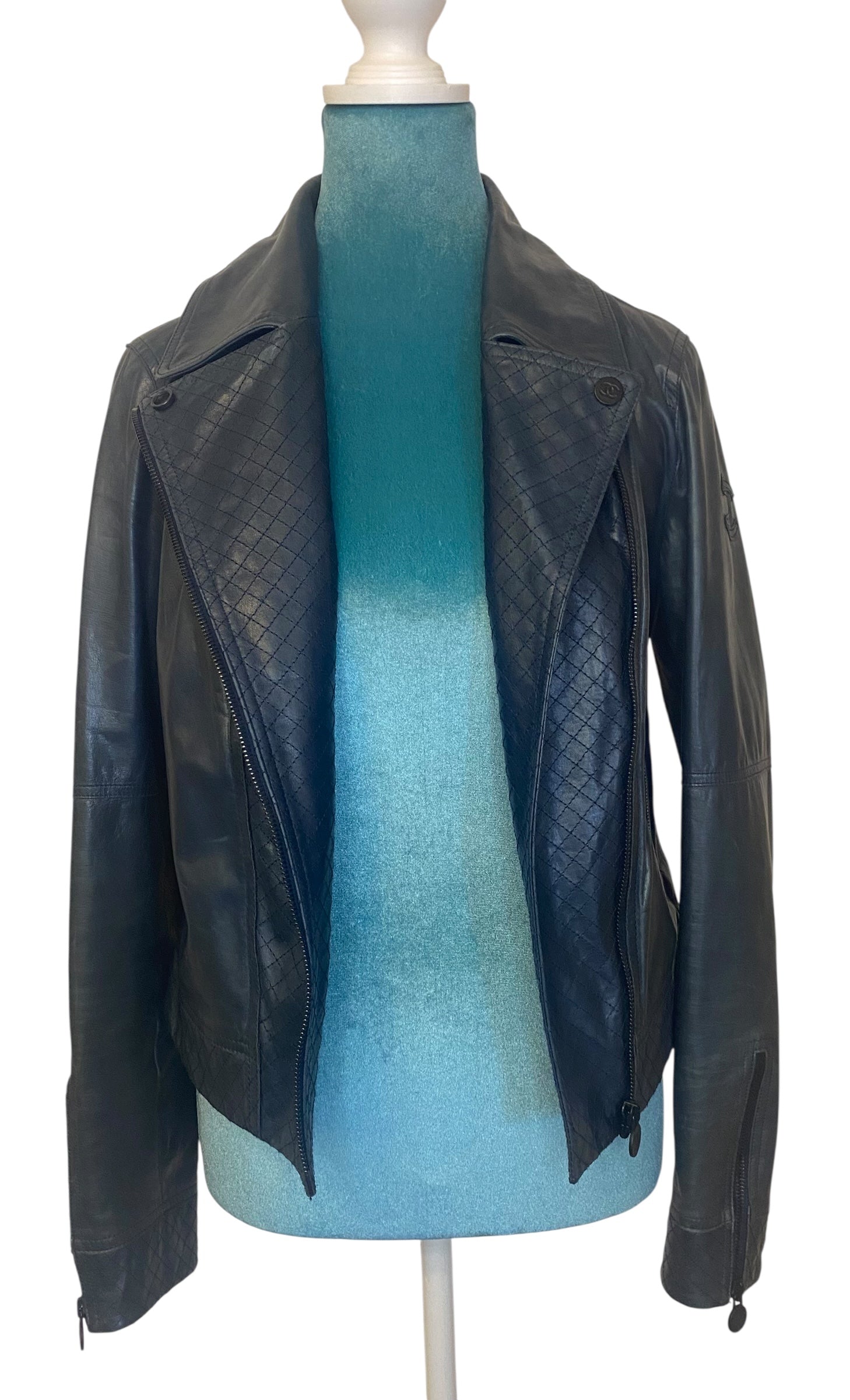 Chanel 12P Navy Blue Petrol Quilted Leather Biker Jacket FR 36
