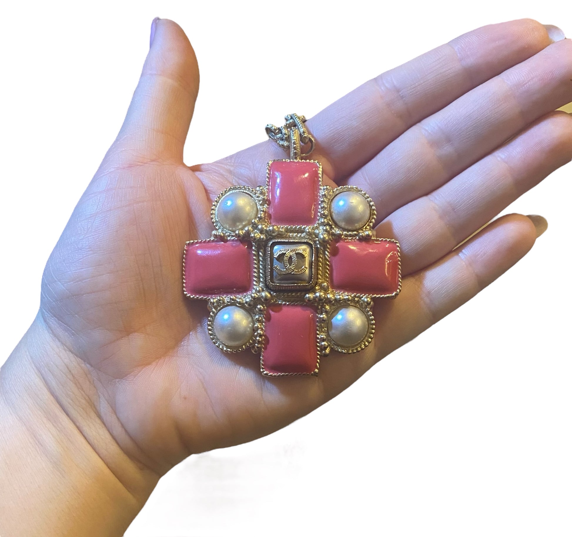 Superb Chanel XL Pendant Necklace with a splendid bright pink coral poured glass Maltese cross adornment. It is solid and heavy with a rich look. Gold Metal with Grey Center and Gold Center CC. Adorned with Pearls Around.