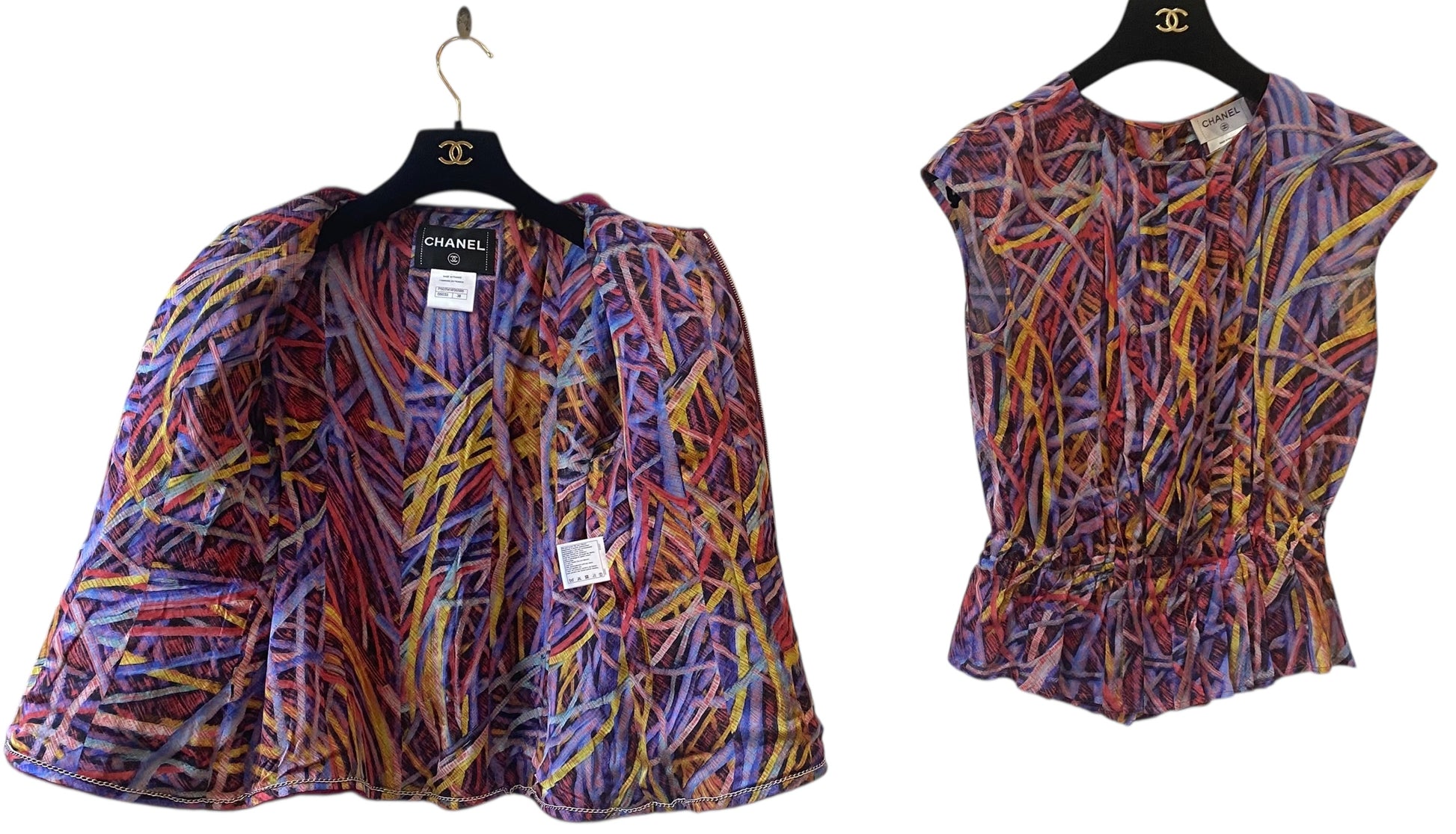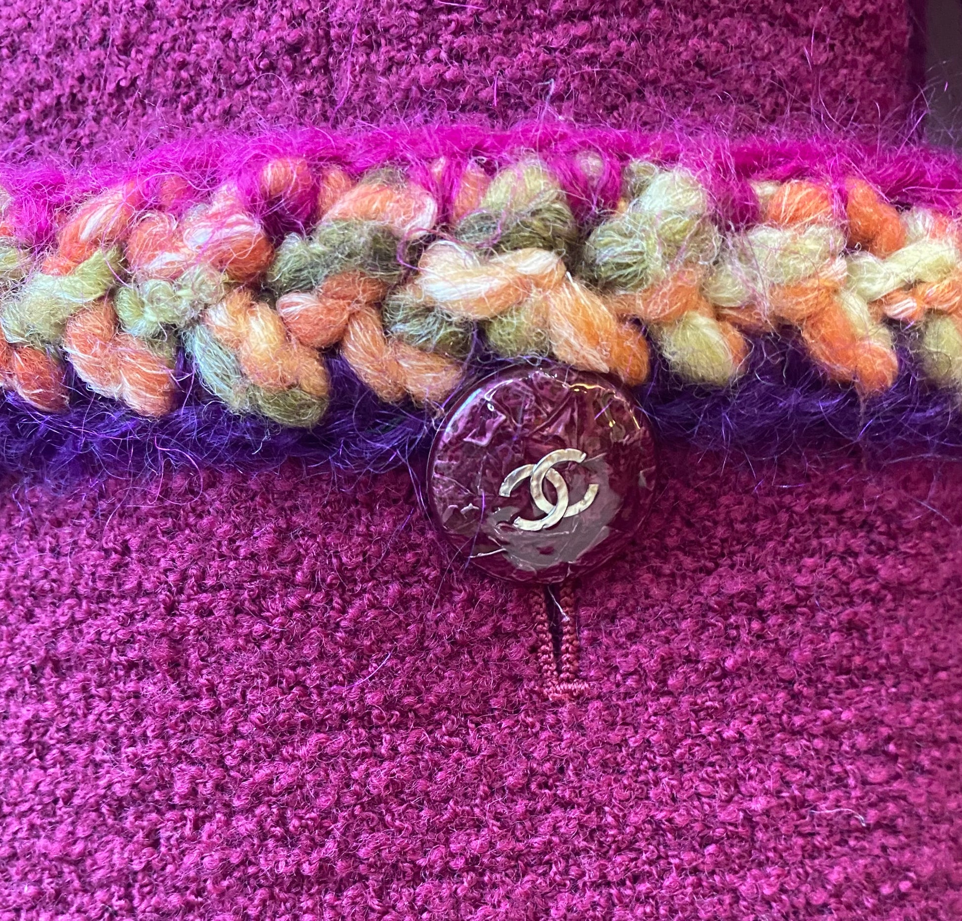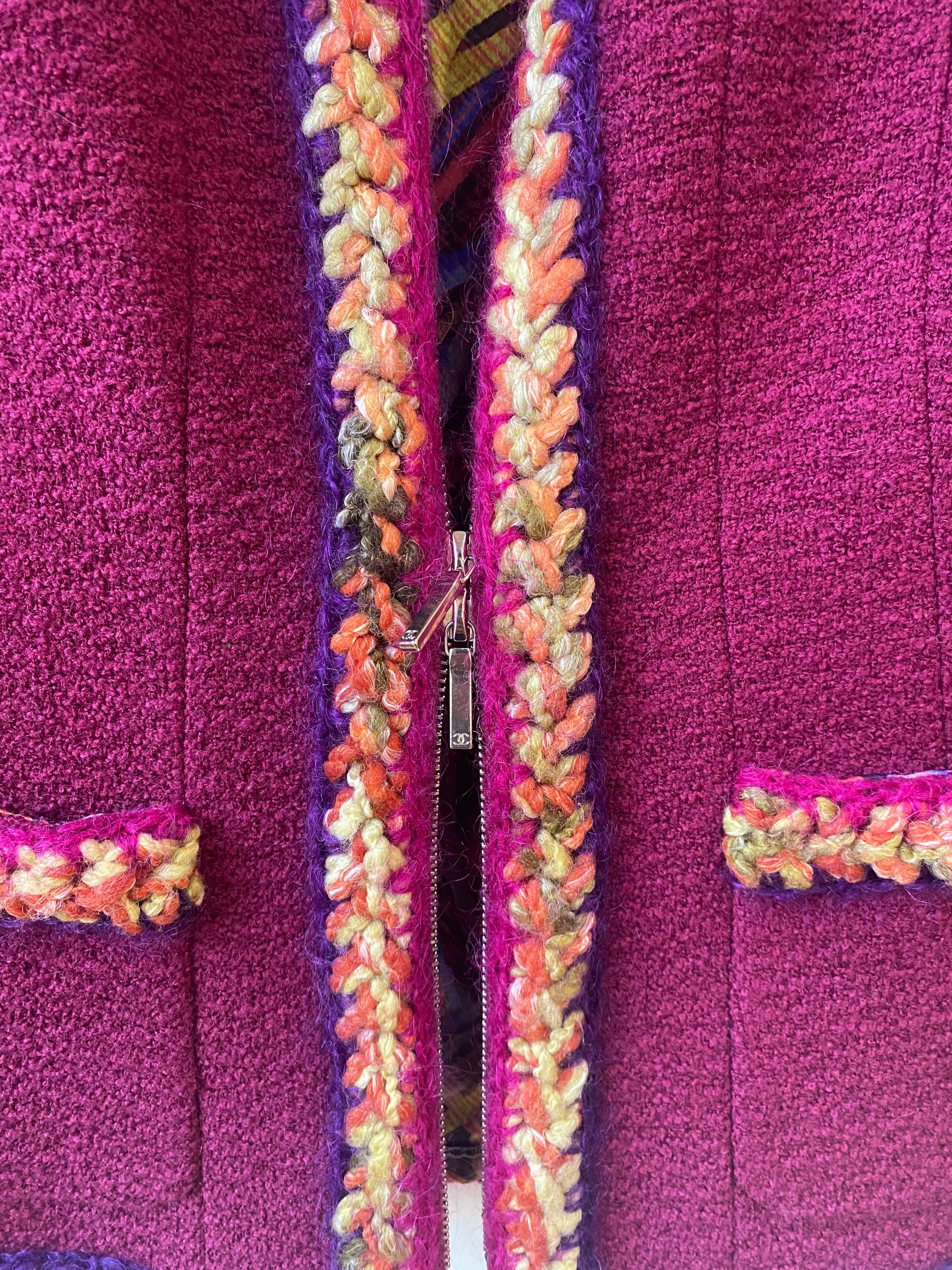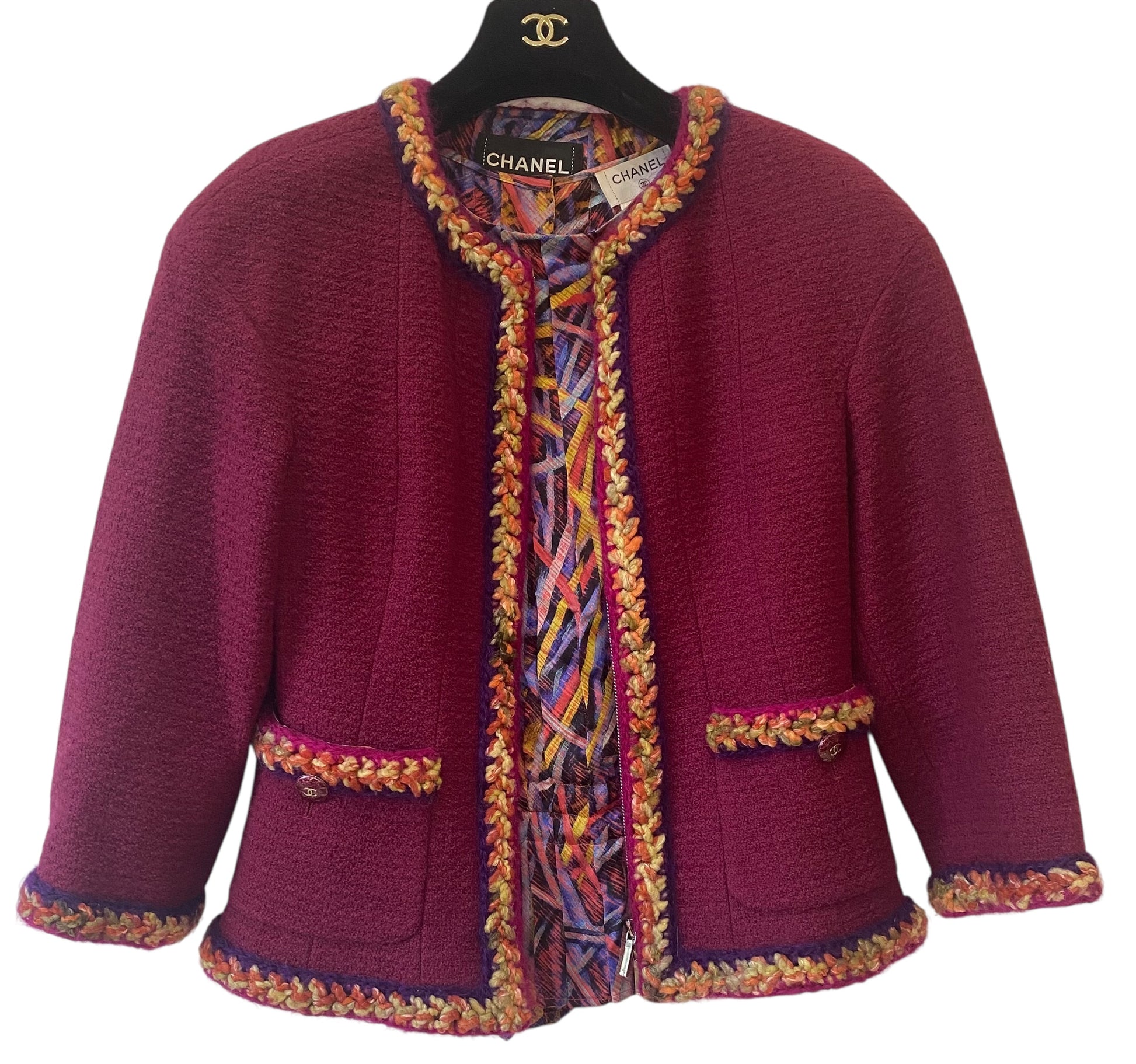 The wool jacket is a beautiful Raspberry Color with two CC front logo buttons on the pockets, 2 dual zipper CC closures, Multicolor Tweed Braided Trim, lined with a colorful silk interior abstract print which is the same print as the blouse. Iconic Chanel chain at hemline.