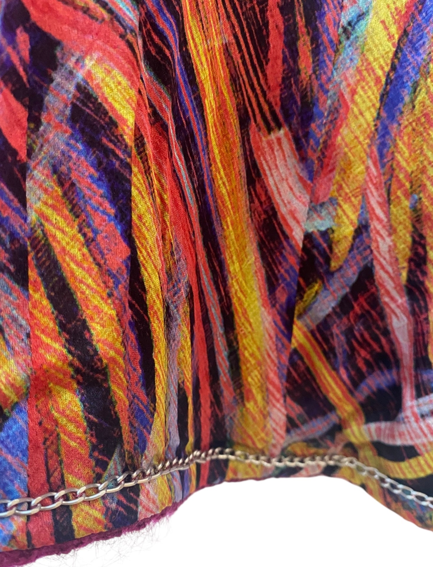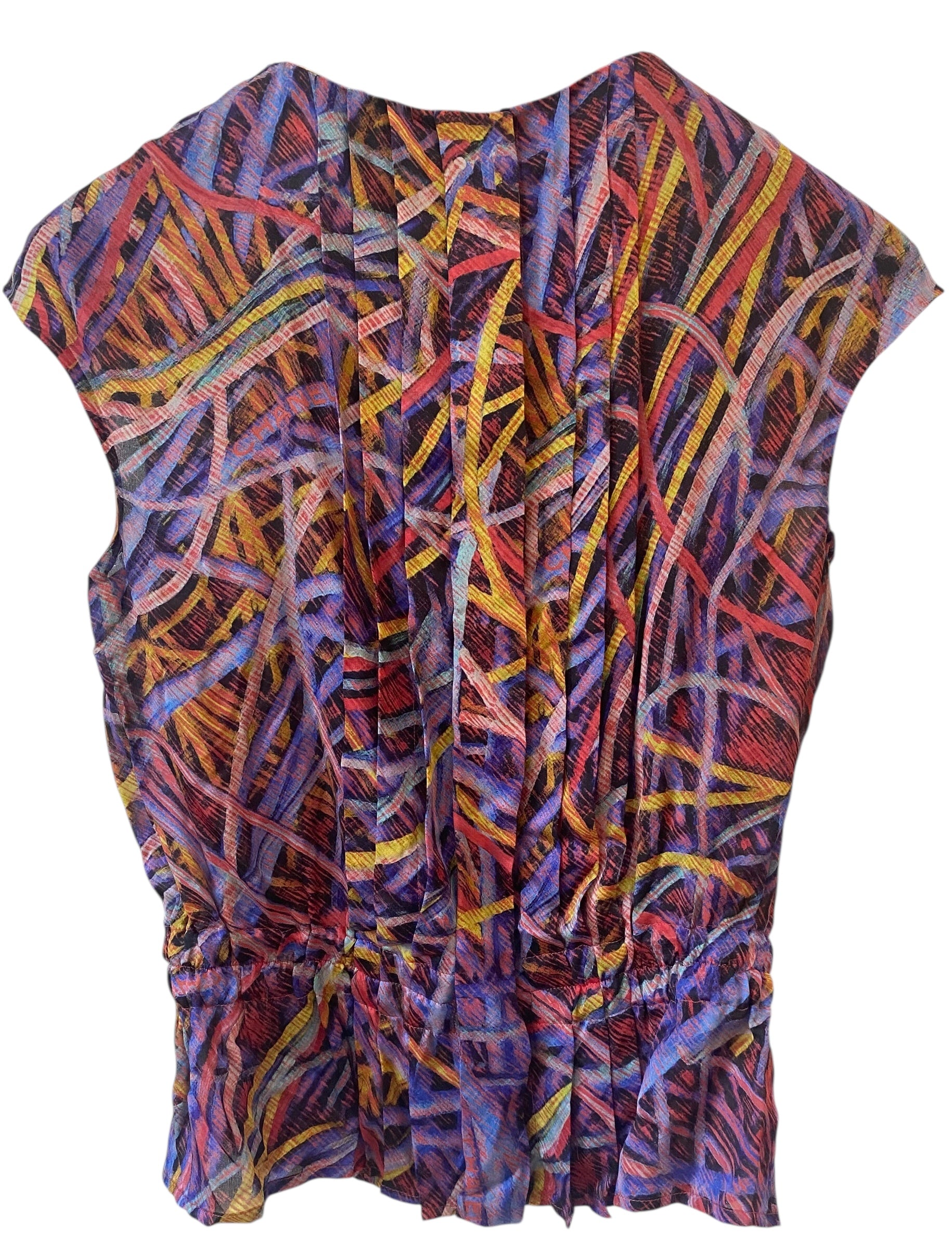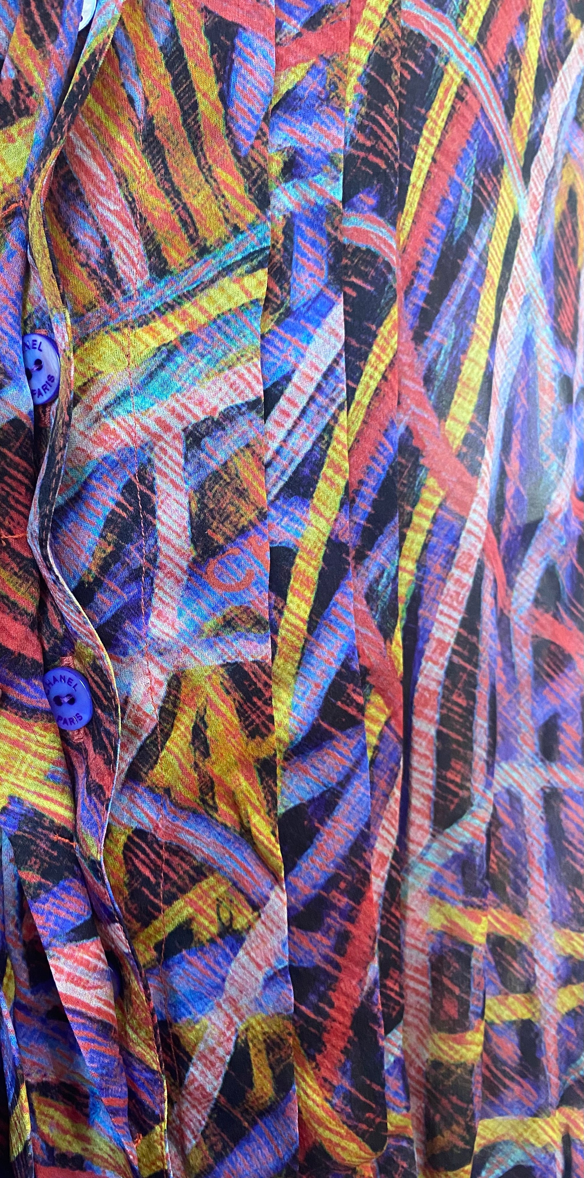 The blouse is crafted in the same silk abstract print and buttons up the back with hidden buttons, elastic blouson waist. Two hidden buttons at the back of blouse replaced that can’t be seen since it is a hidden by the silk overlay.