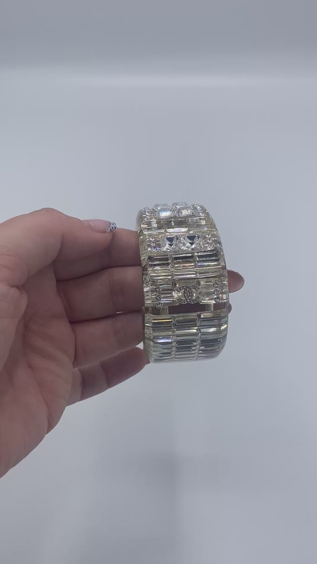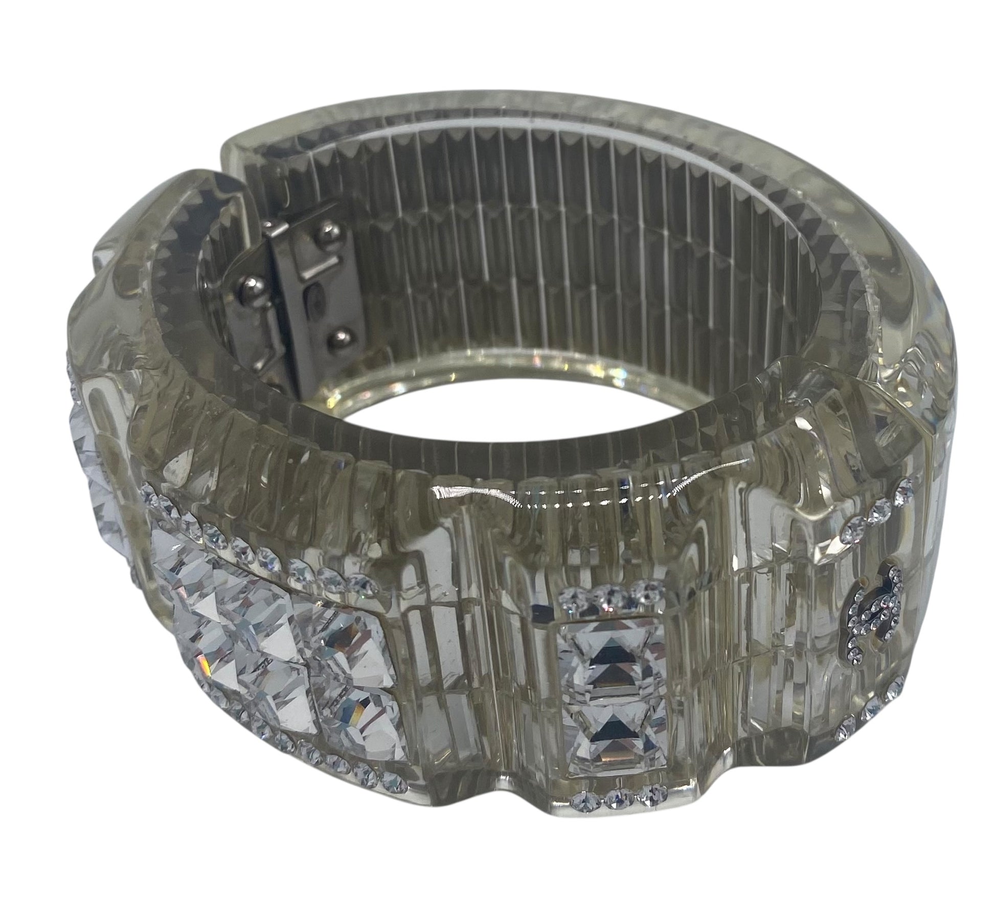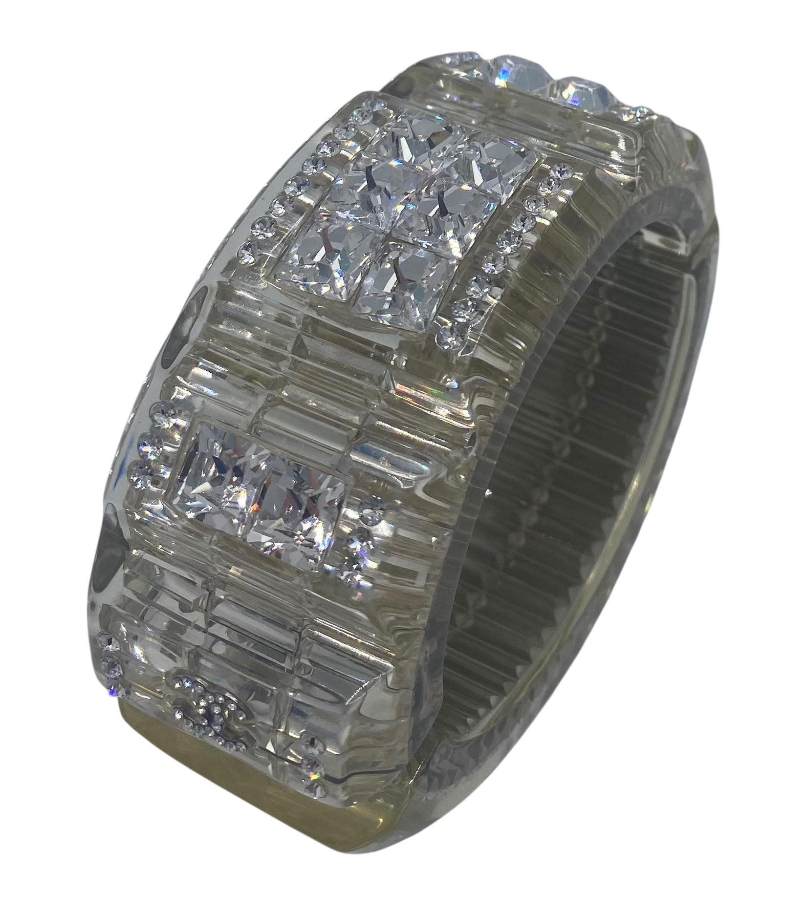 The rectangular crystals are encased in lucite so they cannot be damaged or fall out. Measures 3/8" thick, forming a smooth finish that lets the 3 rows of rectangular crystals clearly show below the clear, smooth-to-the-touch surface. There are also so many faceted round crystals of various sizes all over the place. It's a real SHOW STOPPER! 2 Crystal CC Logos at each front side of the bracelet.