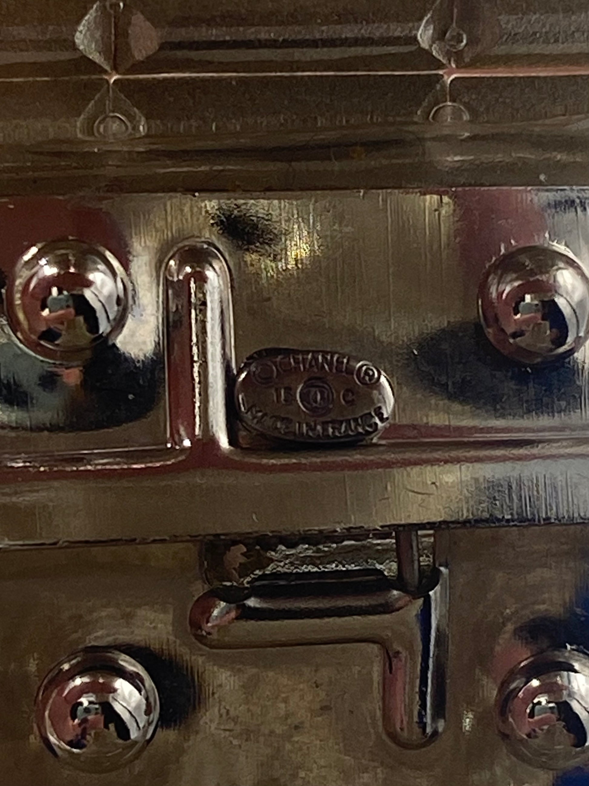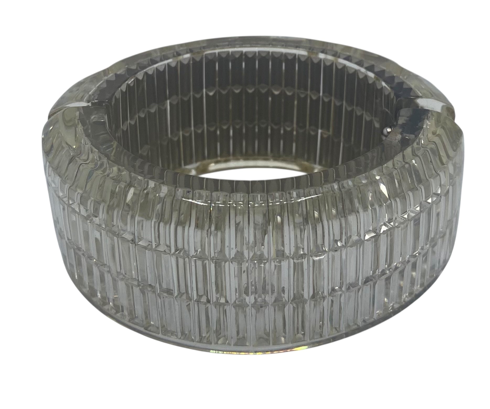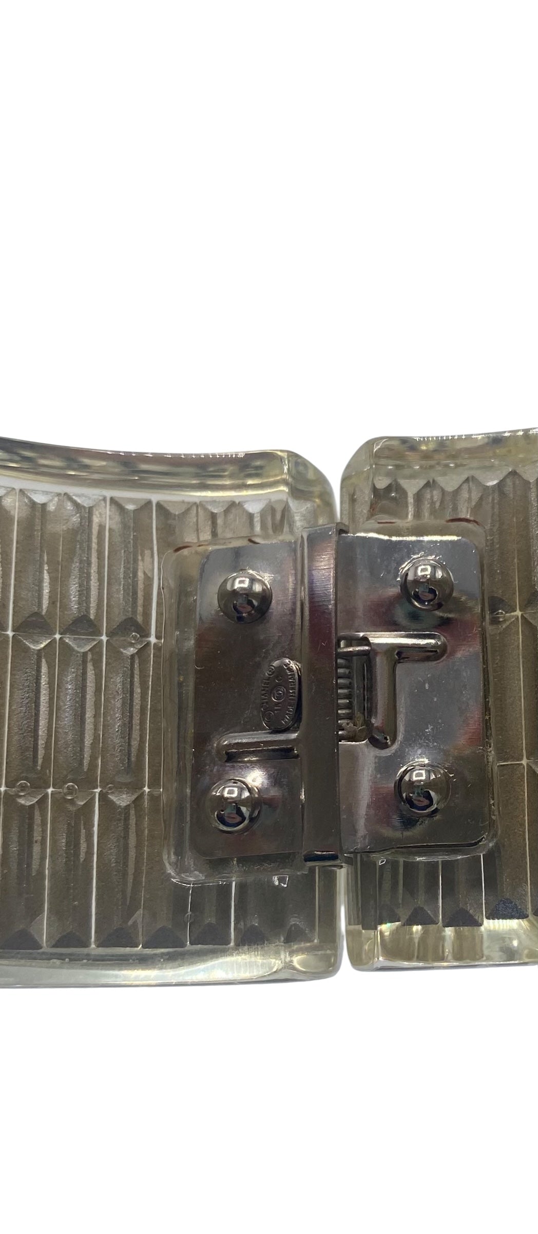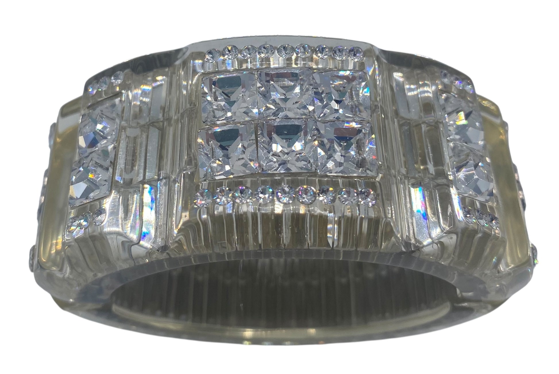 The rectangular crystals are encased in lucite so they cannot be damaged or fall out. Measures 3/8" thick, forming a smooth finish that lets the 3 rows of rectangular crystals clearly show below the clear, smooth-to-the-touch surface. There are also so many faceted round crystals of various sizes all over the place. It's a real SHOW STOPPER! 2 Crystal CC Logos at each front side of the bracelet.