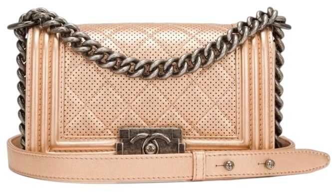 Limited Edition Color in Metallic Rose Gold Calfskin Perforated Leather Small Boy Bag. The bag features an adjustable aged ruthenium chain link shoulder strap with a rose gold leather shoulder pad and a ruthenium Chanel CC press-lock. The flap opens to a matching fabric interior with a patch pocket.