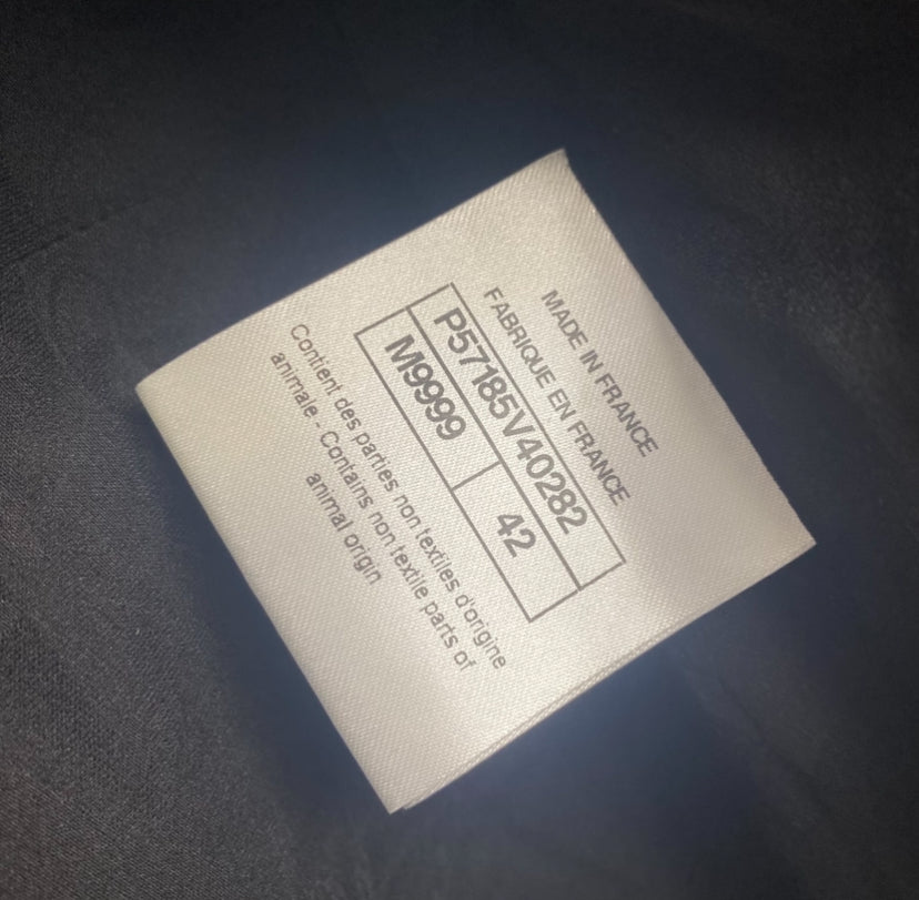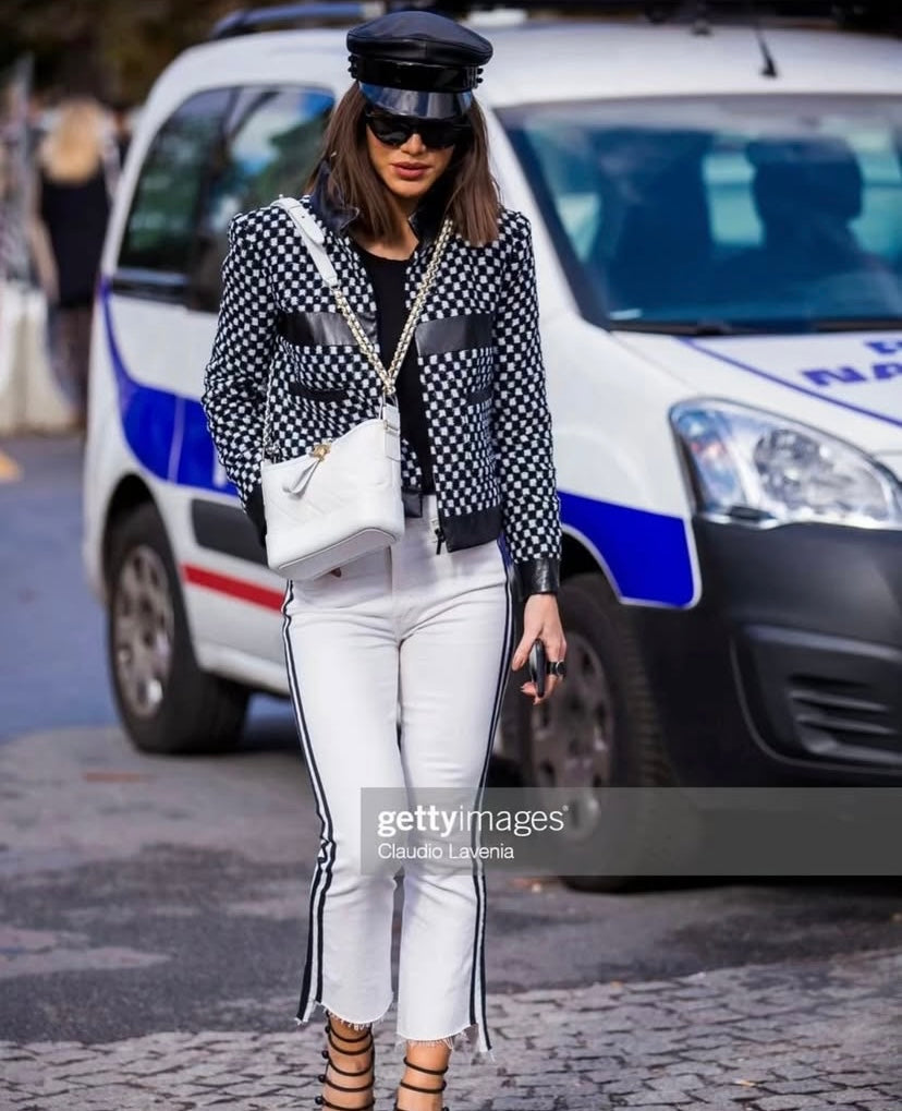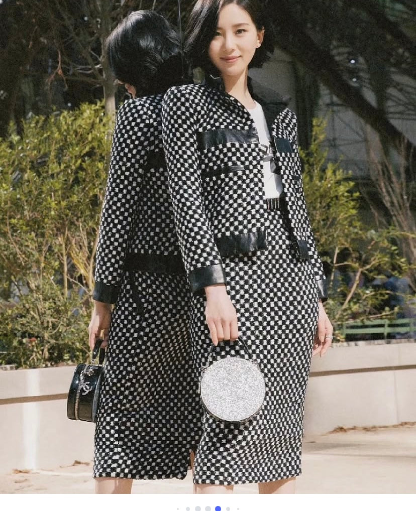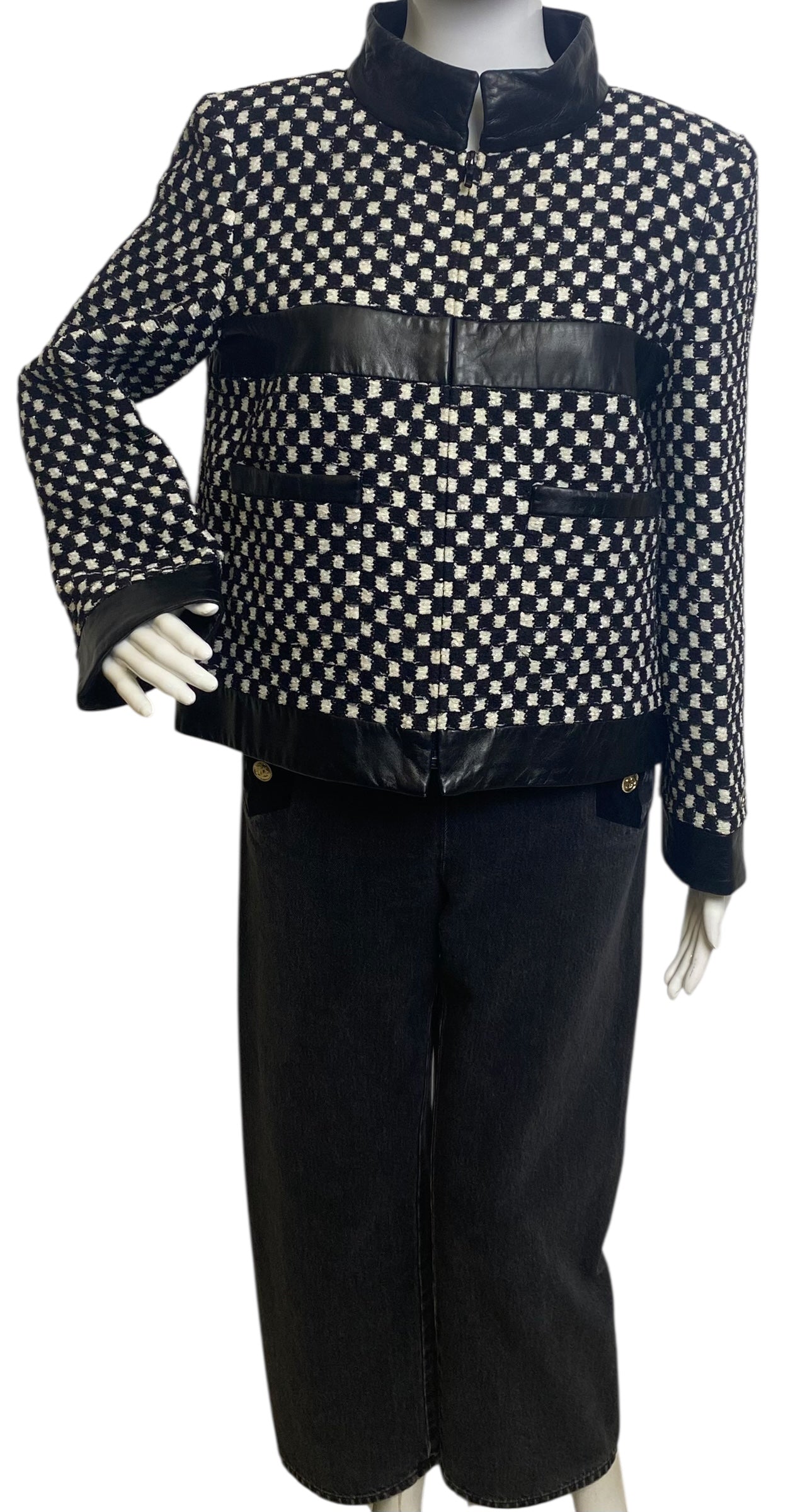 Striking Black & White Checkers with Sequin intertwined so it shines when the light hits. Leather Trim, Stand Collar, Patch Pockets & Zip Closure Interlocking CC Pull & Chain-Link at hem.