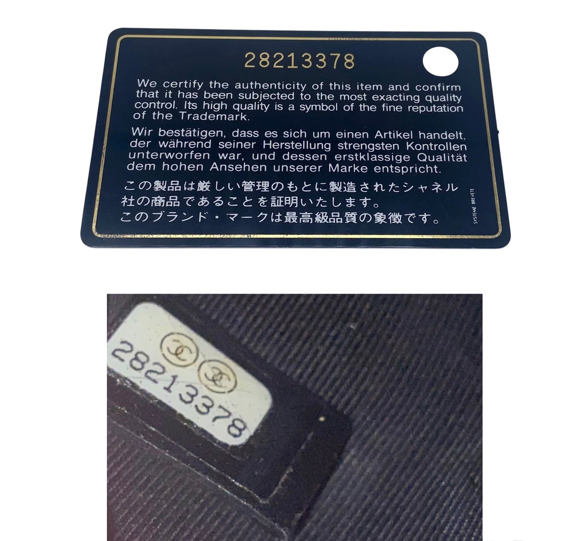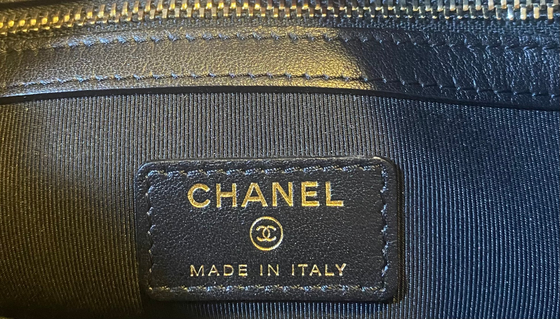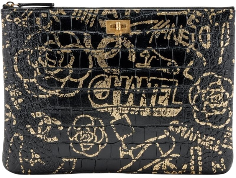 Black crocodile-embossed calfskin leather with a gold Chanel graffiti overlay and a faux mademoiselle turn-lock on the front. The top zipper opens to a black fabric interior with a zipper pocket.