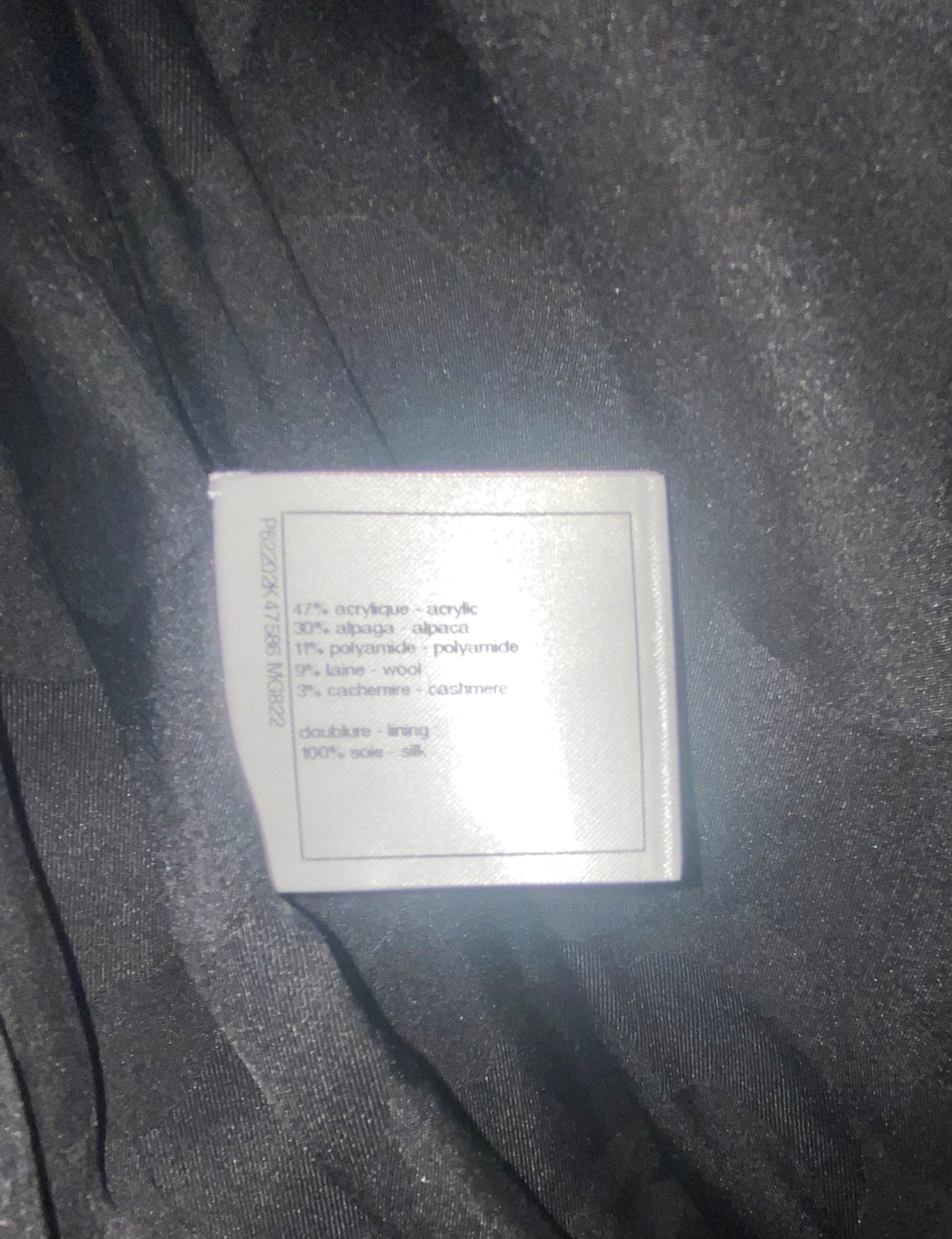 Composition: 47% Acrylic, 30% Alpaca, 11% Polyamide, 9% Wool, 3% Cashmere; Camellia Lining 100% Silk