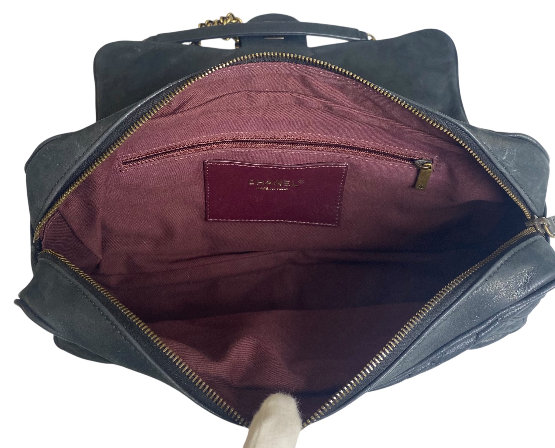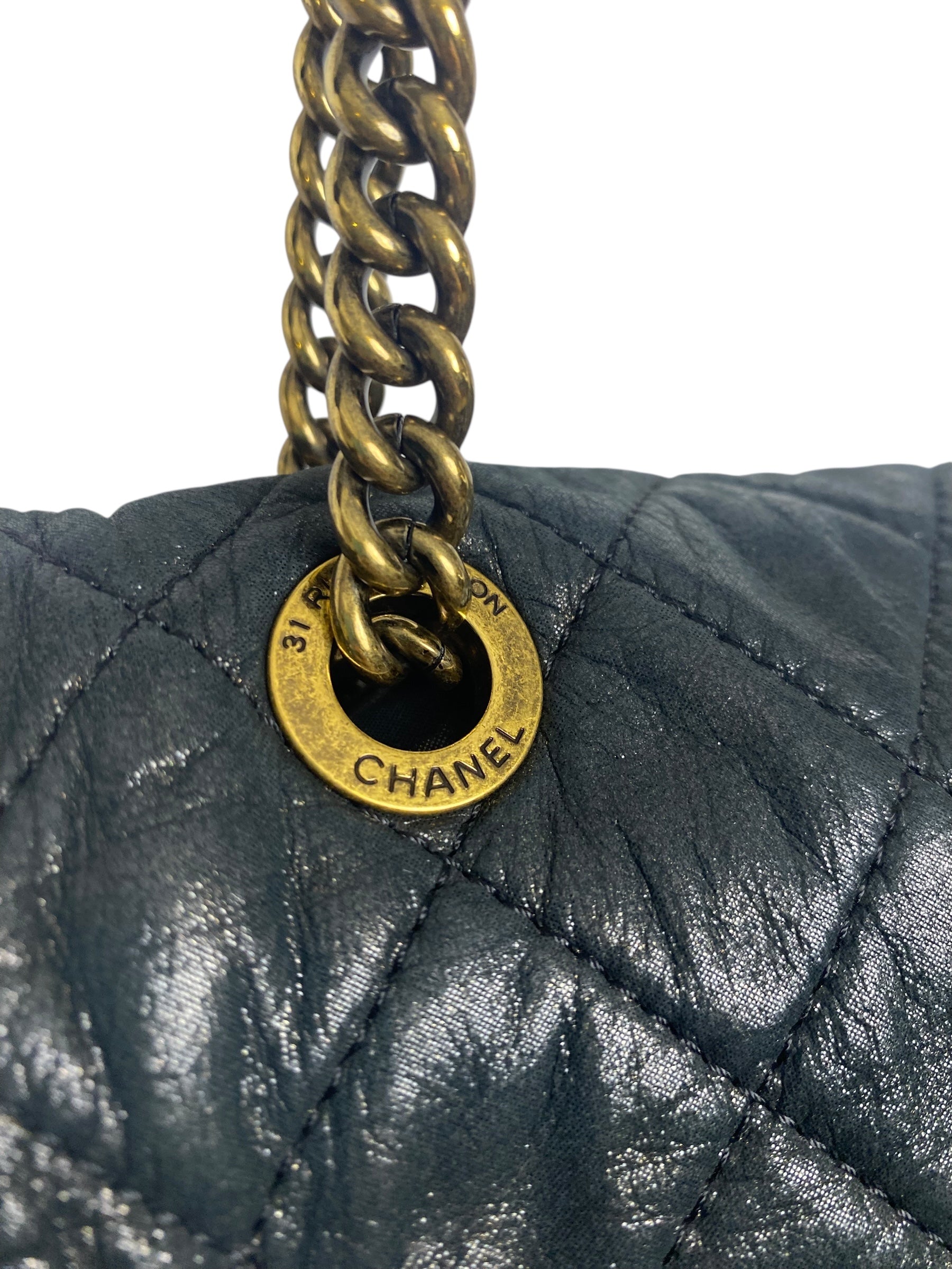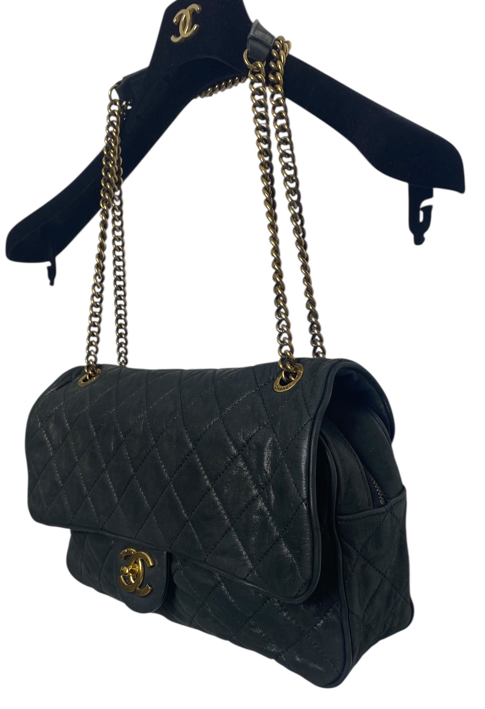 Chanel Shiva Flap Bag in Black Iridescent Quilted Calfskin Leather and Aged Gold hardware. This bag has a flexible piping on the edges allowing it to conform and bend for a daily casual look. Soft and Versatile Everyday Chanel bag with a Large interior pocket that opens with a zipper.