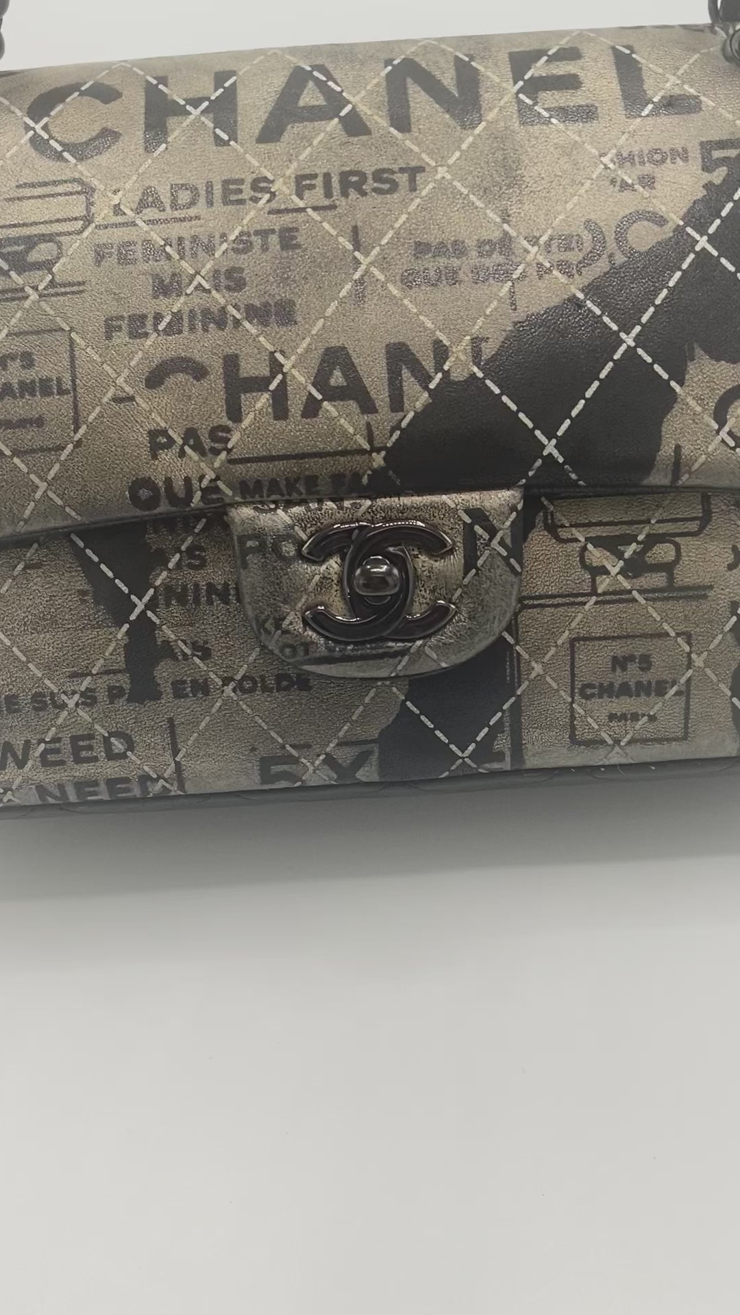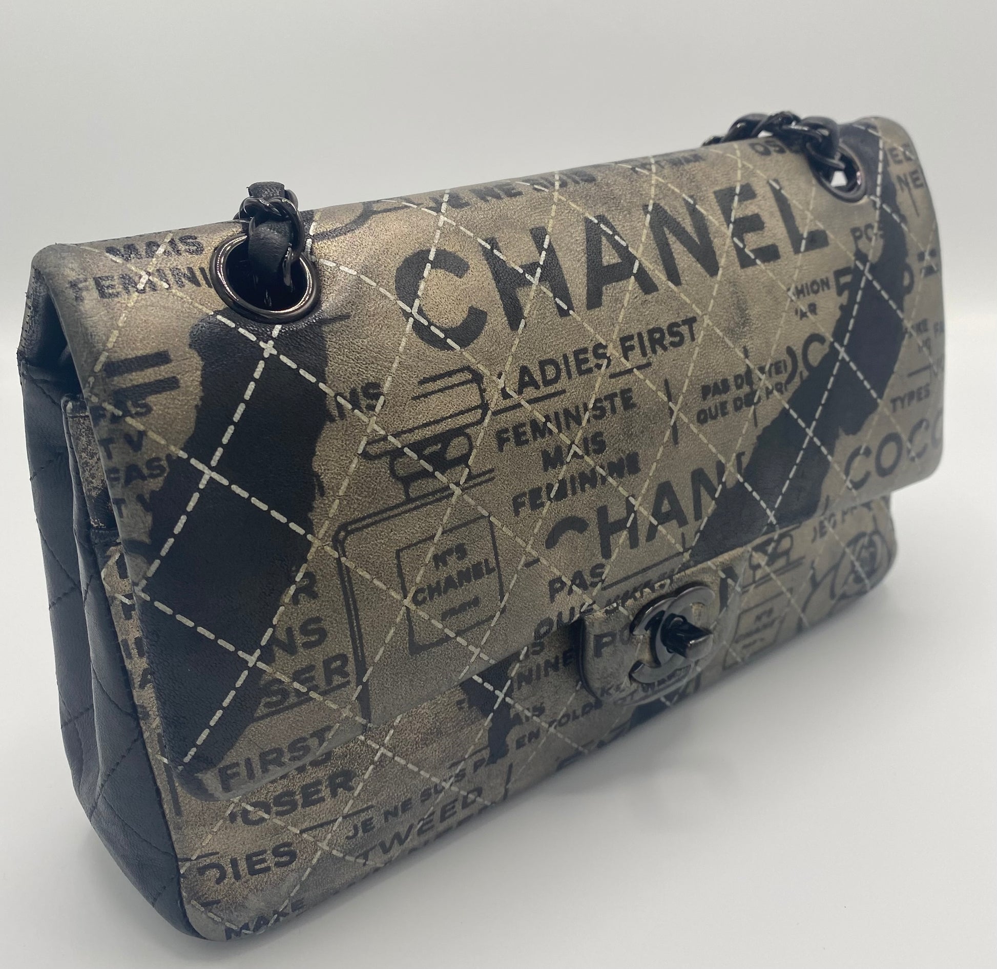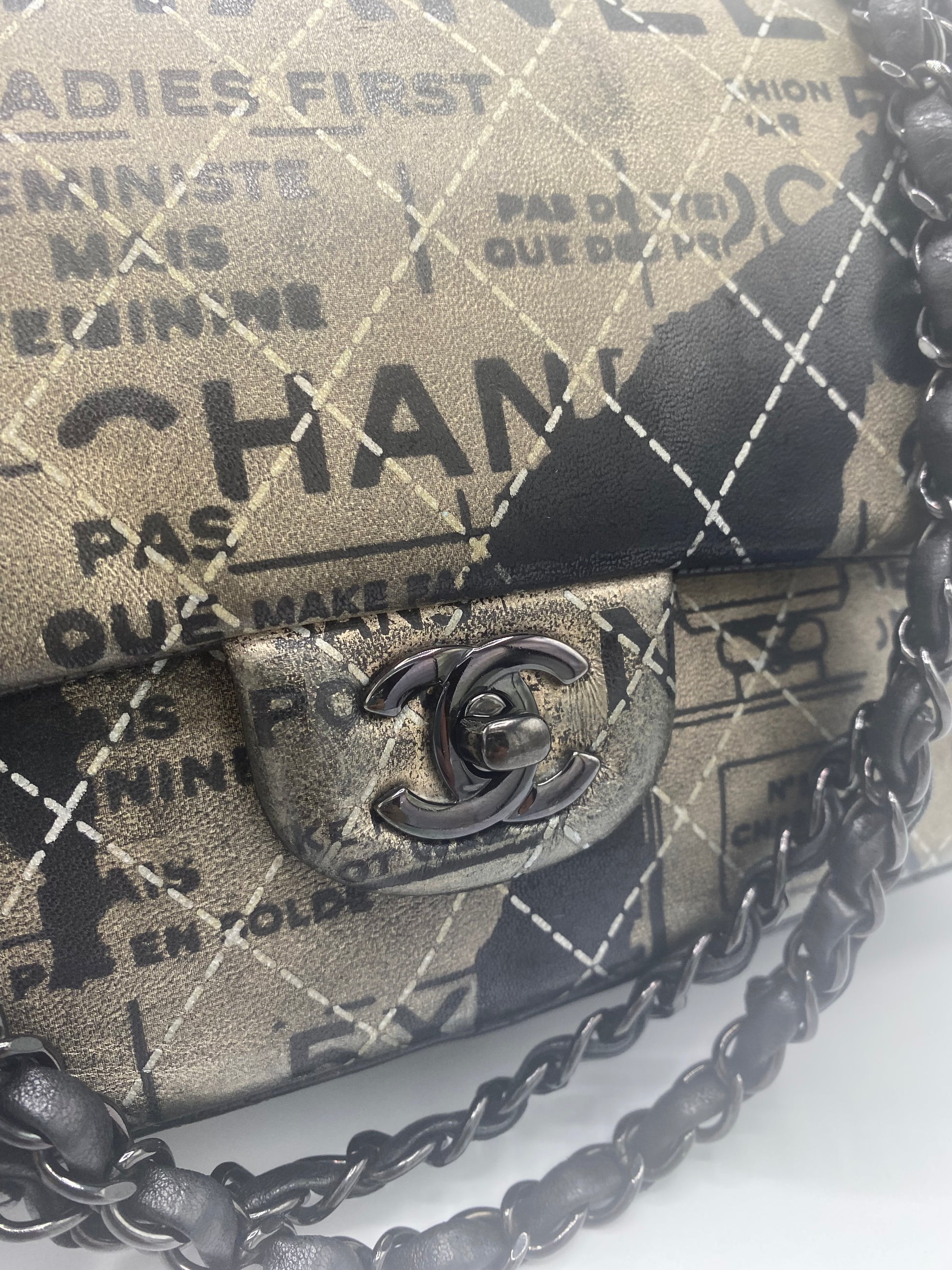 As seen on Giselle Bündchen in Chanel's 2015 Spring Summer campaign is this limited edition graffiti newspaper print medium classic double flap bag. Collectors Item from the Spring Summer 2015 Collection; known as “Feminist but Feminine” and “Ladies First”.