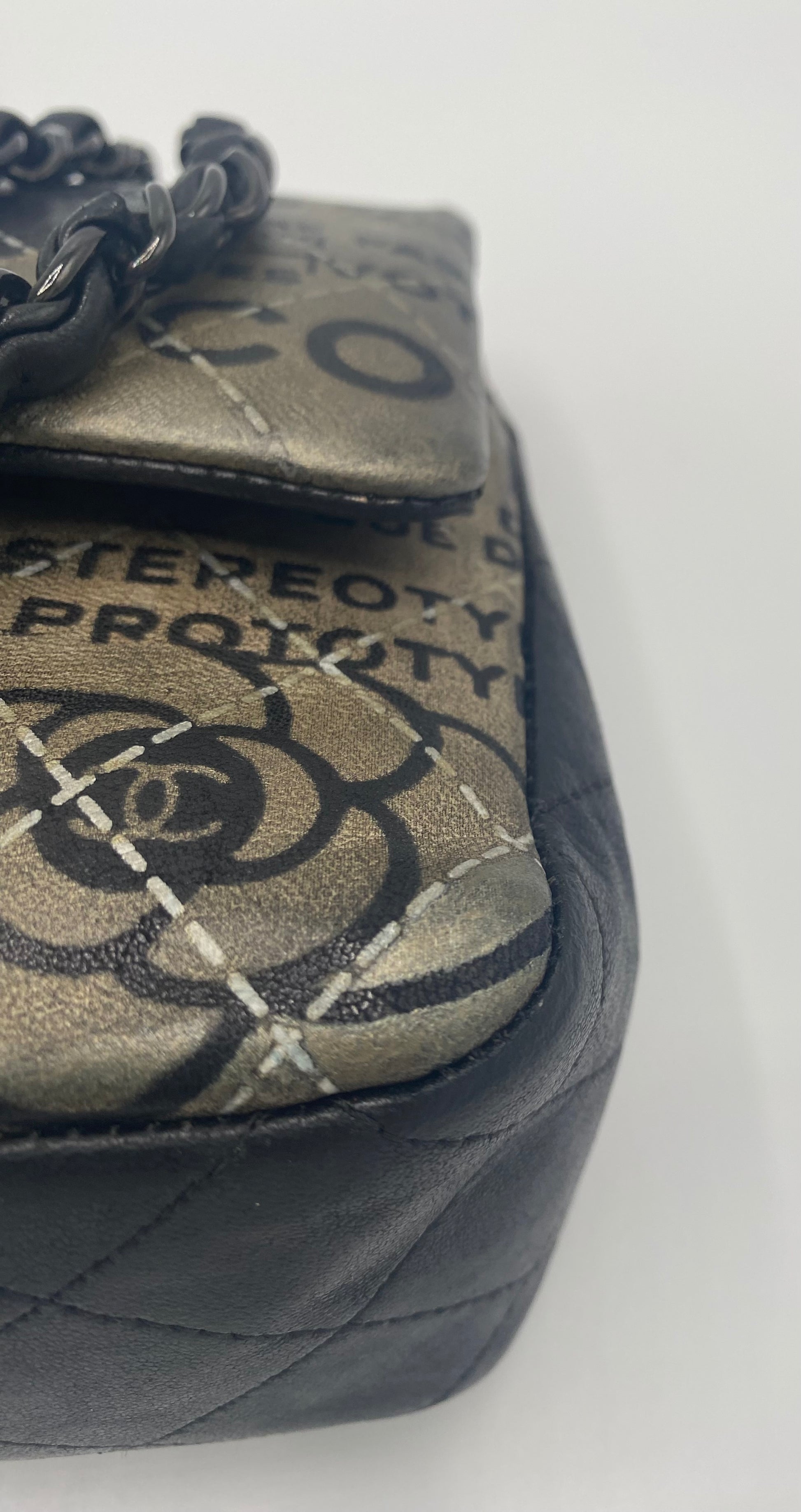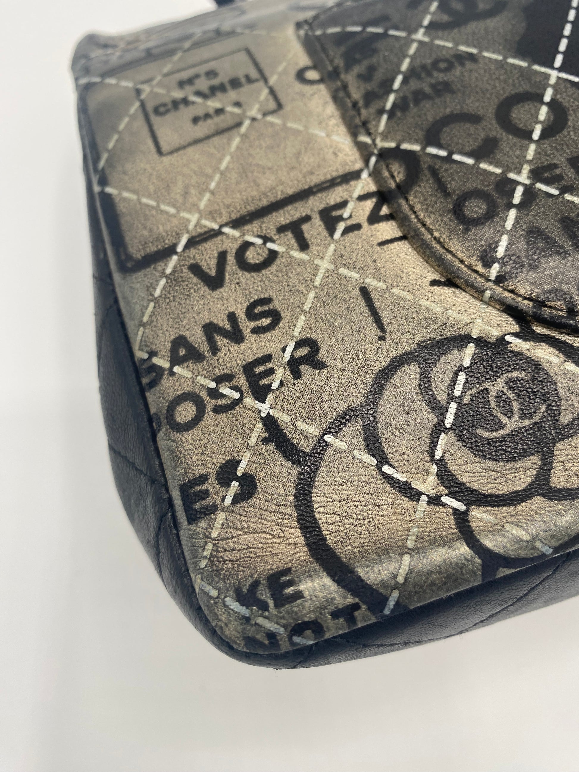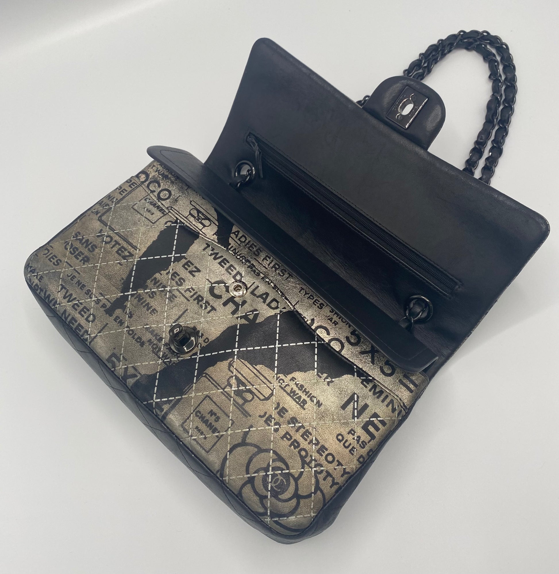 As seen on Giselle Bündchen in Chanel's 2015 Spring Summer campaign is this limited edition graffiti newspaper print medium classic double flap bag. Collectors Item from the Spring Summer 2015 Collection; known as “Feminist but Feminine” and “Ladies First”.