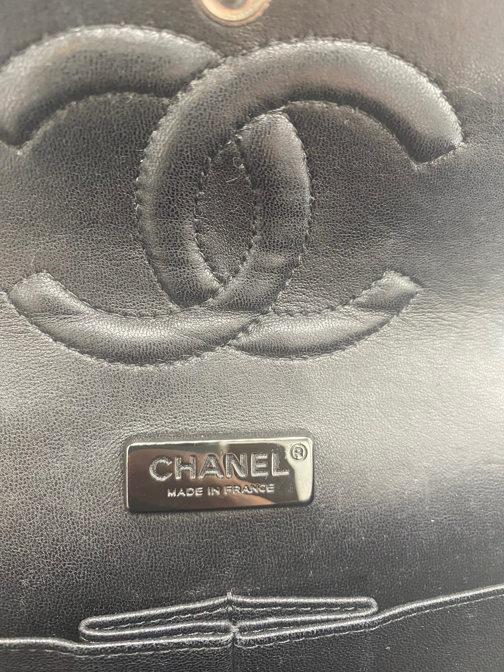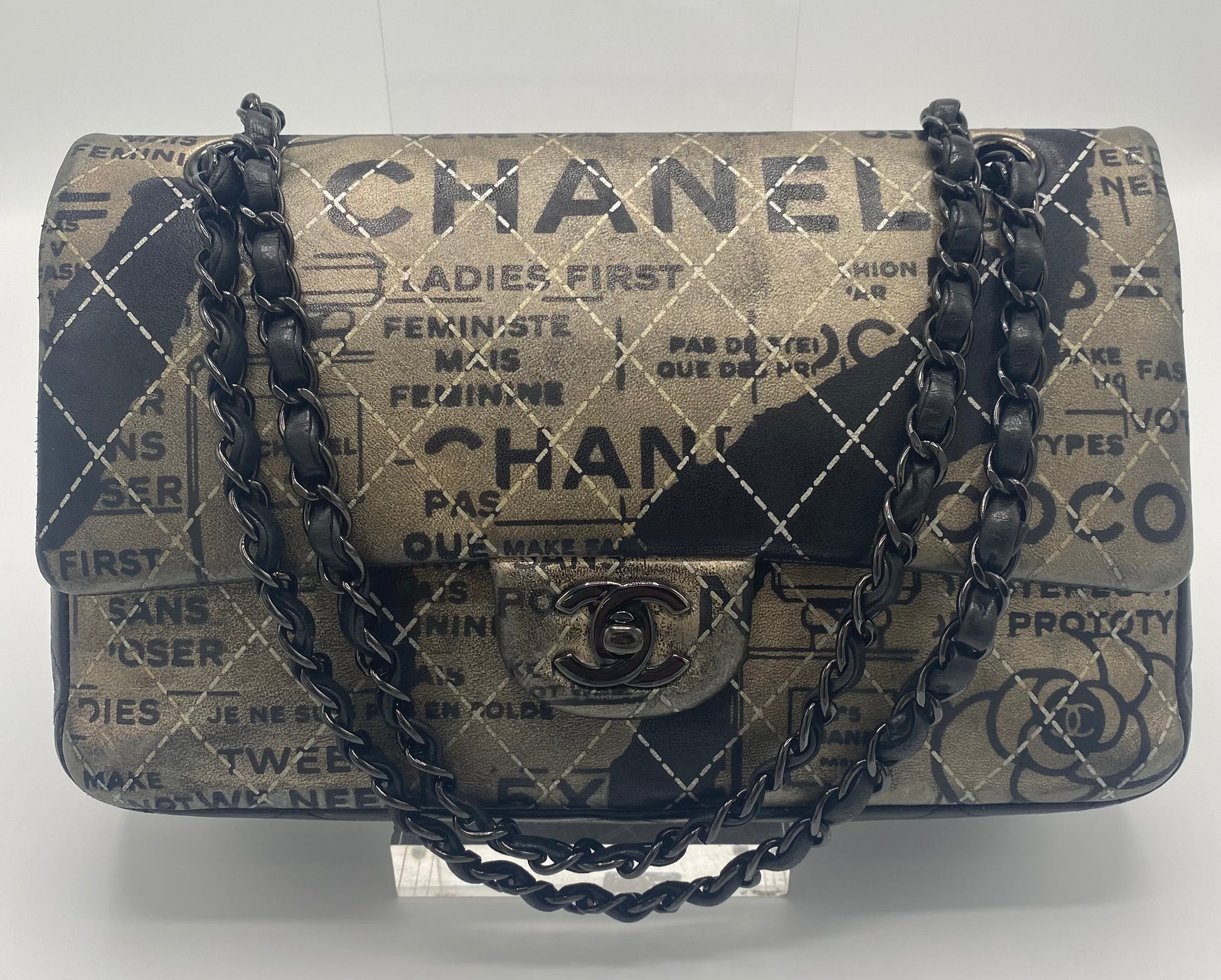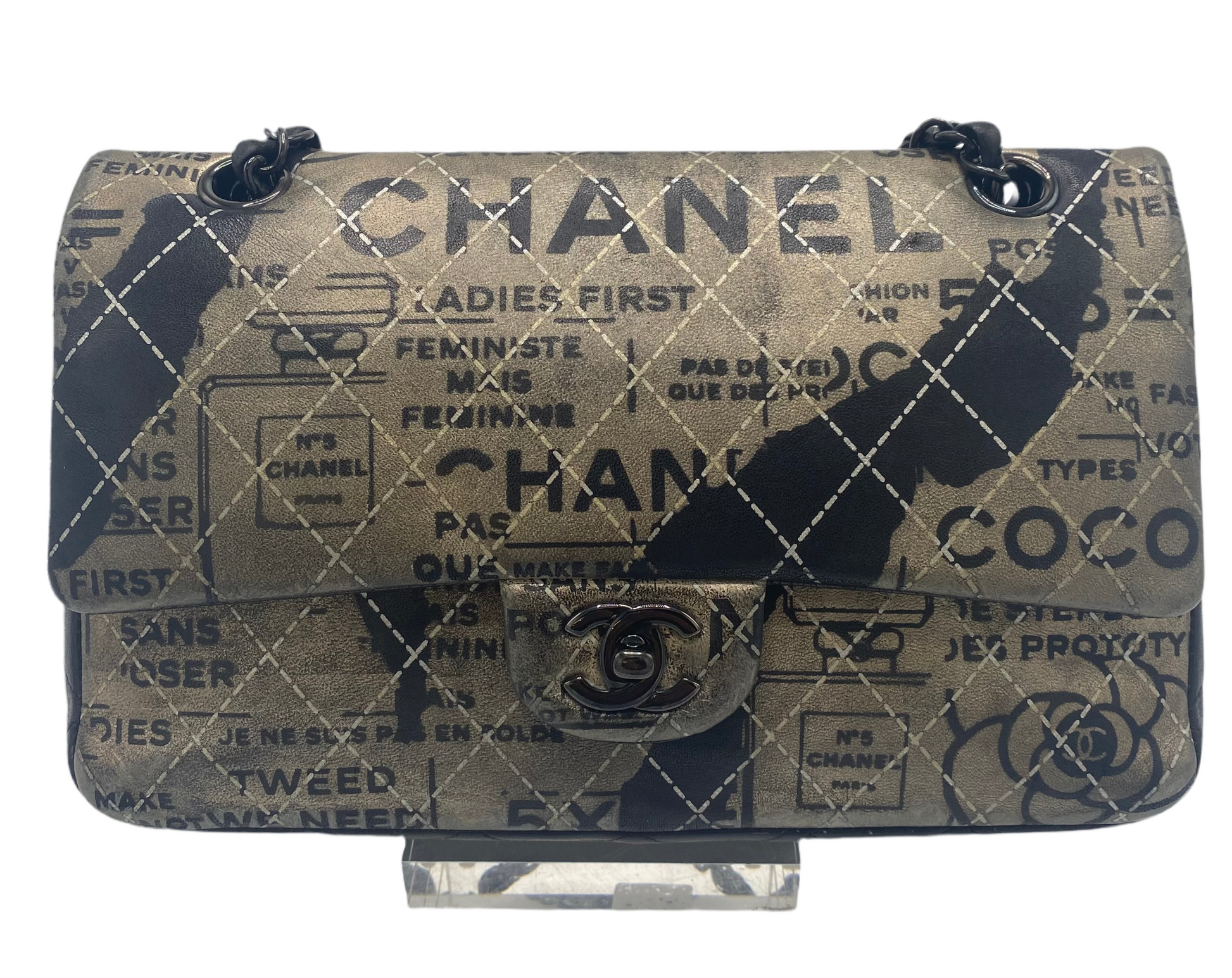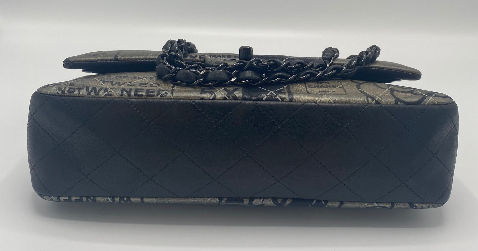 All of the elements of the medium classic double flap 11.12 iconic bag, but with the special touches of the hand painted graffiti print exterior in various hues of Bronze, Silver, and Gold, with So Black Hardware. No two of these bags are exactly the same.