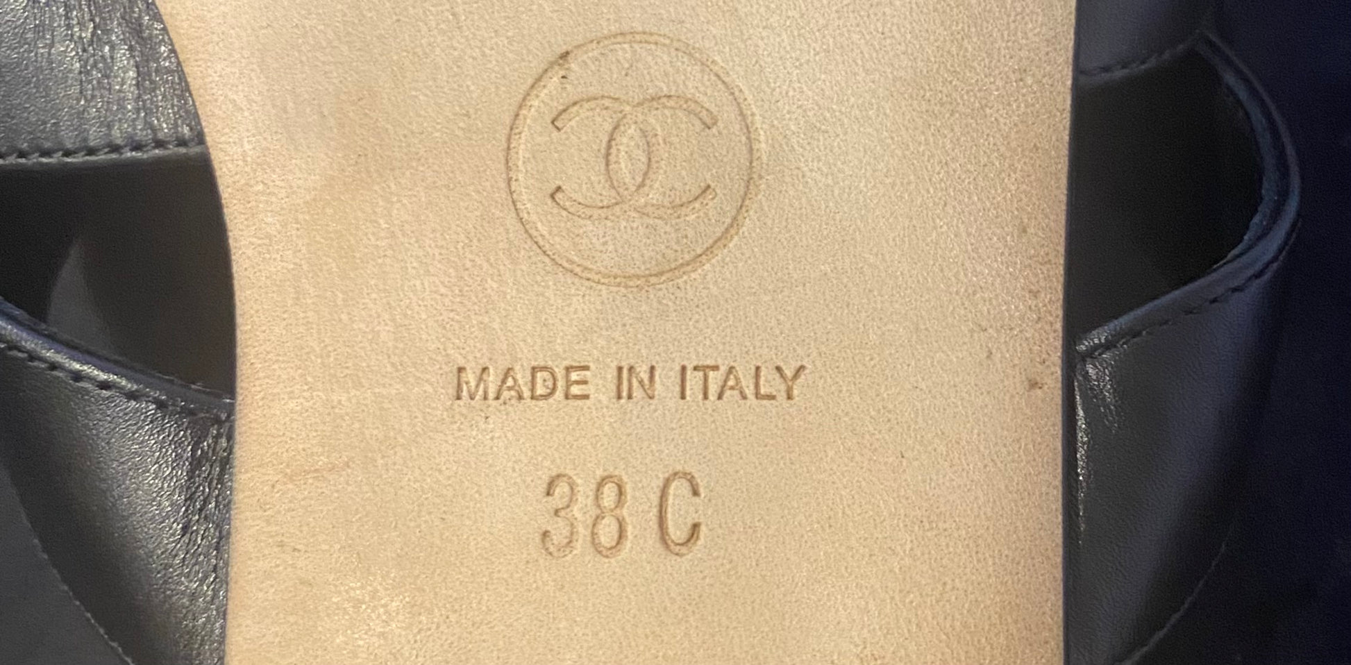 These stylish sandals are crafted of calfskin leather in black. They feature a small heel and wide leather crossover straps that have mock silver CC turn locks. These are excellent slip on sandals, with a distinctive look!