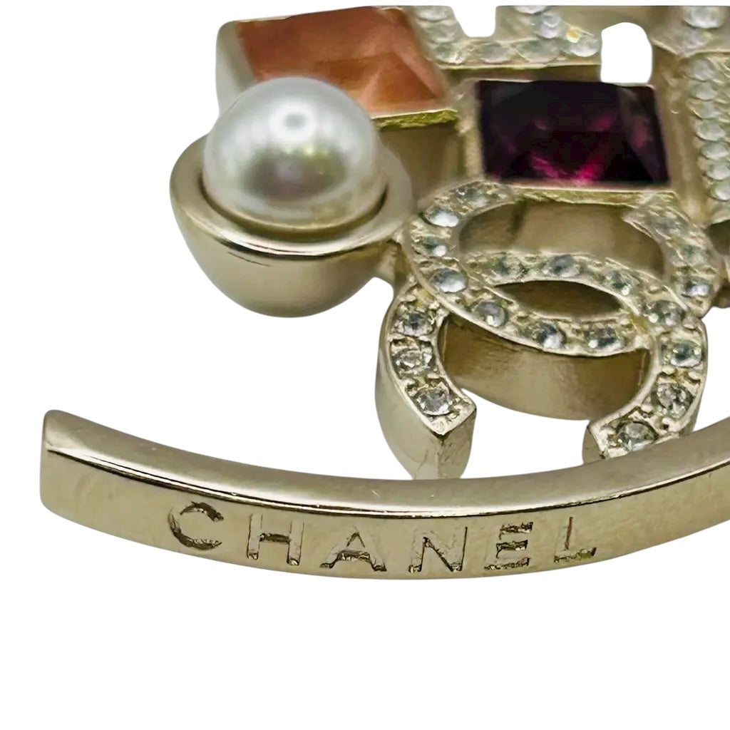 Chanel N 5 gold tone hoop earrings, with red and orange stones, pearls and rhinestones. Timeless bag and CC logo inserts set with crystals and pearls. Engaged Chanel at edge of hoop on each earring.