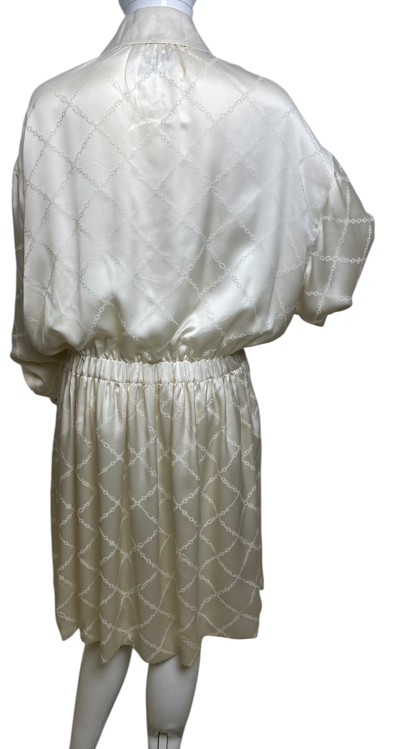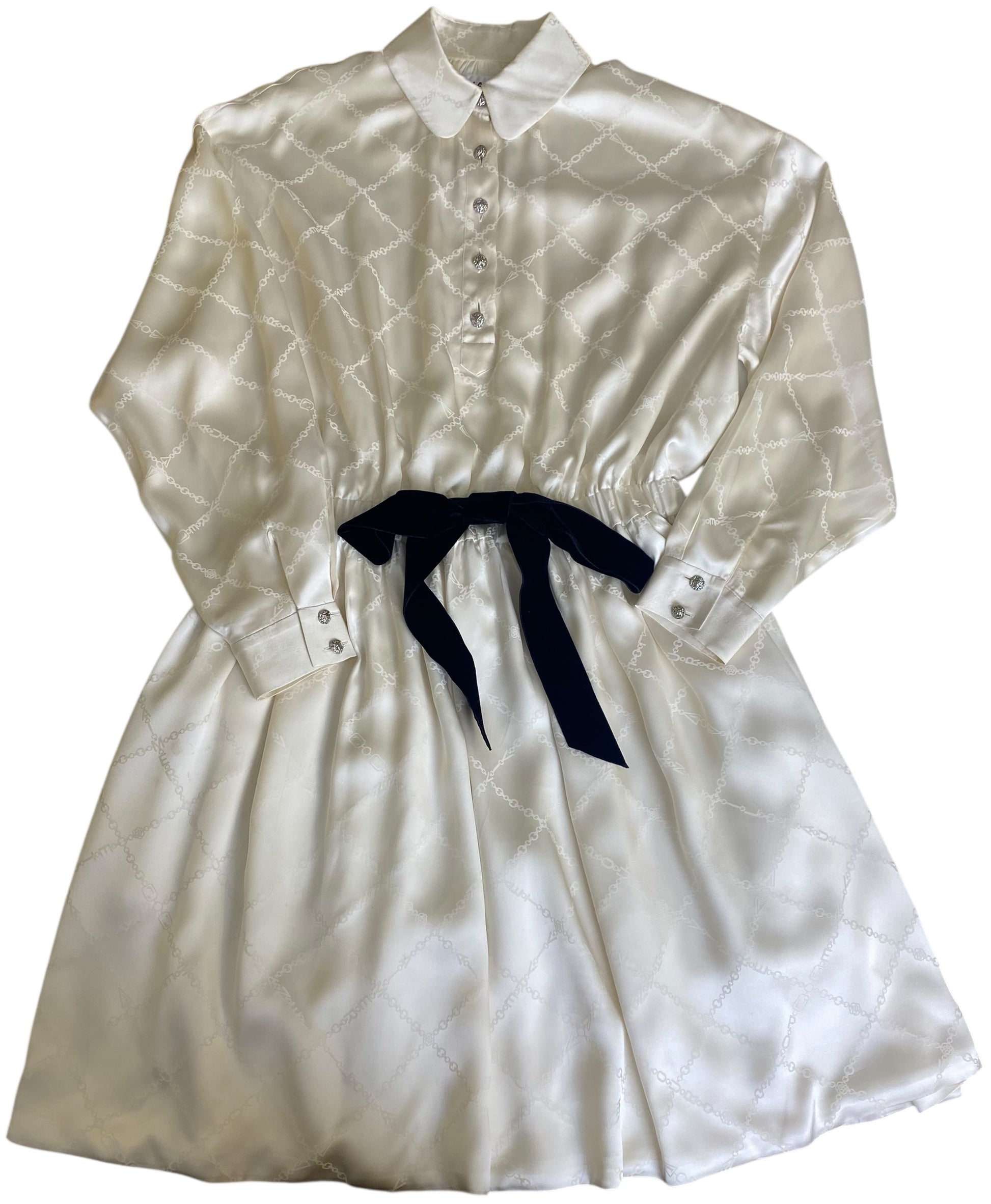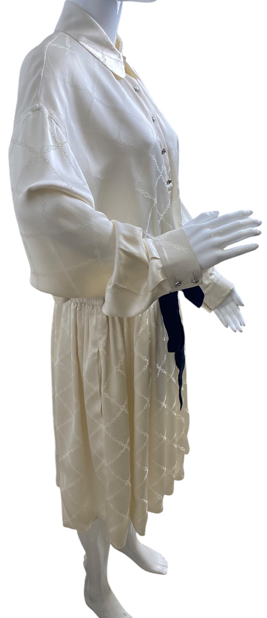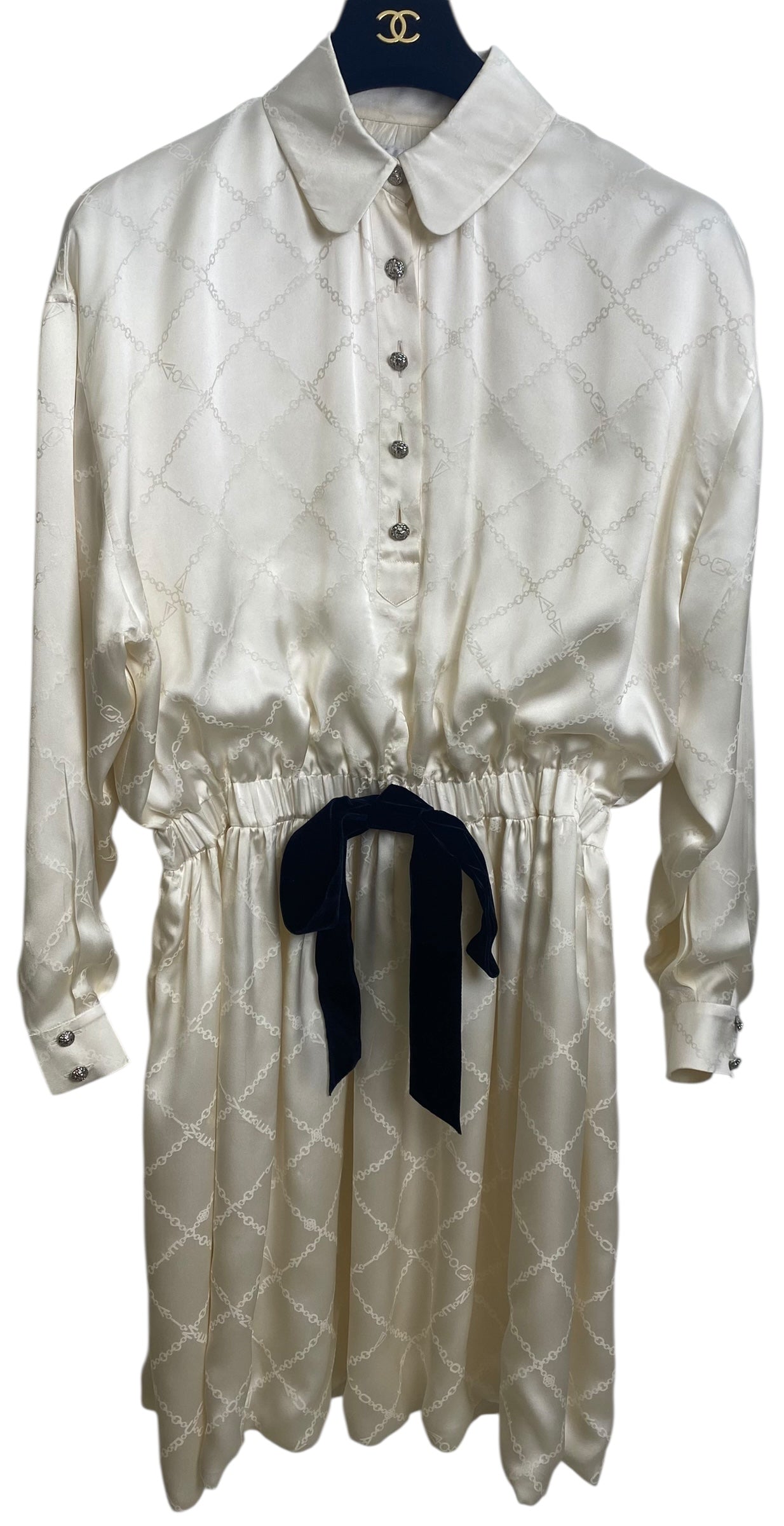 Chanel 22B Ecru Jacquard Silk CC Logo Velvet Bow Blouson Dress FR 40