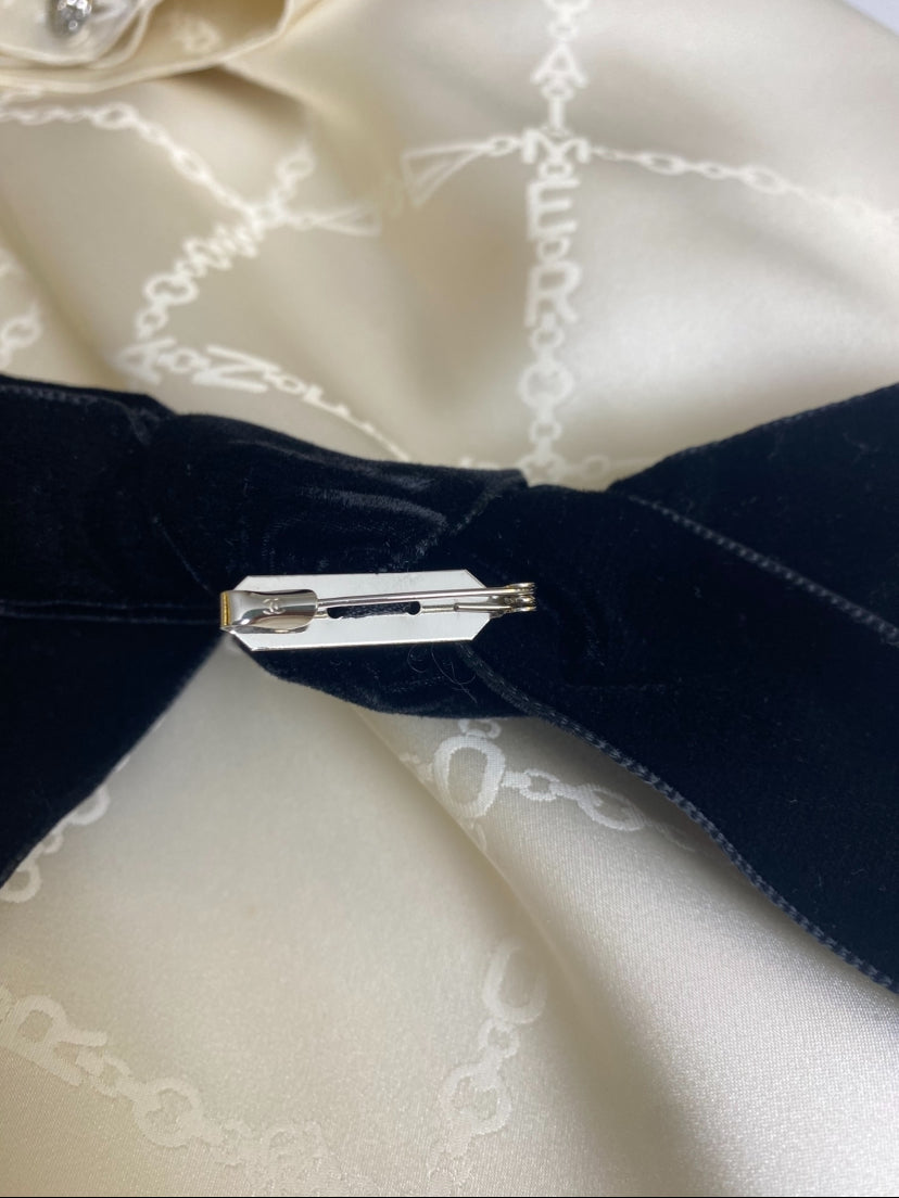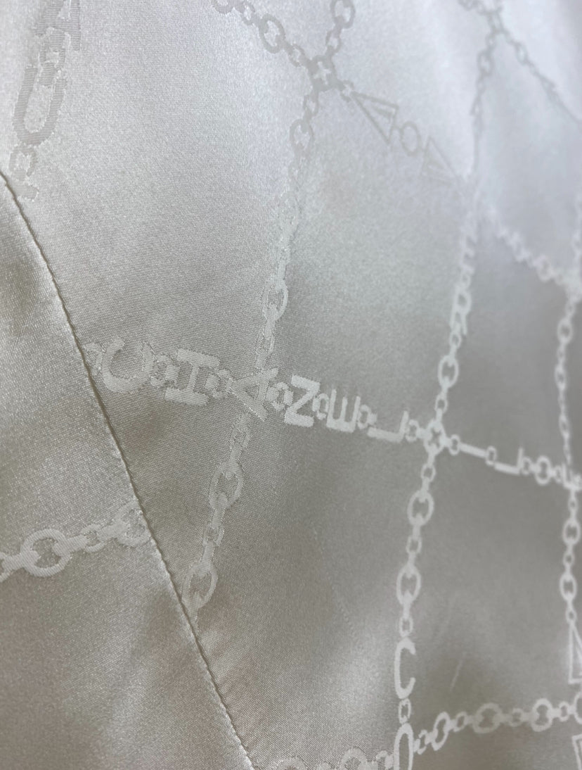 Jacquard Subtle Tonal Print with “Chanel, Pour Amour & Coco”. Removable Velvet Bow that can be worn on the neck or at the waist, or anywhere else! 9 metal Lions Head Buttons with tiny CC’s, 7 down the front and 2 on each sleeve. Elastic Blouson Waist, 2 Side Pockets, Can be worn as a Dress or Tunic.