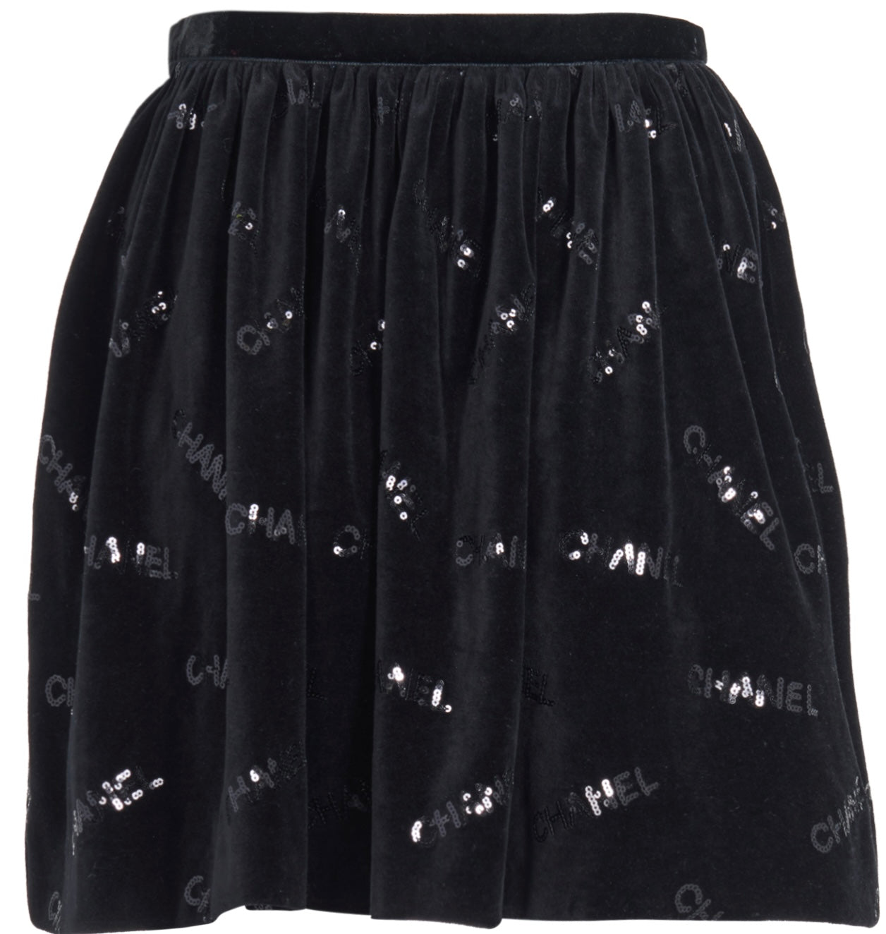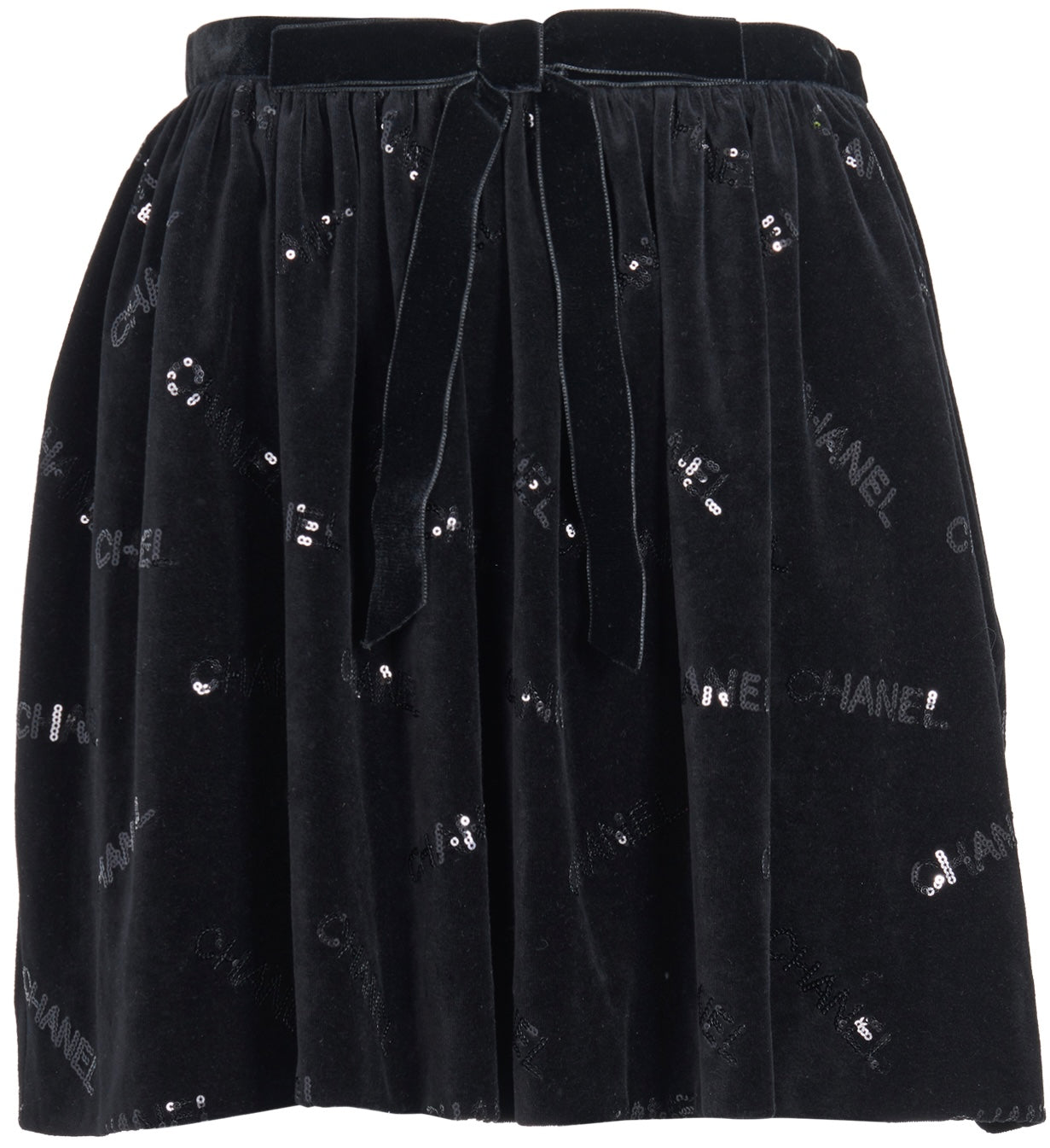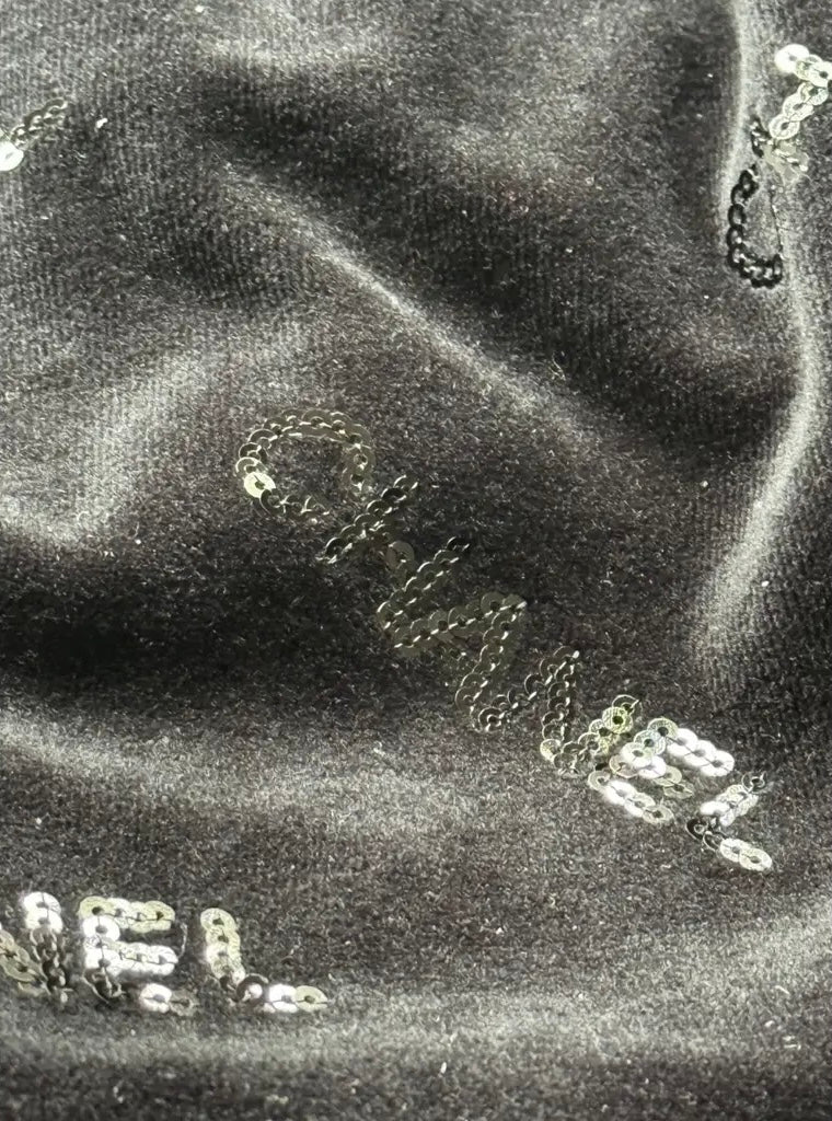CHANEL BLACK VELVET CHANEL LOGO SKIRT with SEQUIN "CHANEL" logos throughout. Velvet bow at front and zip closure at back. The skirt is amazing, Very versatile and super comfortable!! Has some nice stretch as well.