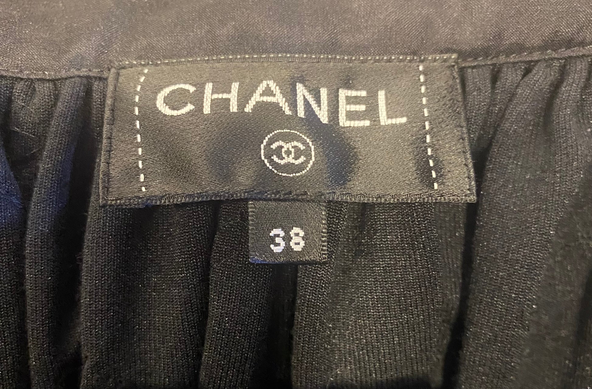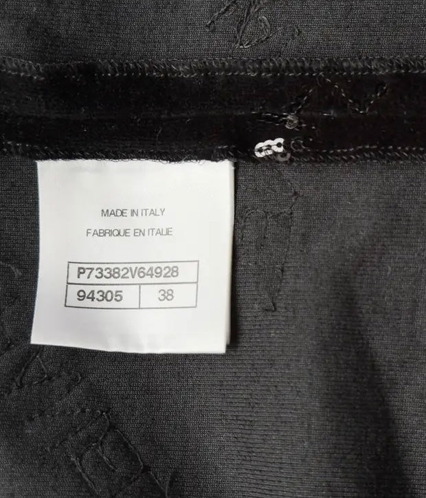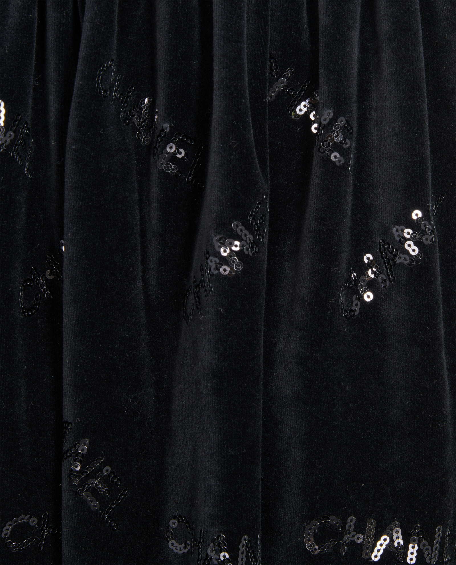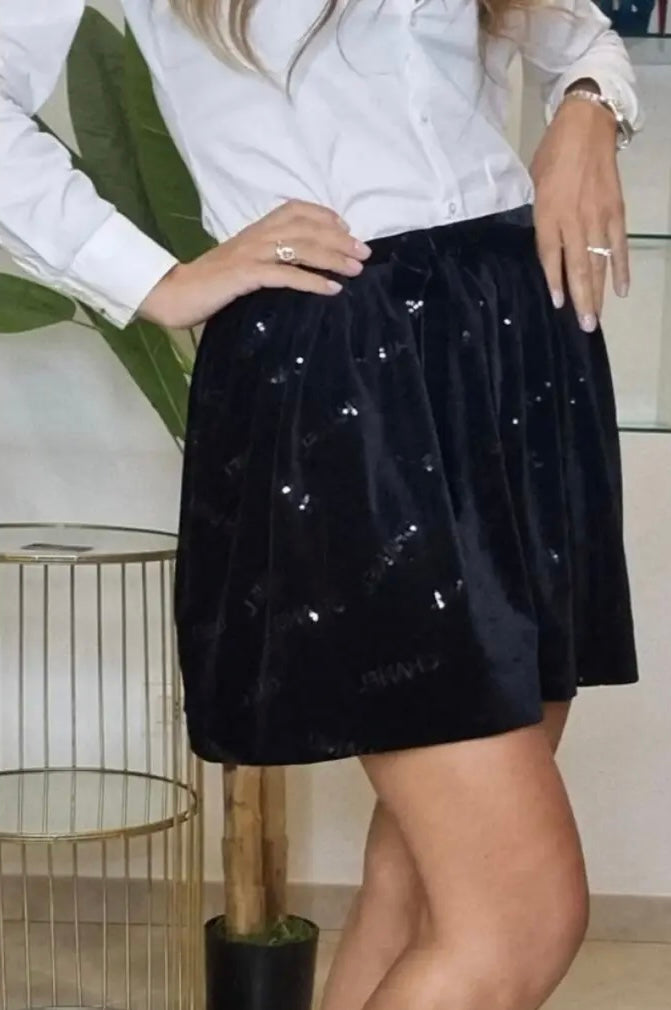 CHANEL BLACK VELVET CHANEL LOGO SKIRT with SEQUIN "CHANEL" logos throughout. Velvet bow at front and zip closure at back. The skirt is amazing, Very versatile and super comfortable!! Has some nice stretch as well.