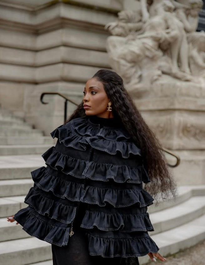 Exquisite Black Denim Ruffle Cape! Heavy Weighted Draped Cape with 3 Gorgeous Glass Stone and Crystal Buttons down the front. Slits at sides for arm holes. Absolutely Stunning!!!