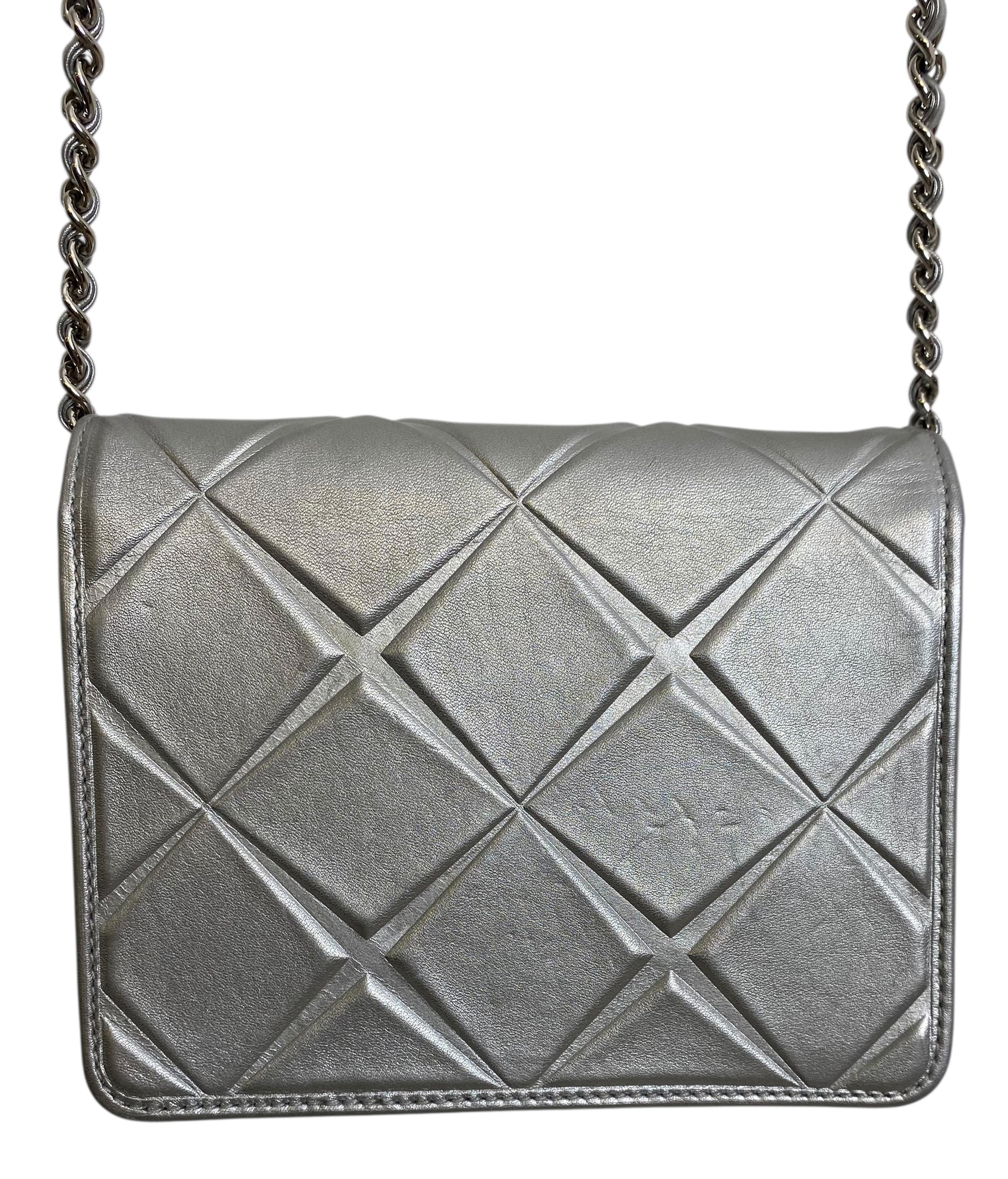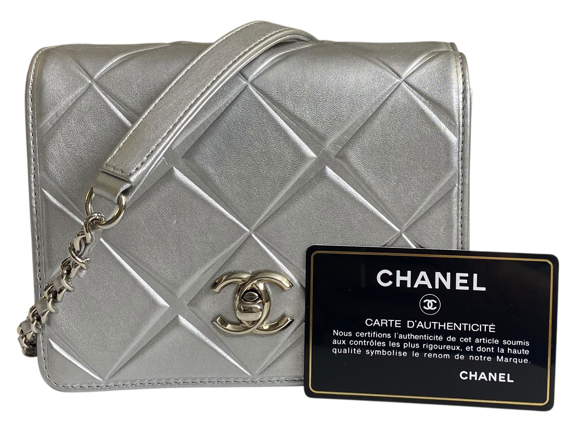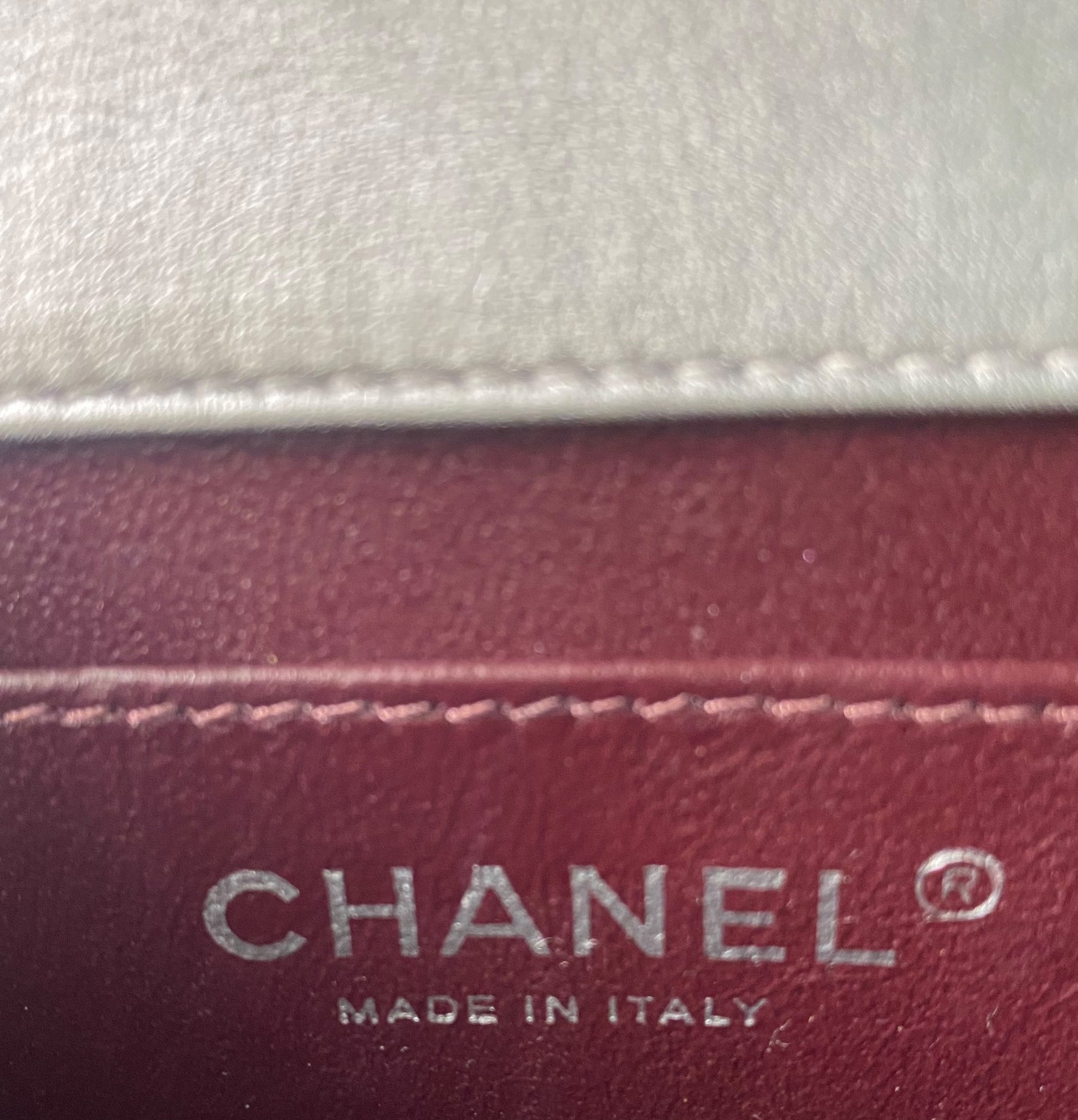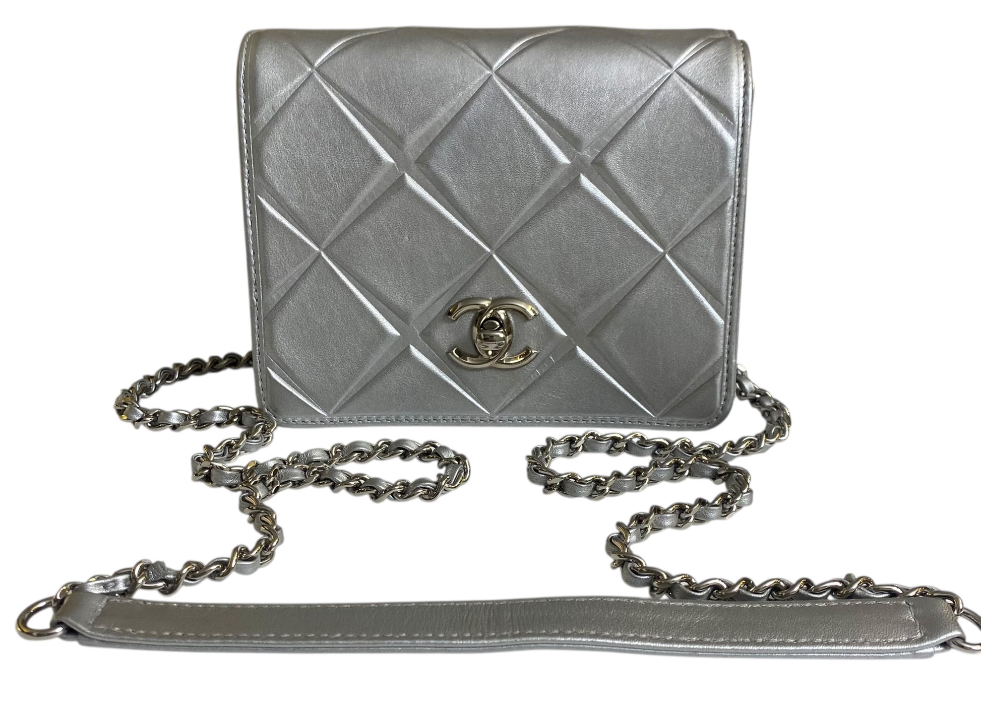 This cute mini shoulder bag is crafted of luxuriously textured diamond-quilted calfskin leather in metallic silver. The bag features leather-threaded silver chain shoulder straps and a facing flap with a silver Chanel CC turn lock. The flap opens to a burgundy leather interior with zipper and patch pockets.