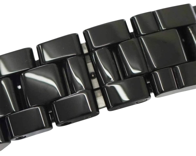 This wristwatch is made from black ceramic and stainless steel, exuding an elegant appeal. It has a uni-directional rotating bezel on the matching black dial, there are shiny ruby hour markers, and a date window between four and five o'clock position. The J12 watch is water-resistant up to an amazing 200 meters. Functional and smart, it follows an automatic movement, with a double deployment clasp.