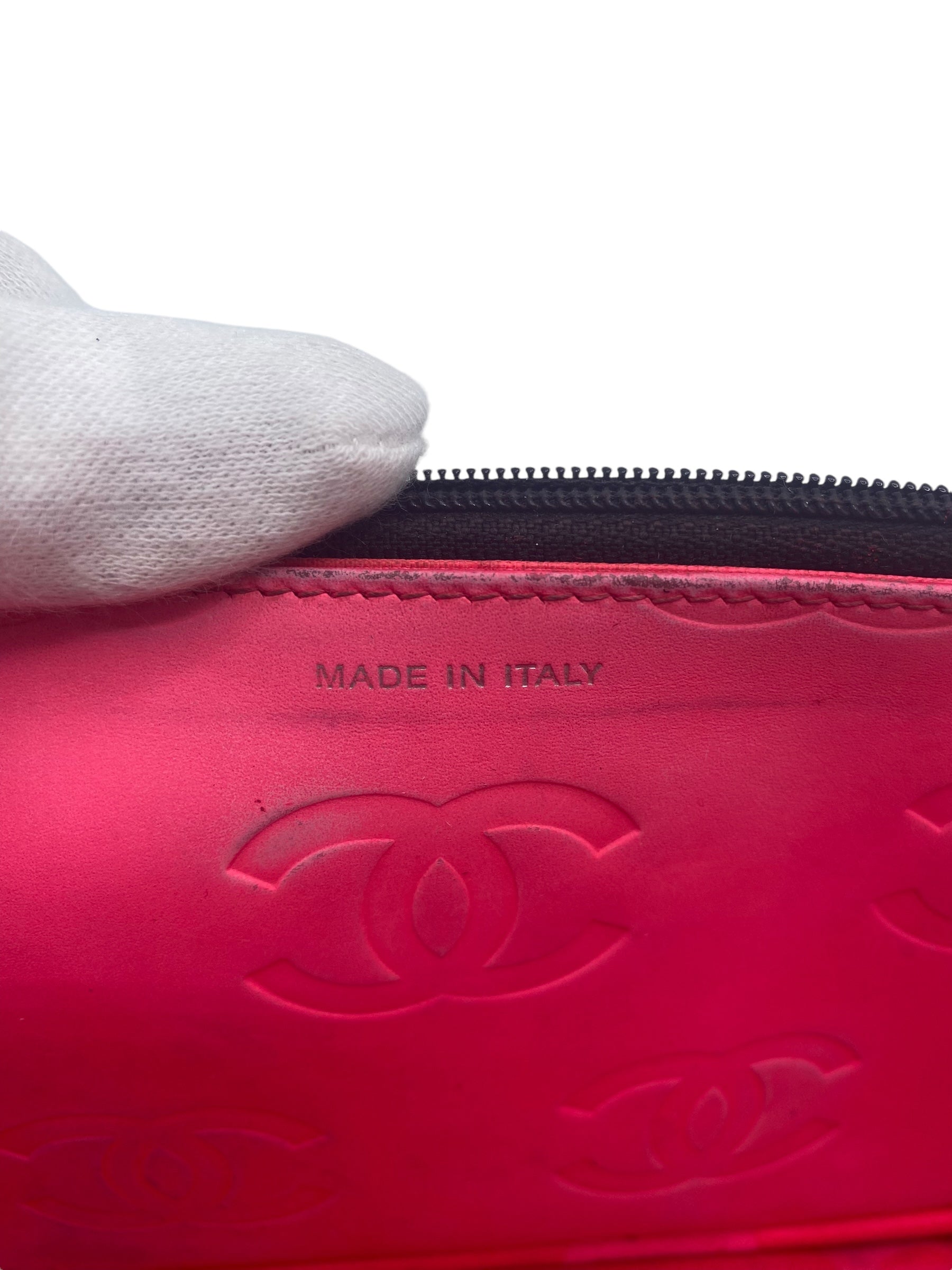 Hot Pink CC embossed interior, with internal pouch, card slots and zipped compartment. Small stains on interior and fading, Black exterior leather has had a color refresh. Beautiful corners. Shiny silver hardware. In overall very good condition.