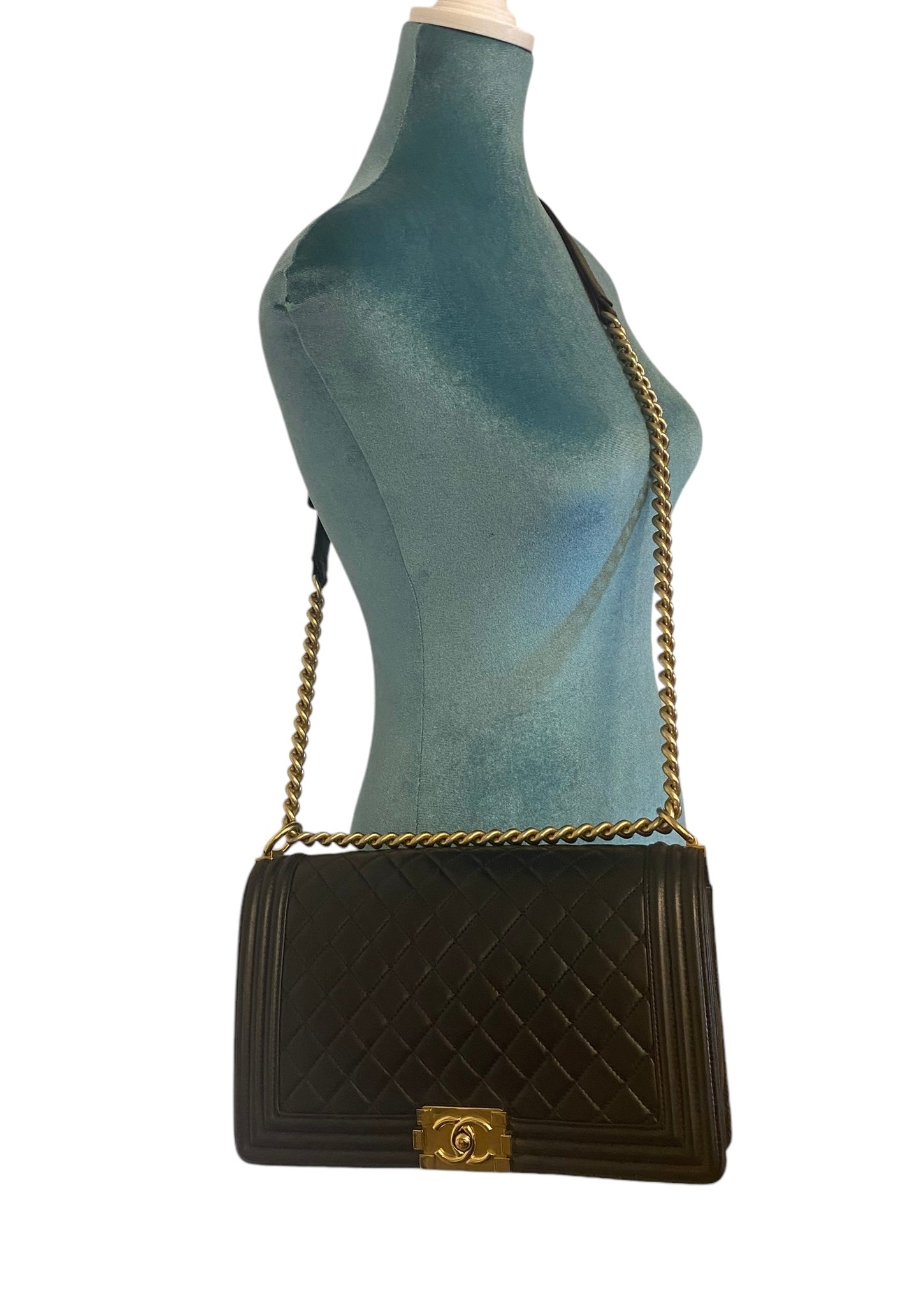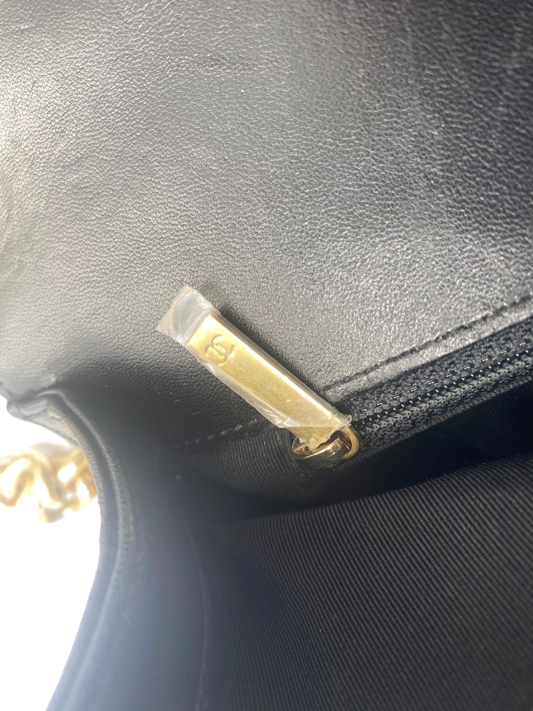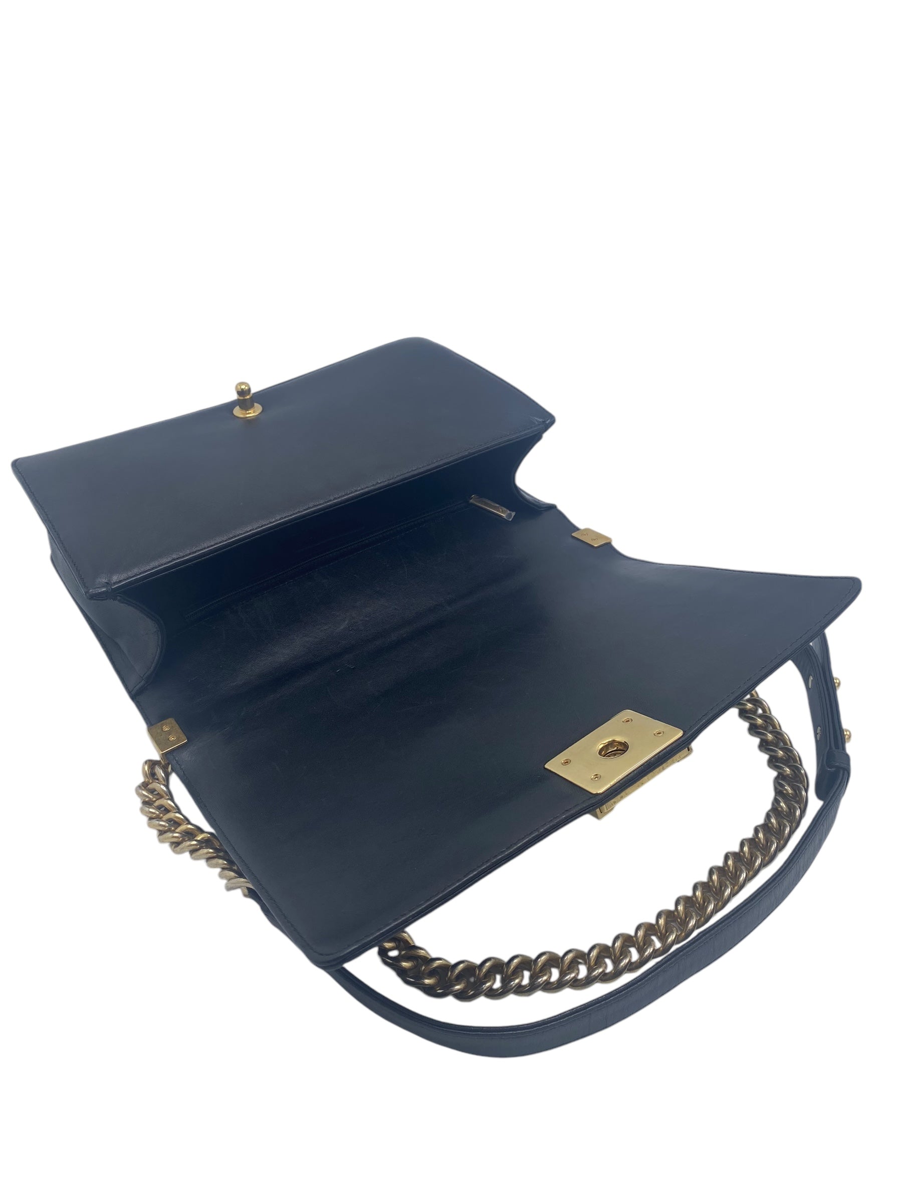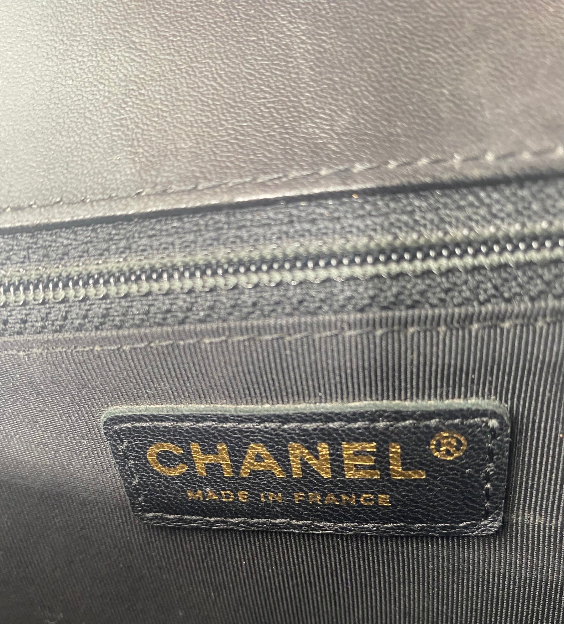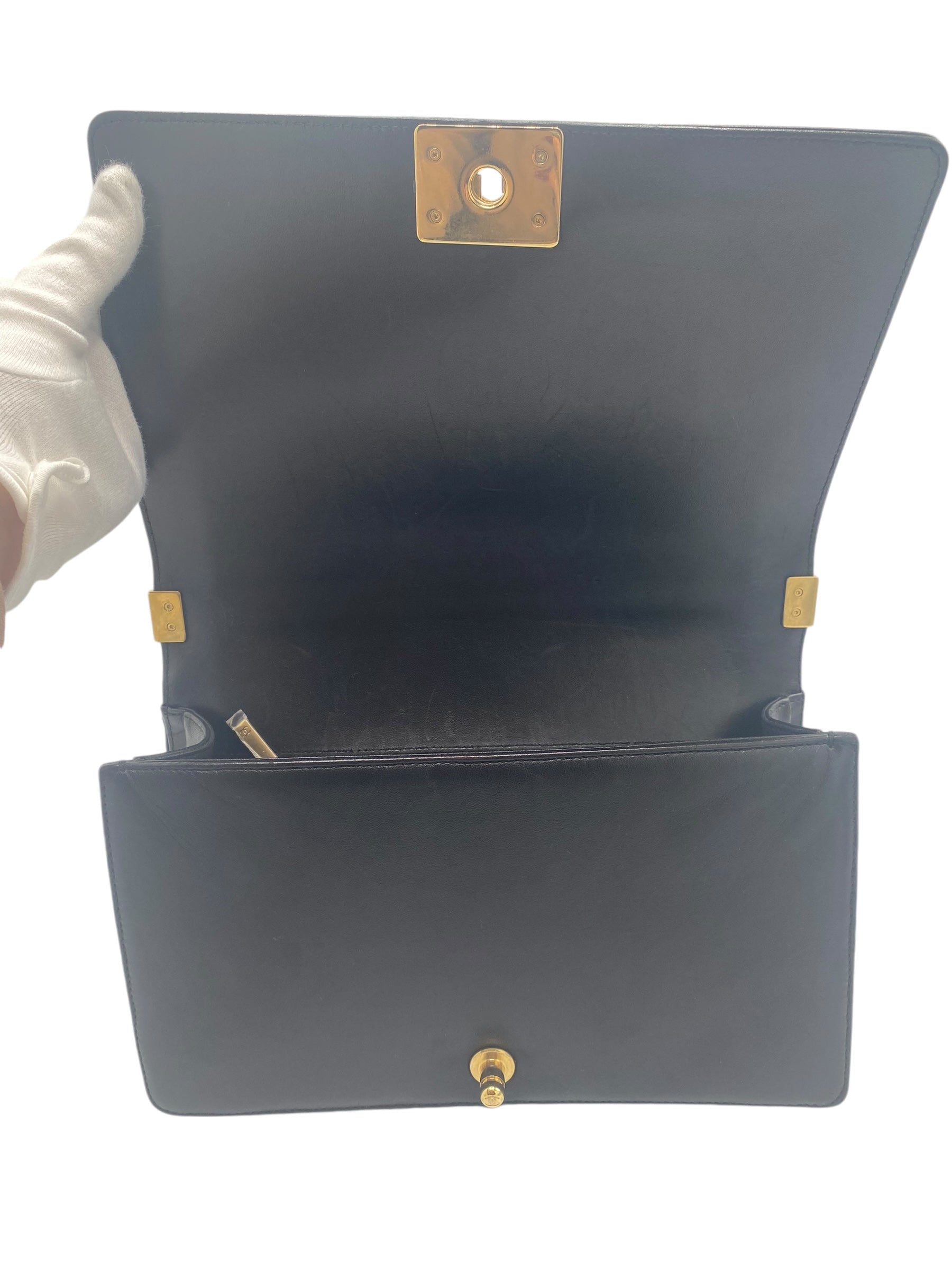 This black gold Chanel Leboy bag in the new medium size. The hardware is a beautiful gold! Clean black grosgrain lined interior with zipped and slip pocket.
