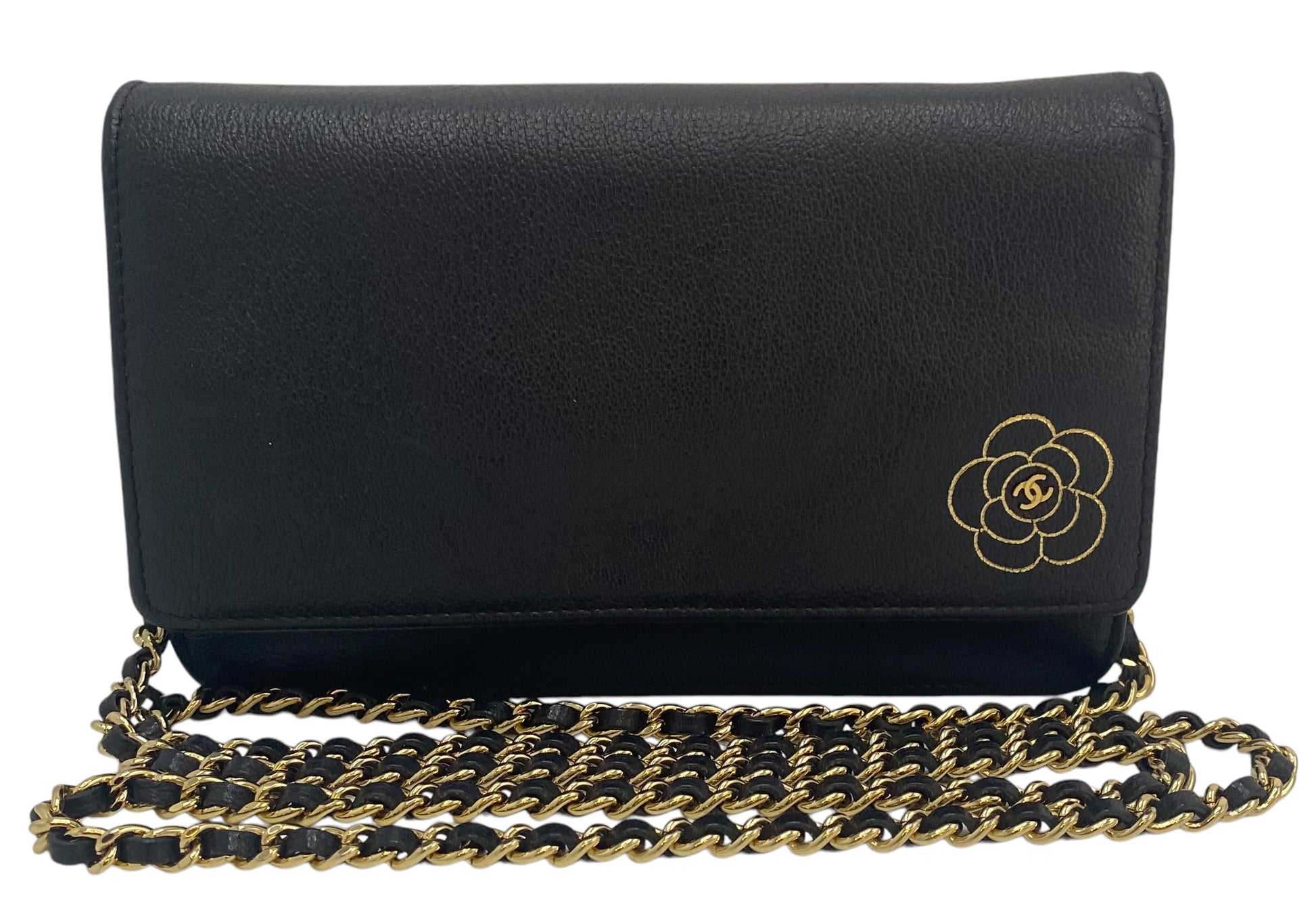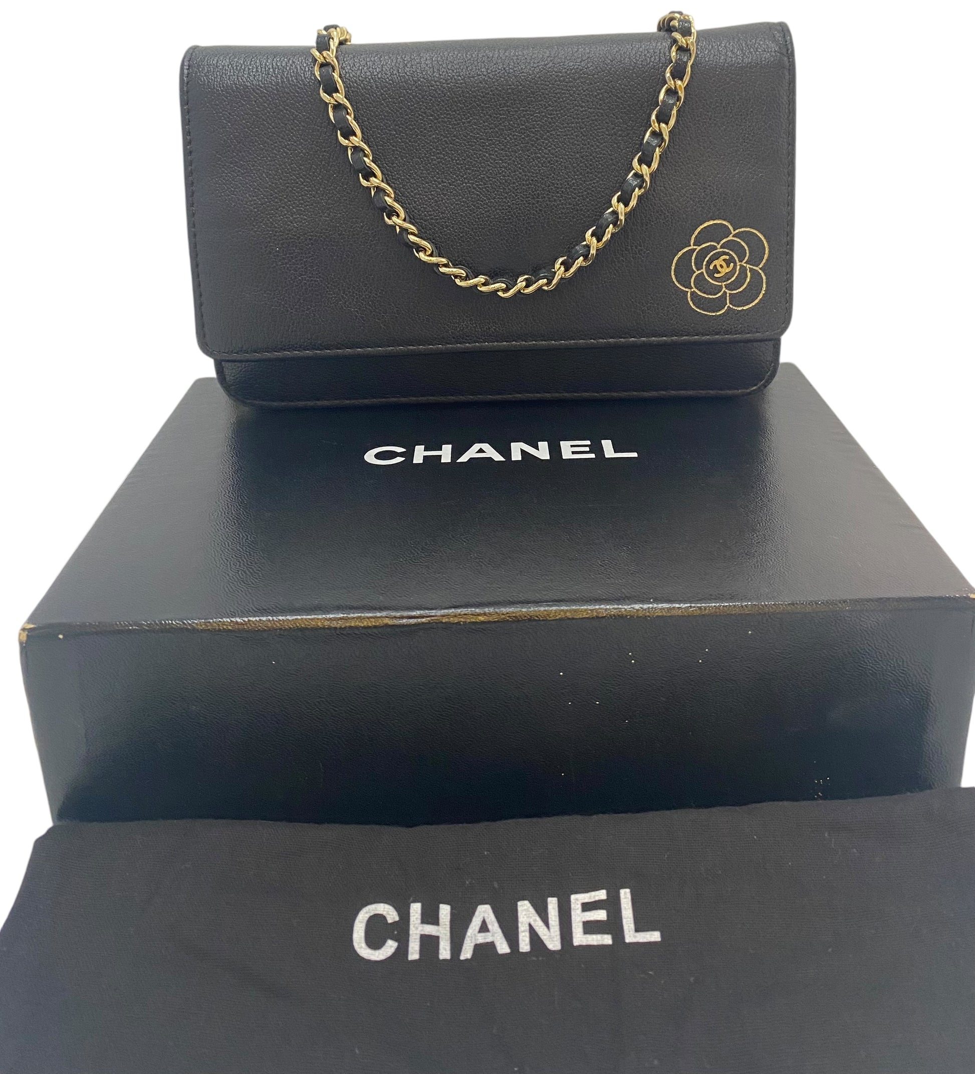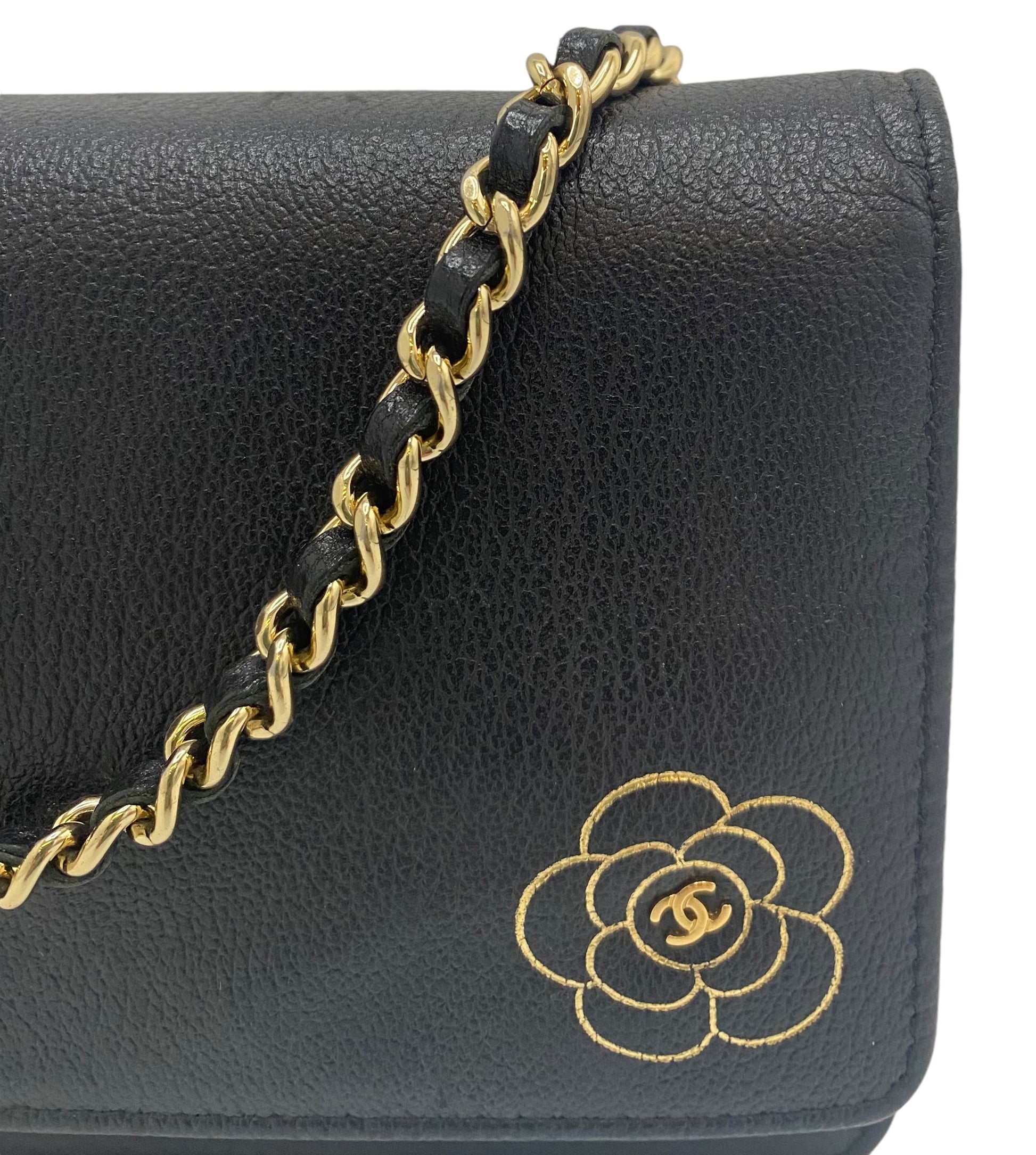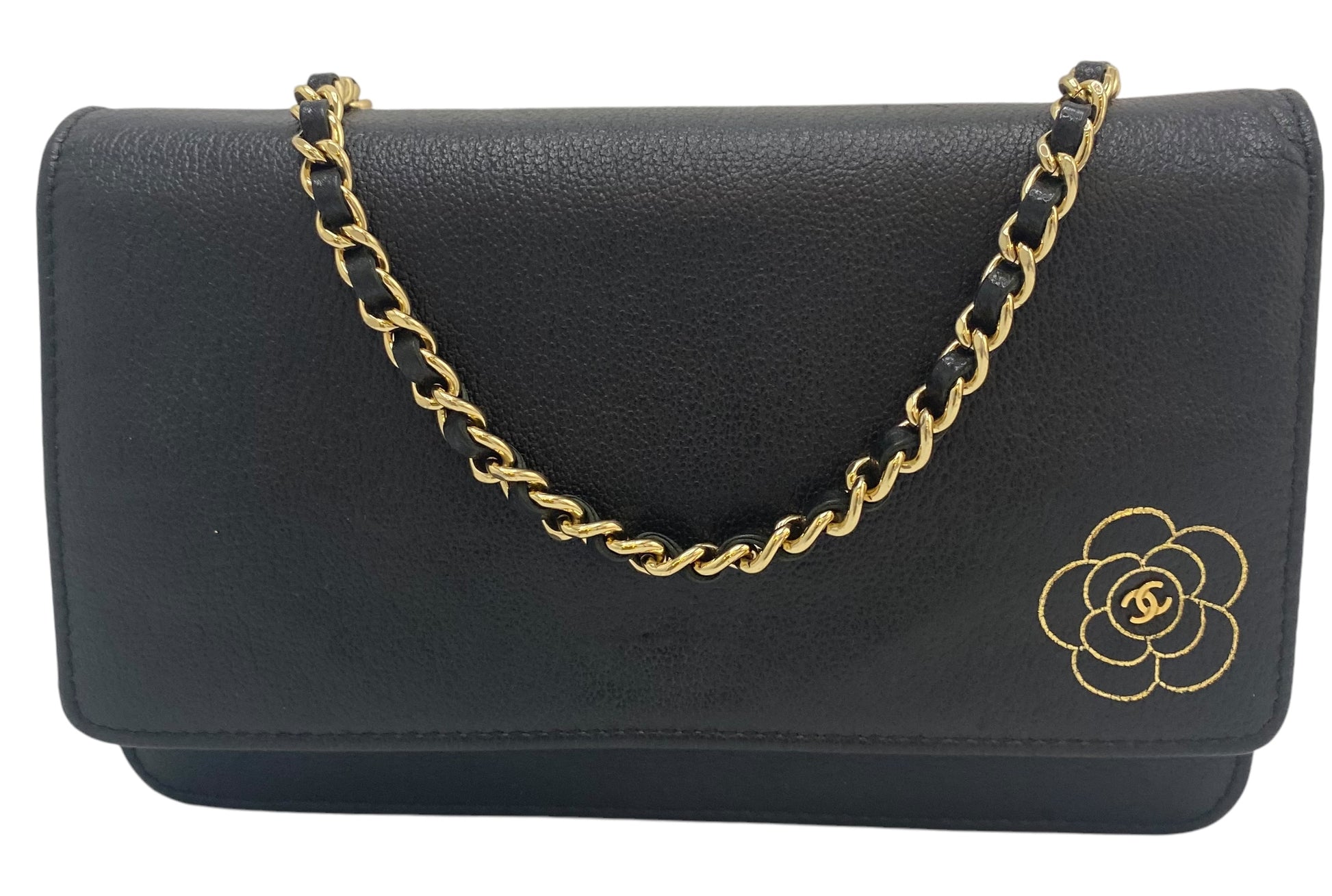 Chanel Grained Black Leather Camellia Wallet On Chain WOC Shoulder Bag GHW