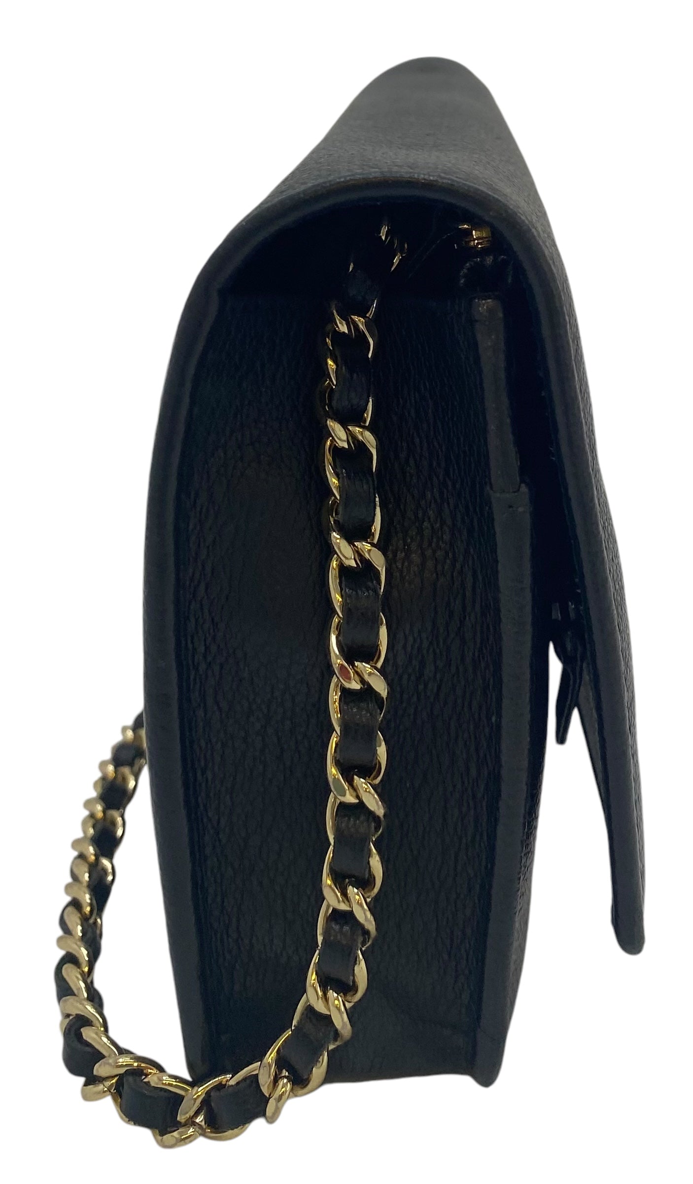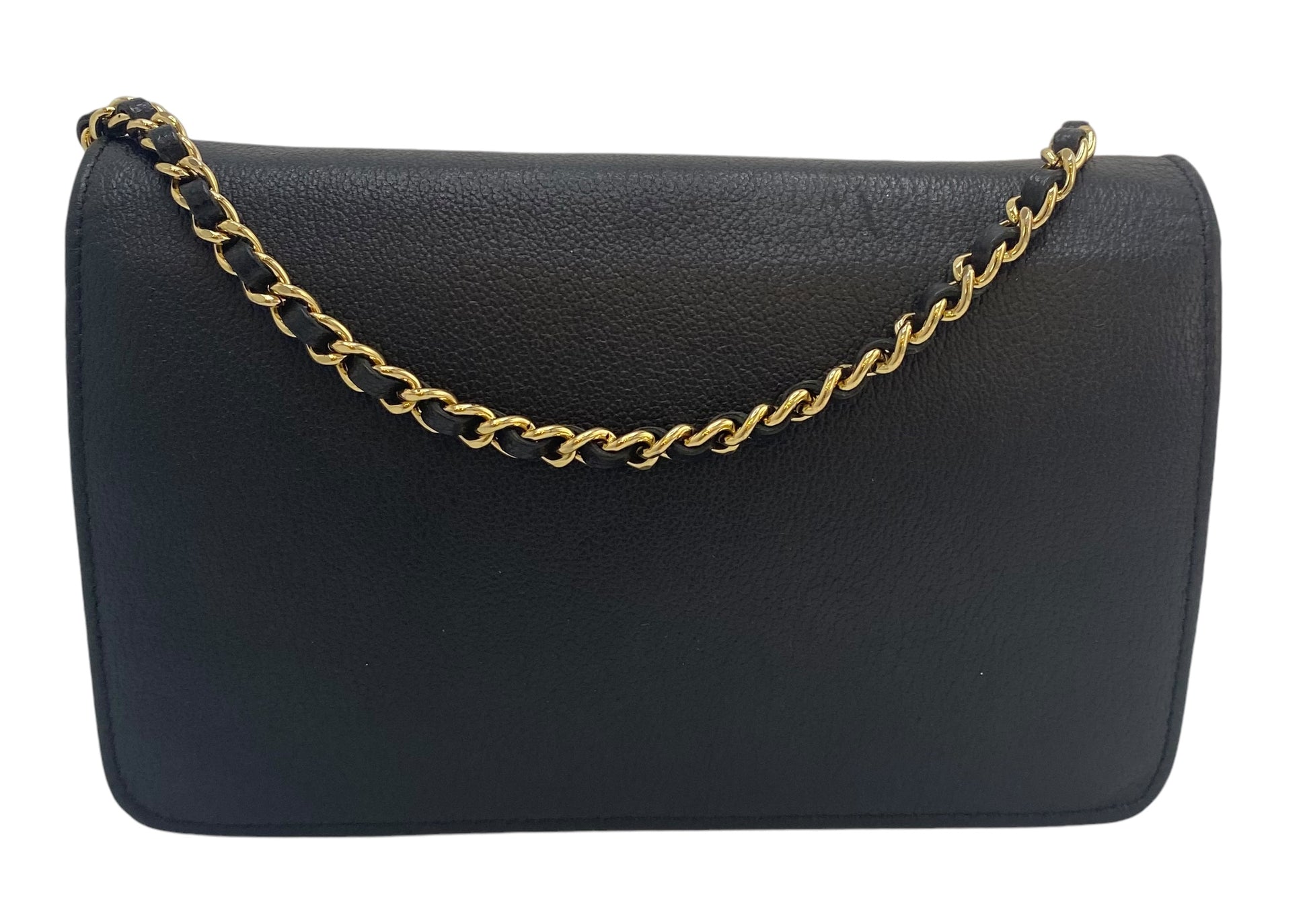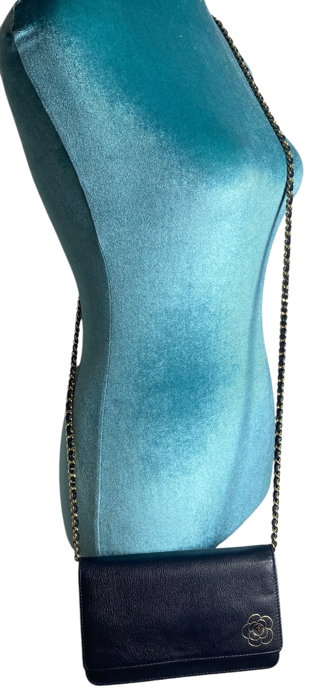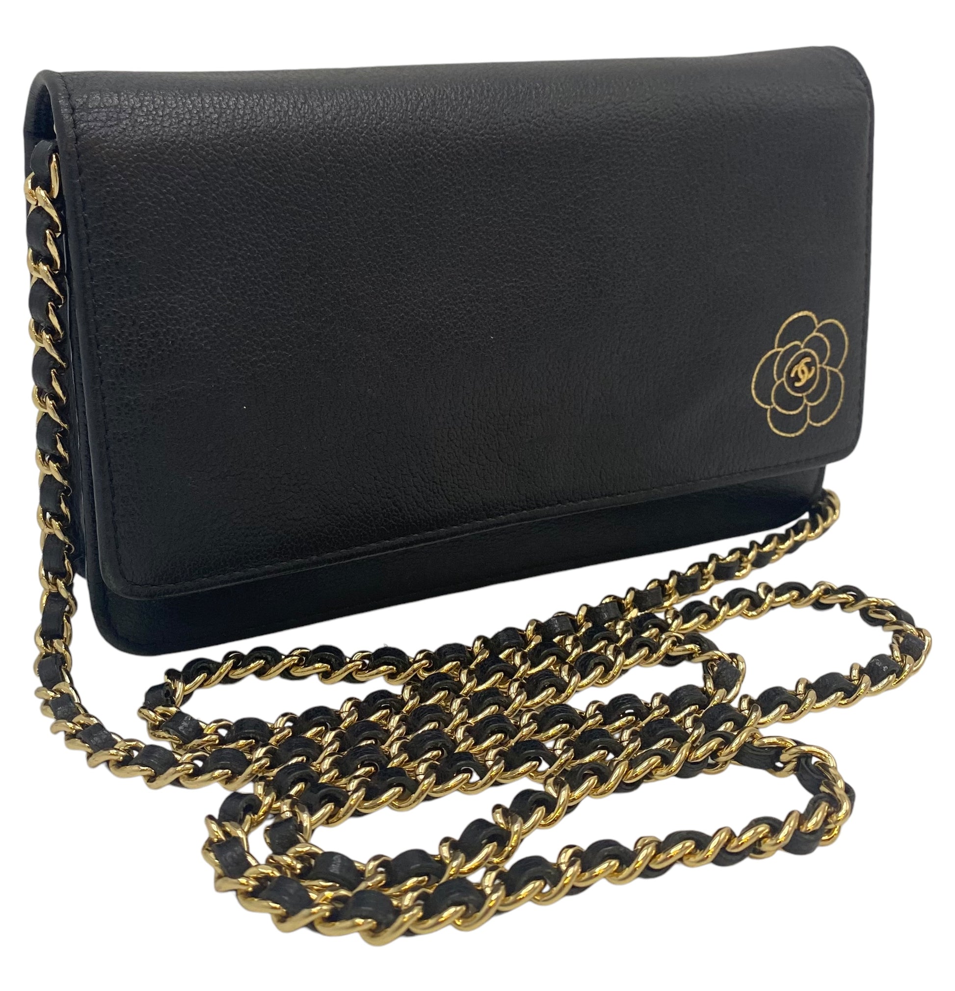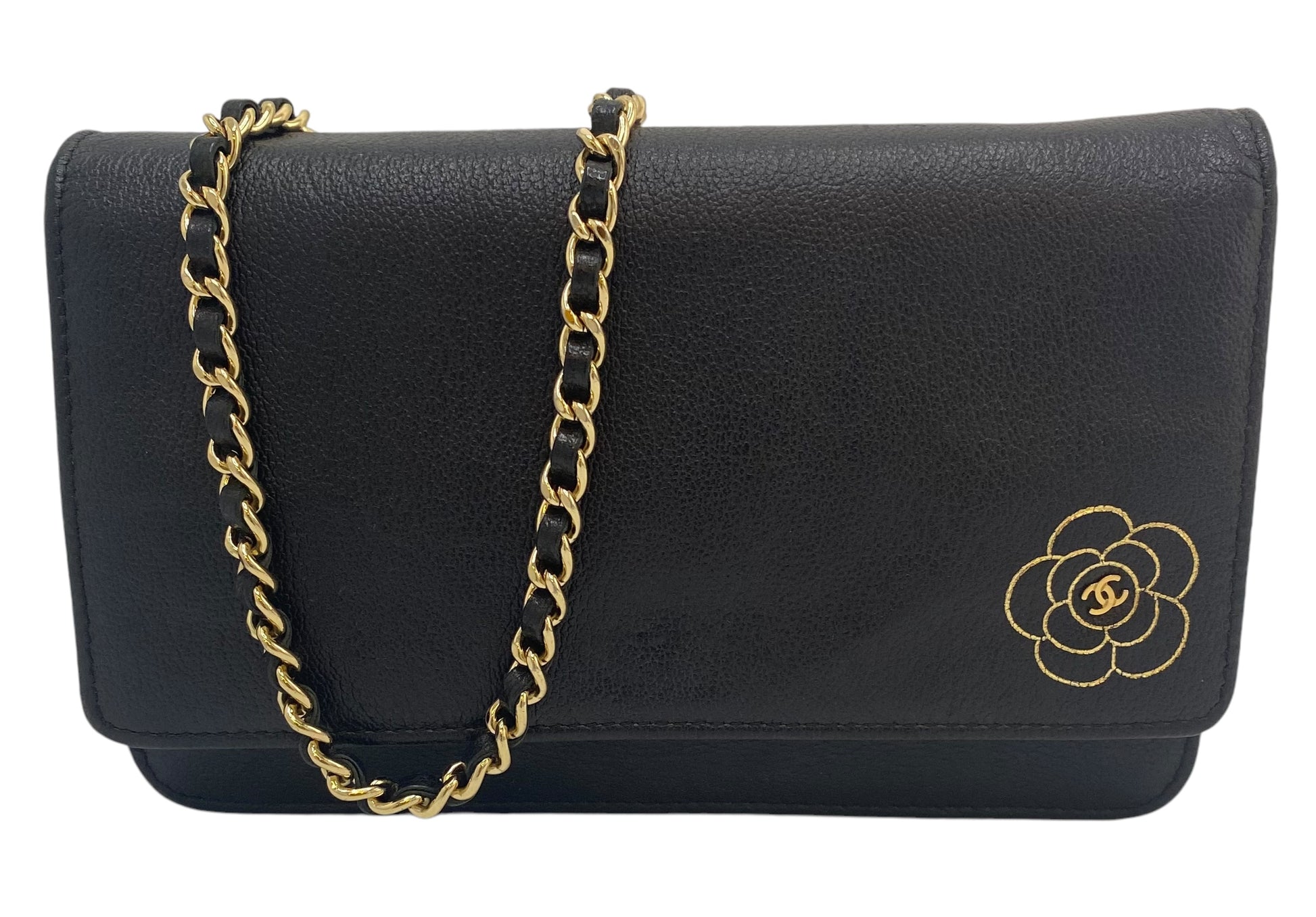 Chanel Grained Black Leather Camellia Wallet On Chain WOC Shoulder Bag GHW