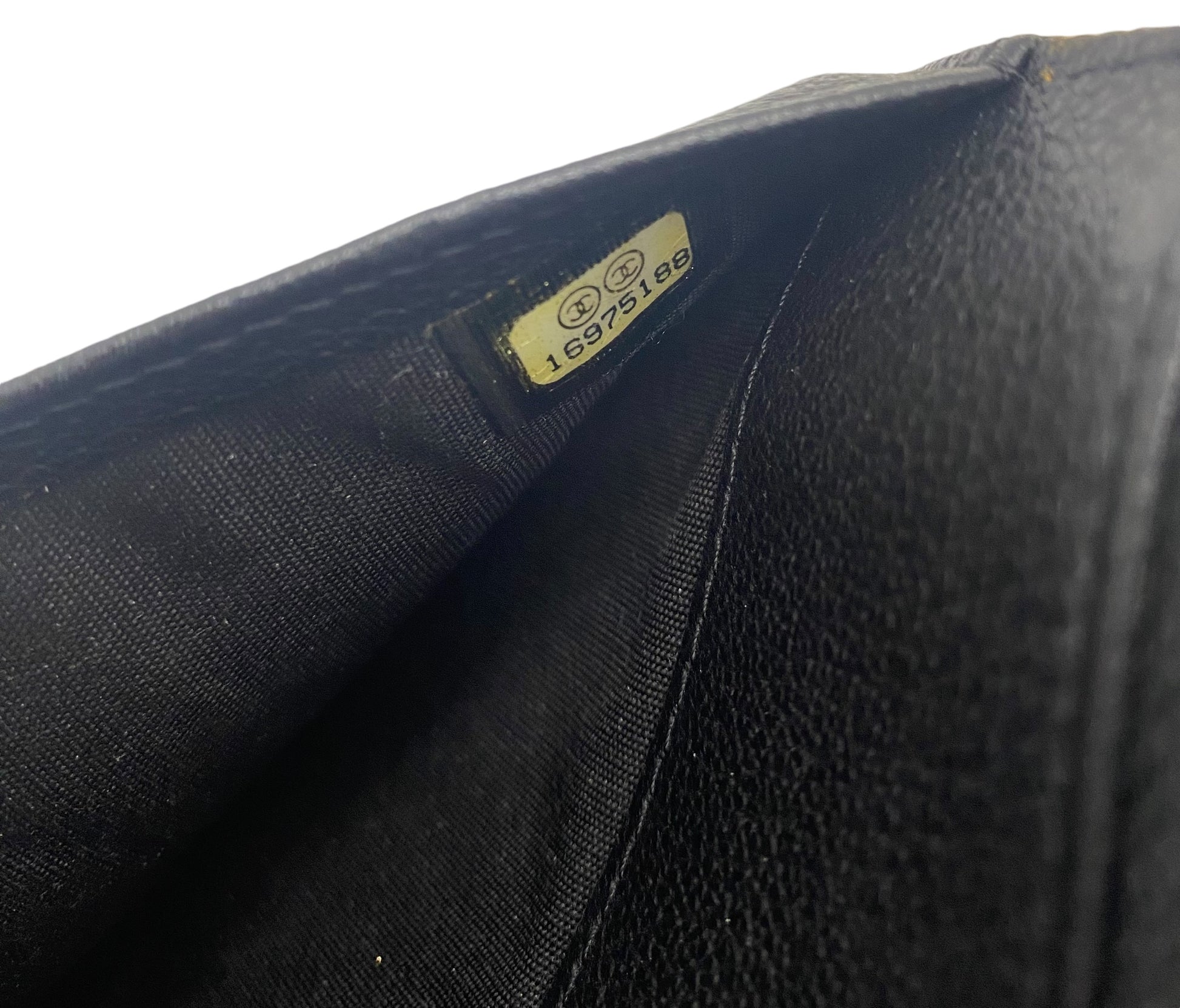 Soft Black Grained Lambskin Leather with Gold Camellia at corner with gold metal CC. This piece comes with original Chanel box and dust-bag.