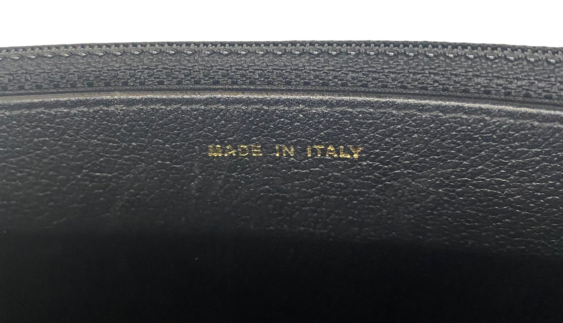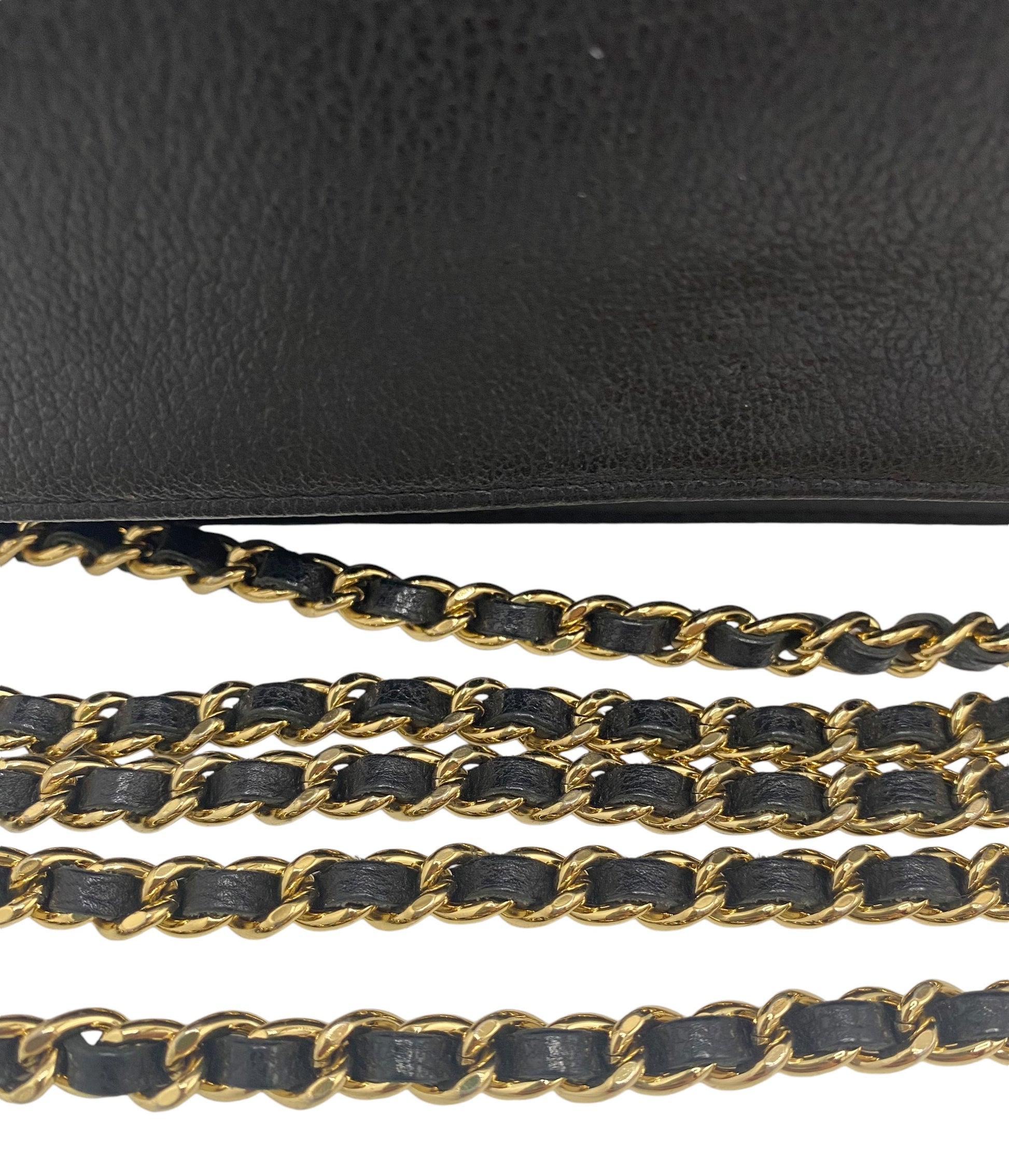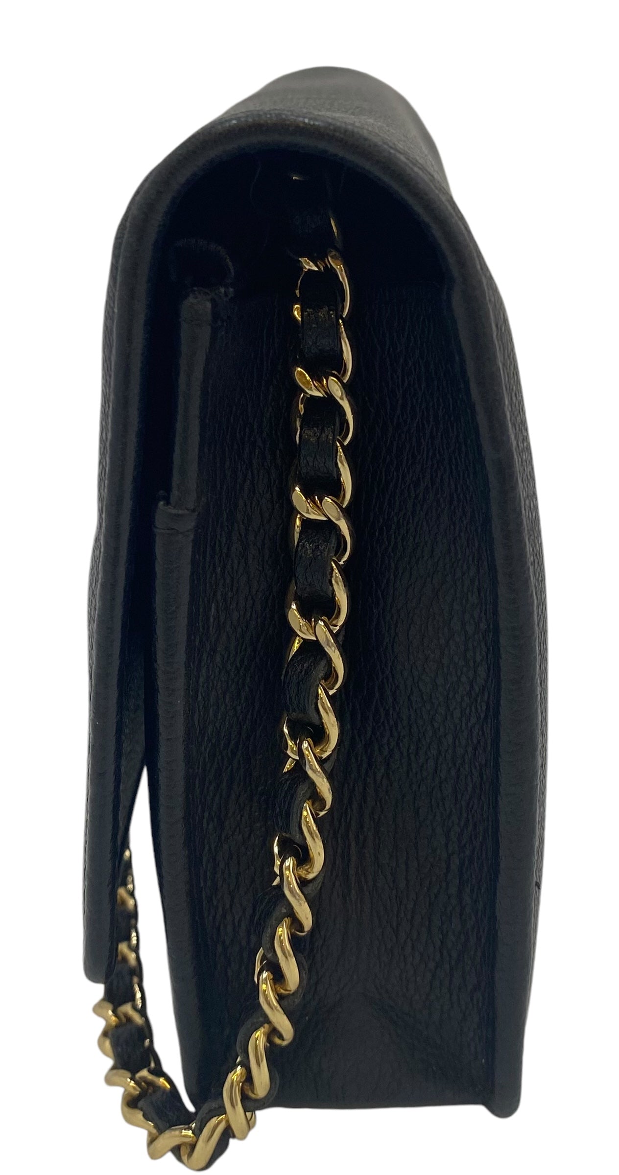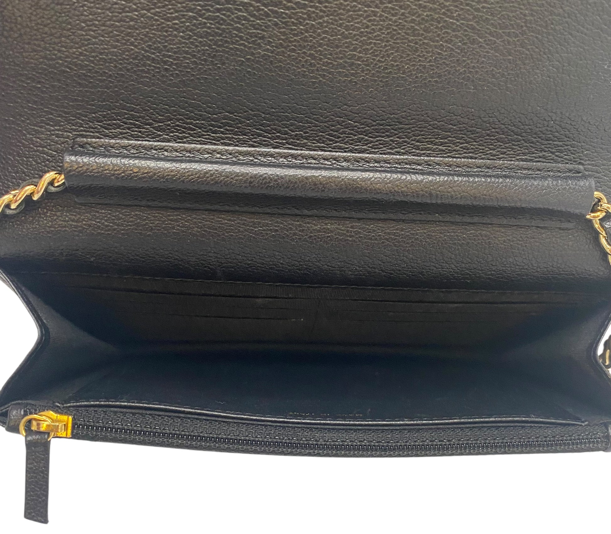 It is in excellent condition both inside and out. Shiny Gold chains and hardware are shiny with no fading or tarnish. The WOC can be worn long across the body, double chained on the shoulders or as a clutch. There are 6 credit card slots and a zippered interior pocket. The interior of the purse is very roomy and can hold some keys, a lipstick and any phone.