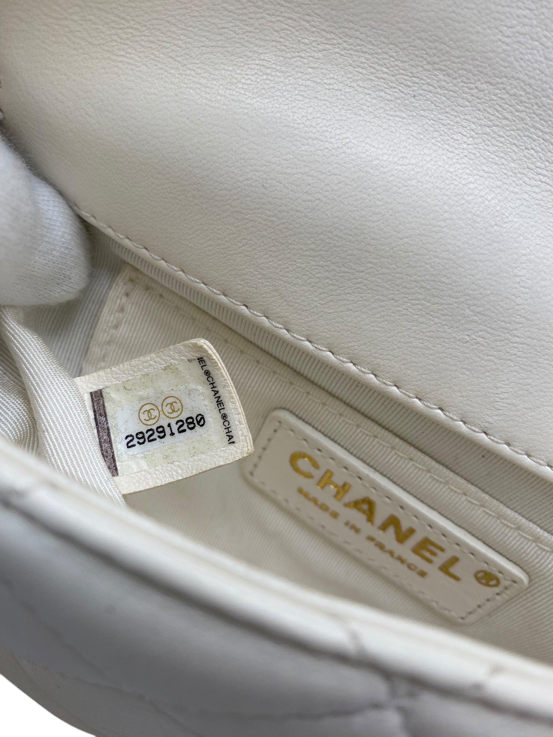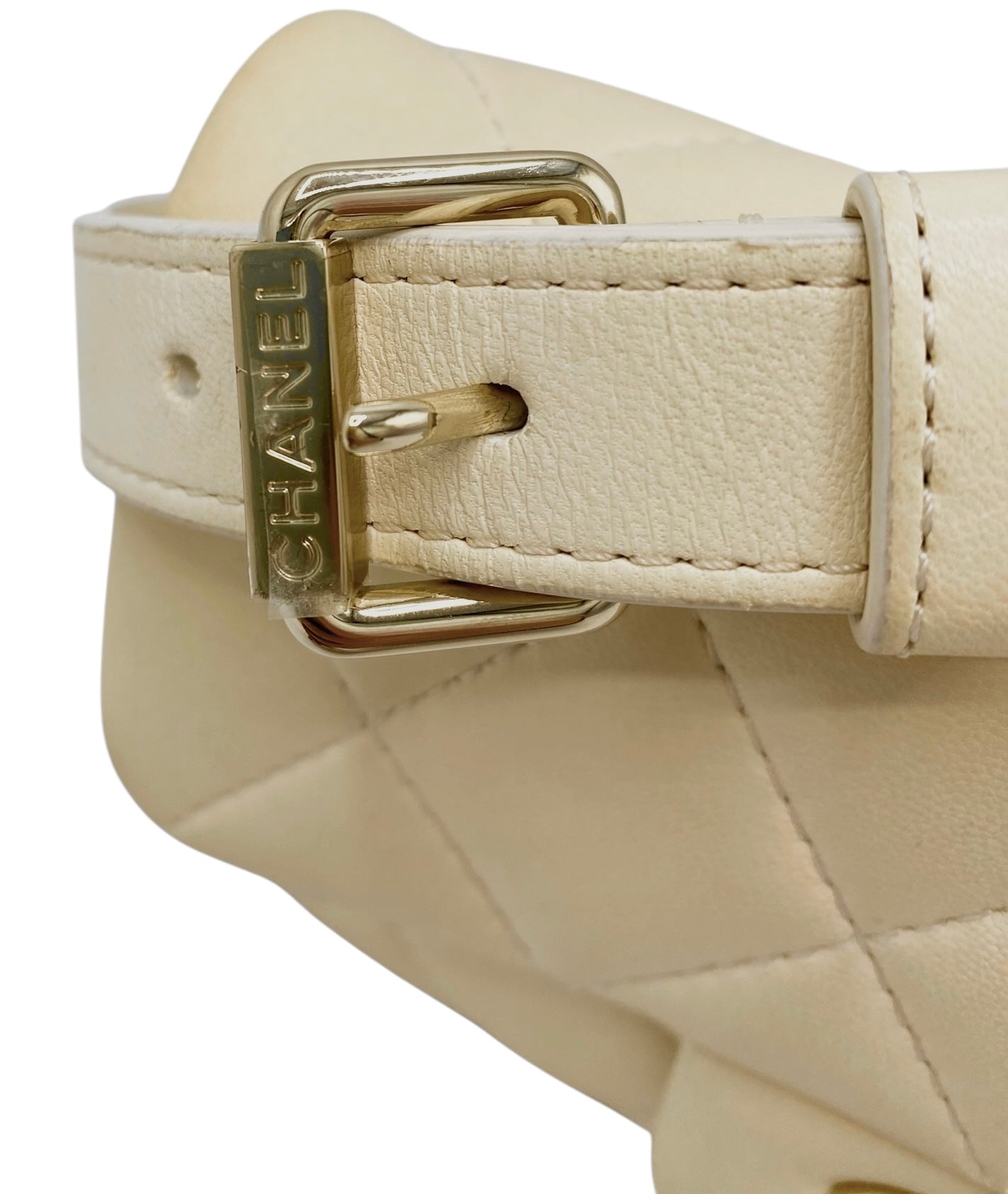This petite belt bag bag is Chanel’s ‘Winter White’ white ivory cream butter soft Lambskin leather quilted leather with campaign gold hardware. The bag features leather threaded silver chain-link chain detail, set on a white leather waist strap, and accented by resin pearls spelling CHANEL. The envelope flap opens with a silver Chanel CC turn lock to a white fabric interior with a patch pocket.
