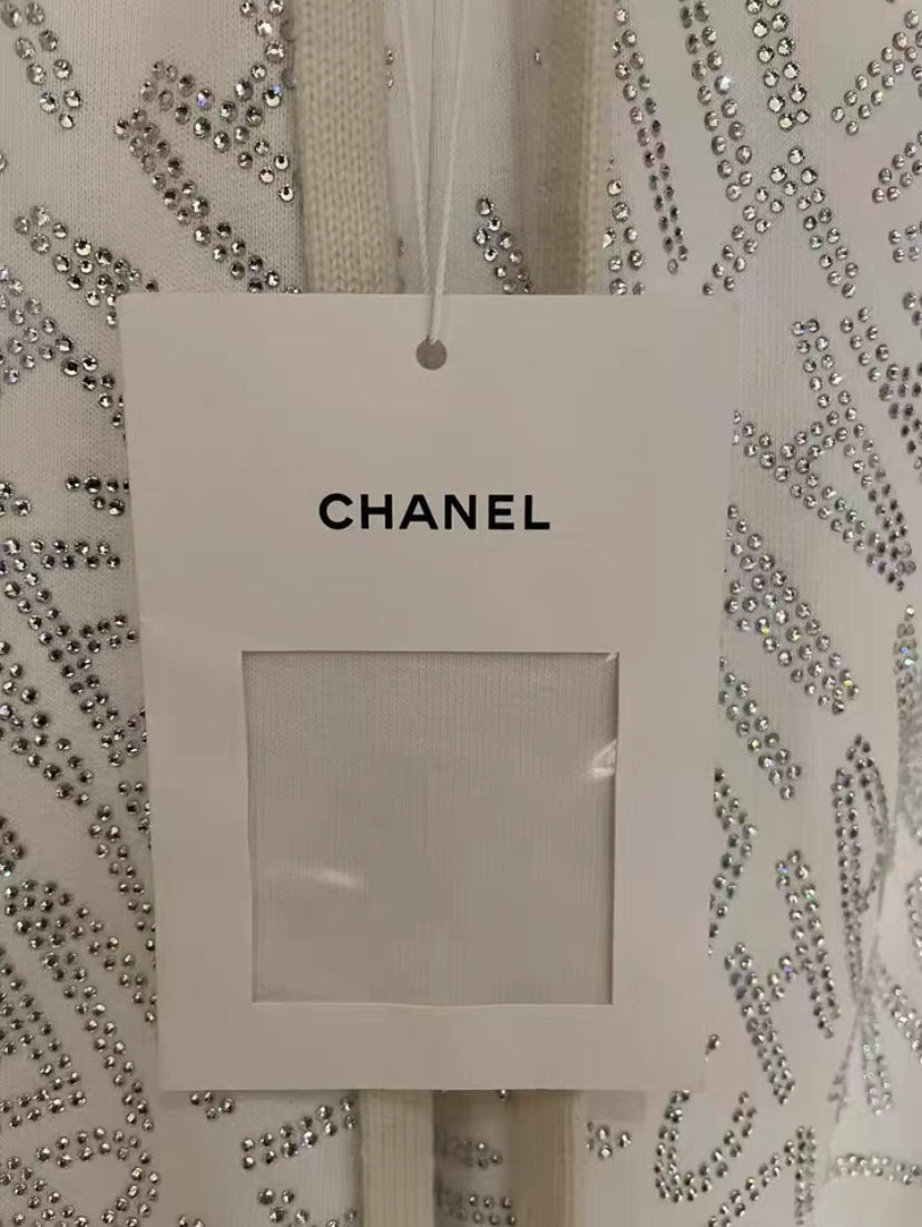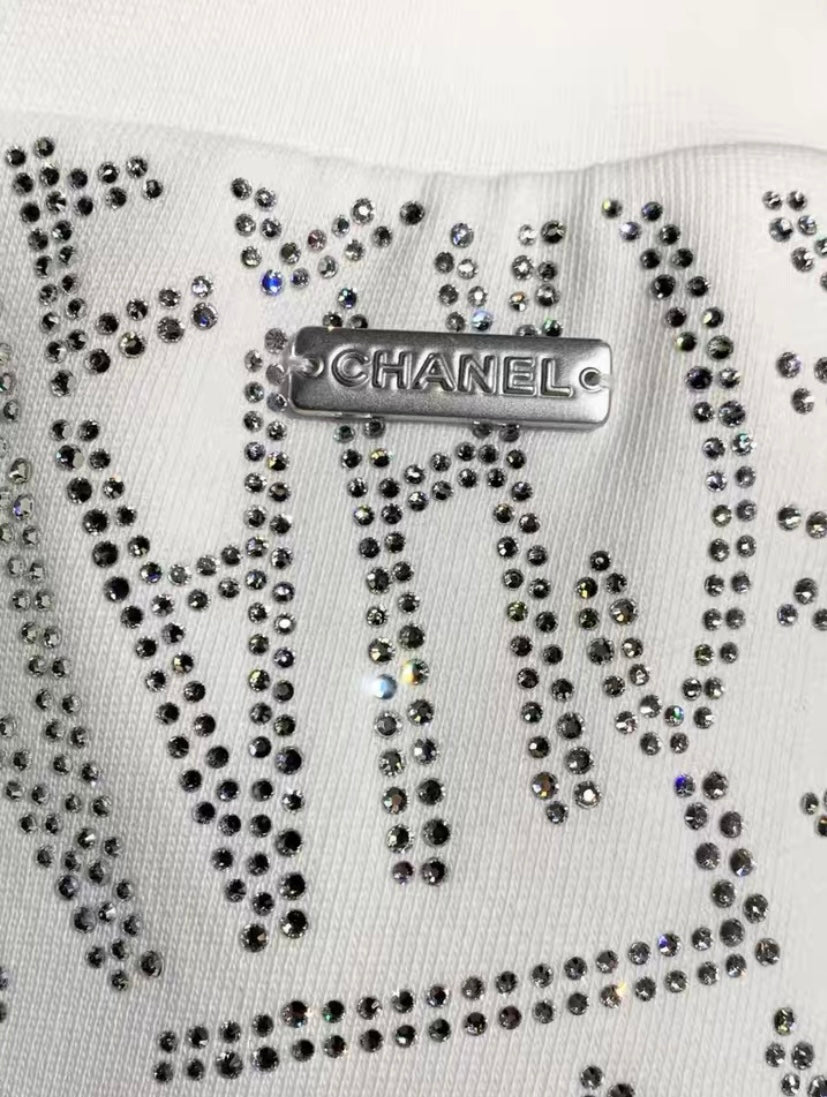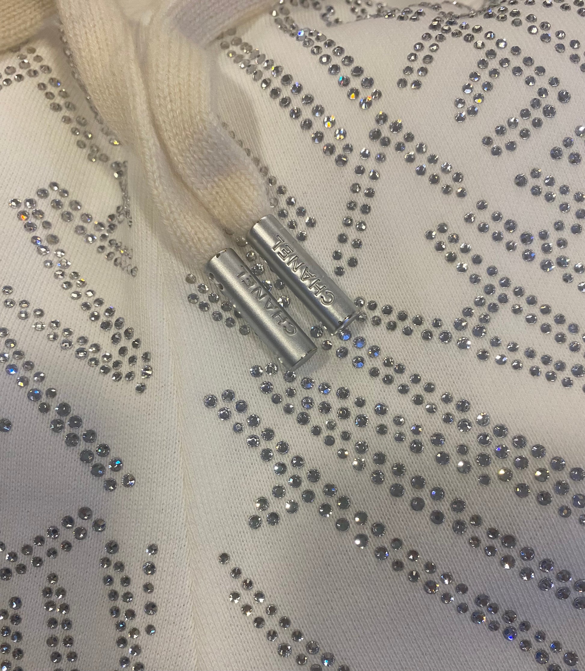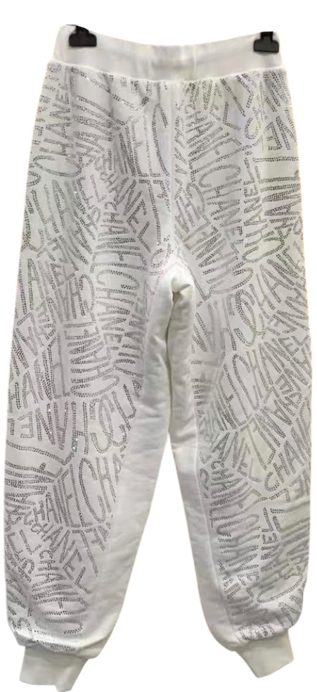 Incredible FULL Swarovski CHANEL letters and logo white sweatpants. Very thick Warm Insulated Fuzzy Lining to keep you warm for the fall winter months! Stretchy waistband with strings, metal CC Chanel name plate at waist. The perfect Apre After Ski Pants.