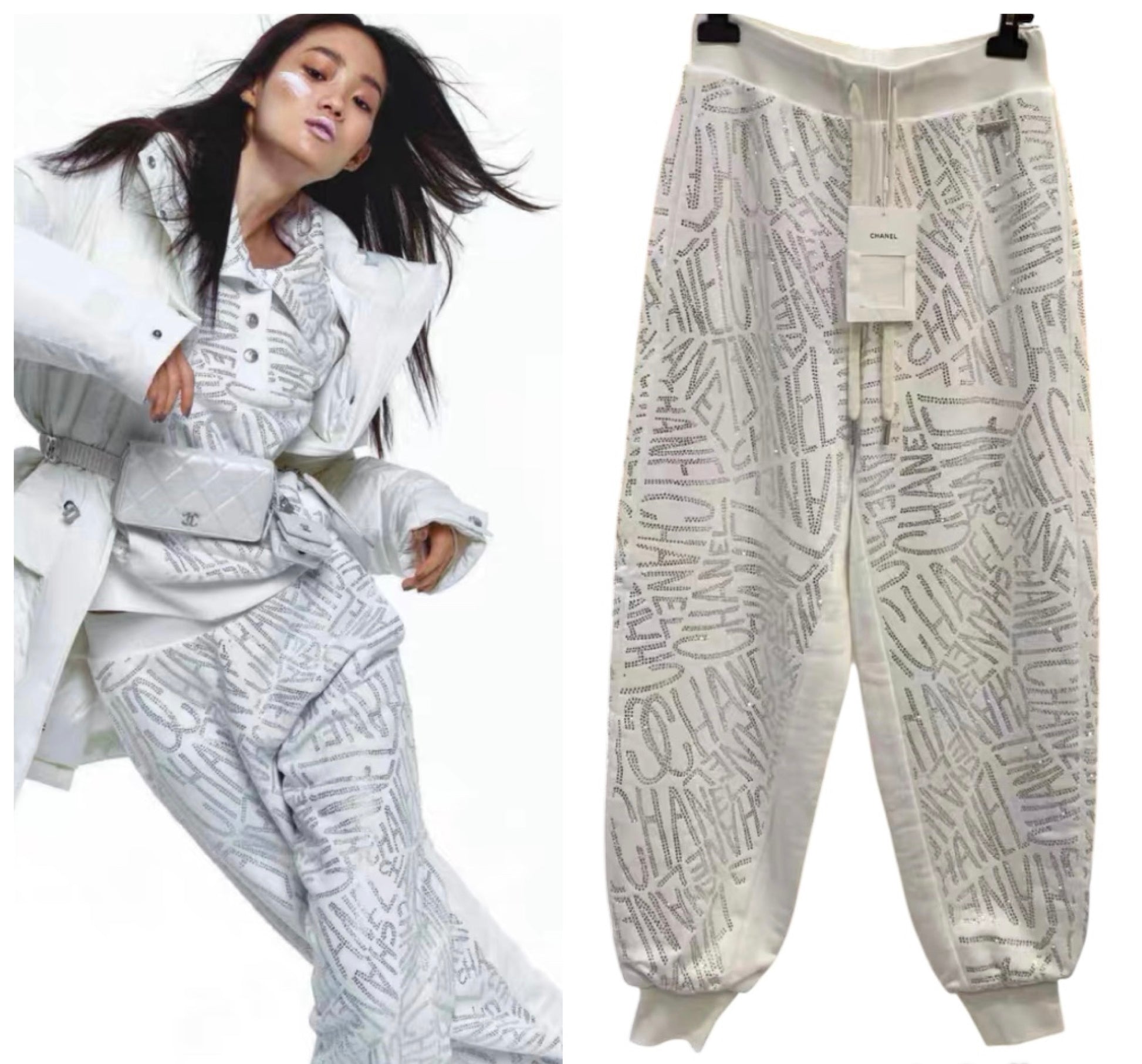 Chanel NWT 21N Coco Niege Swarovski CC White SweatPants Warm Winter Sport Pants FR 34