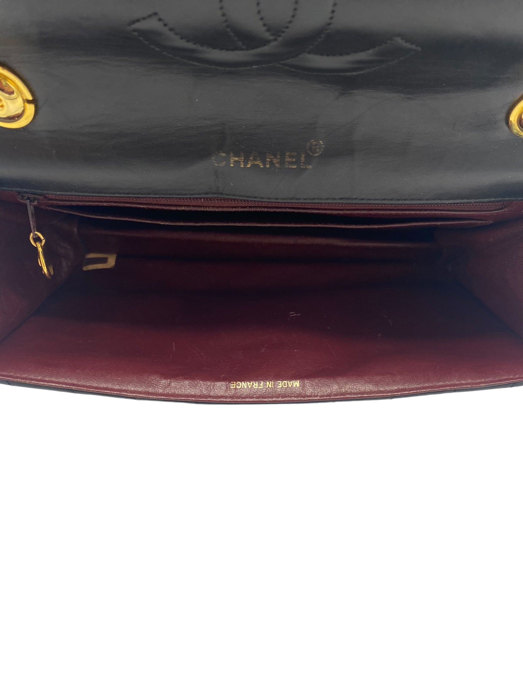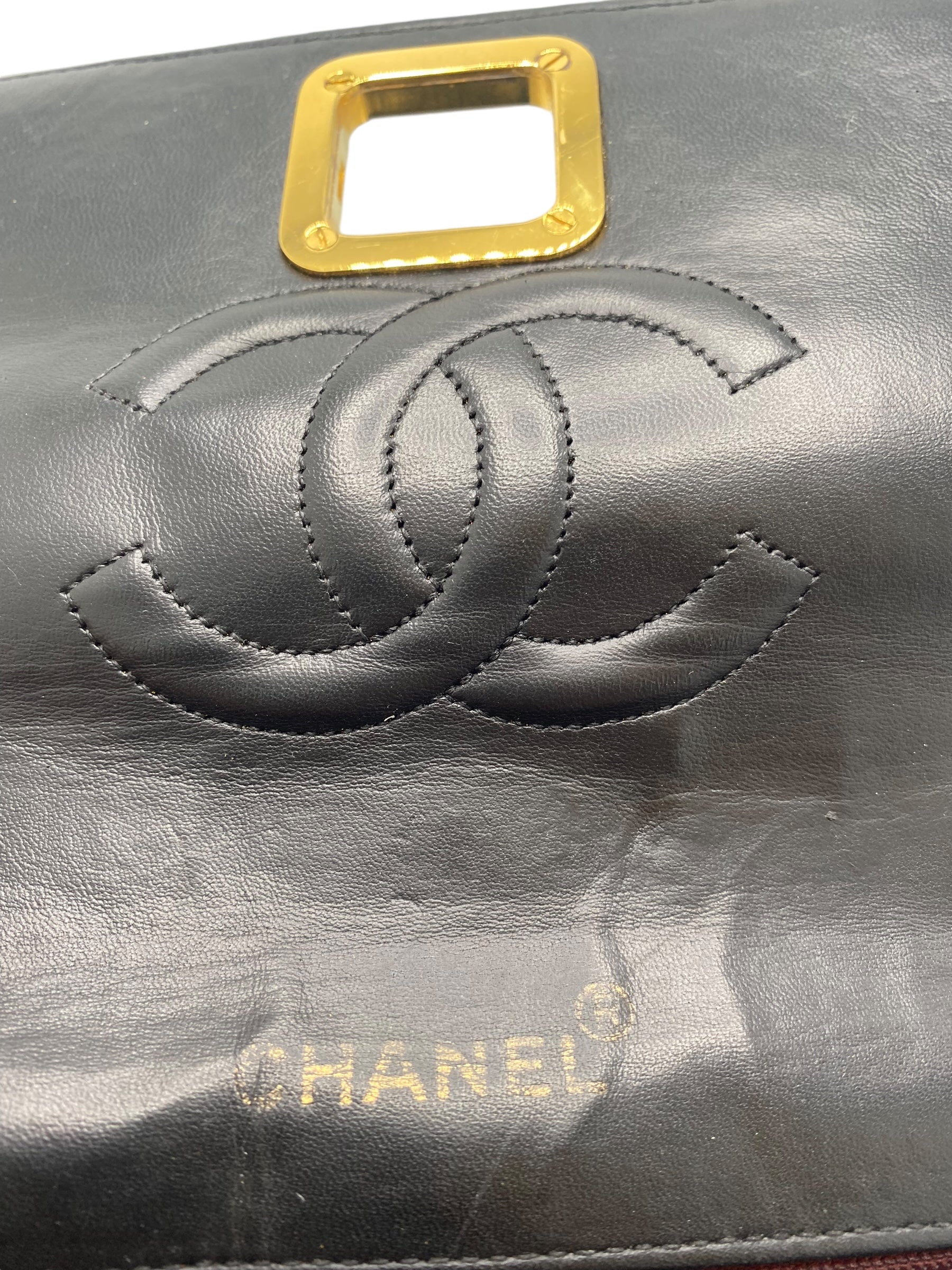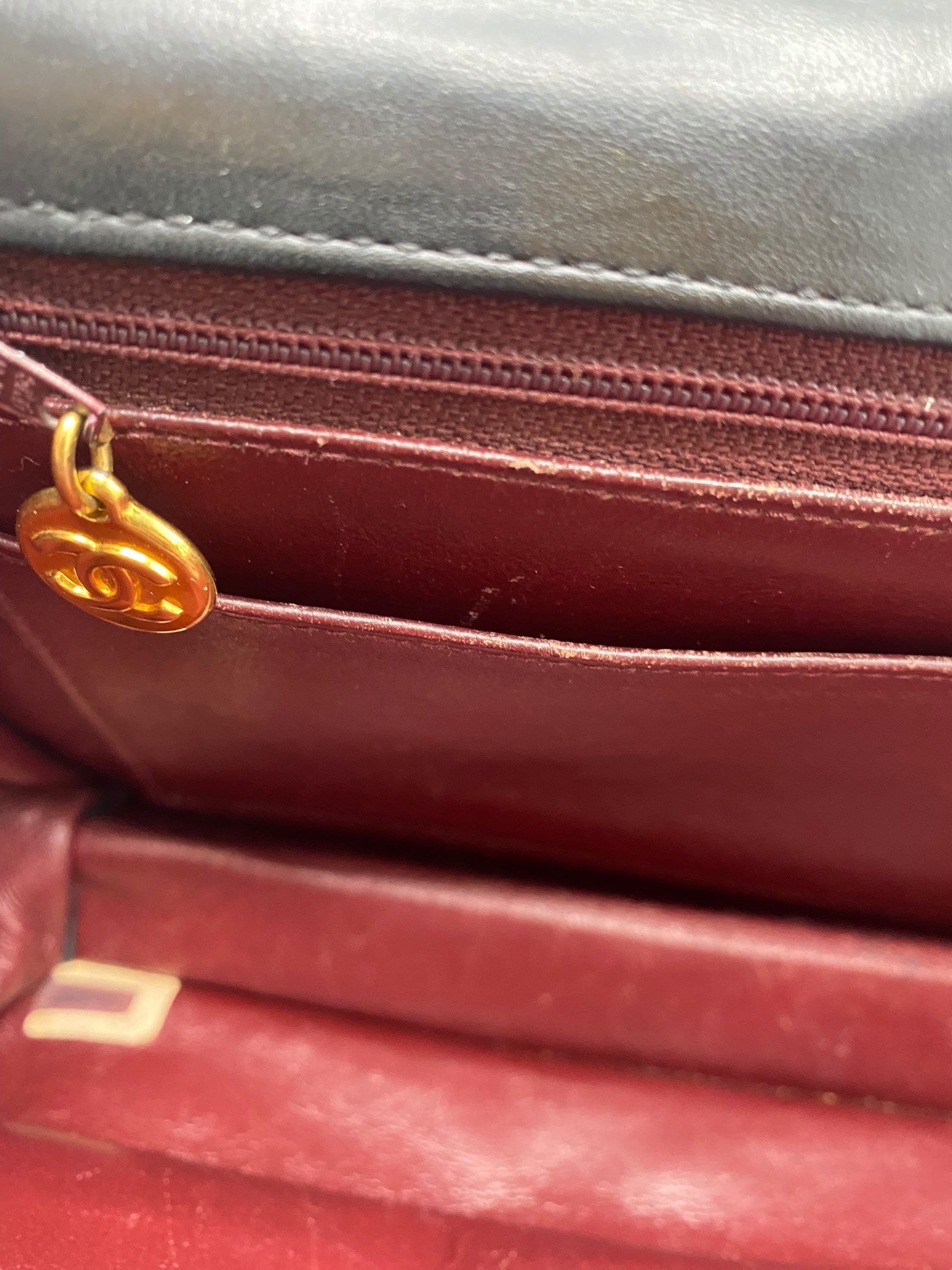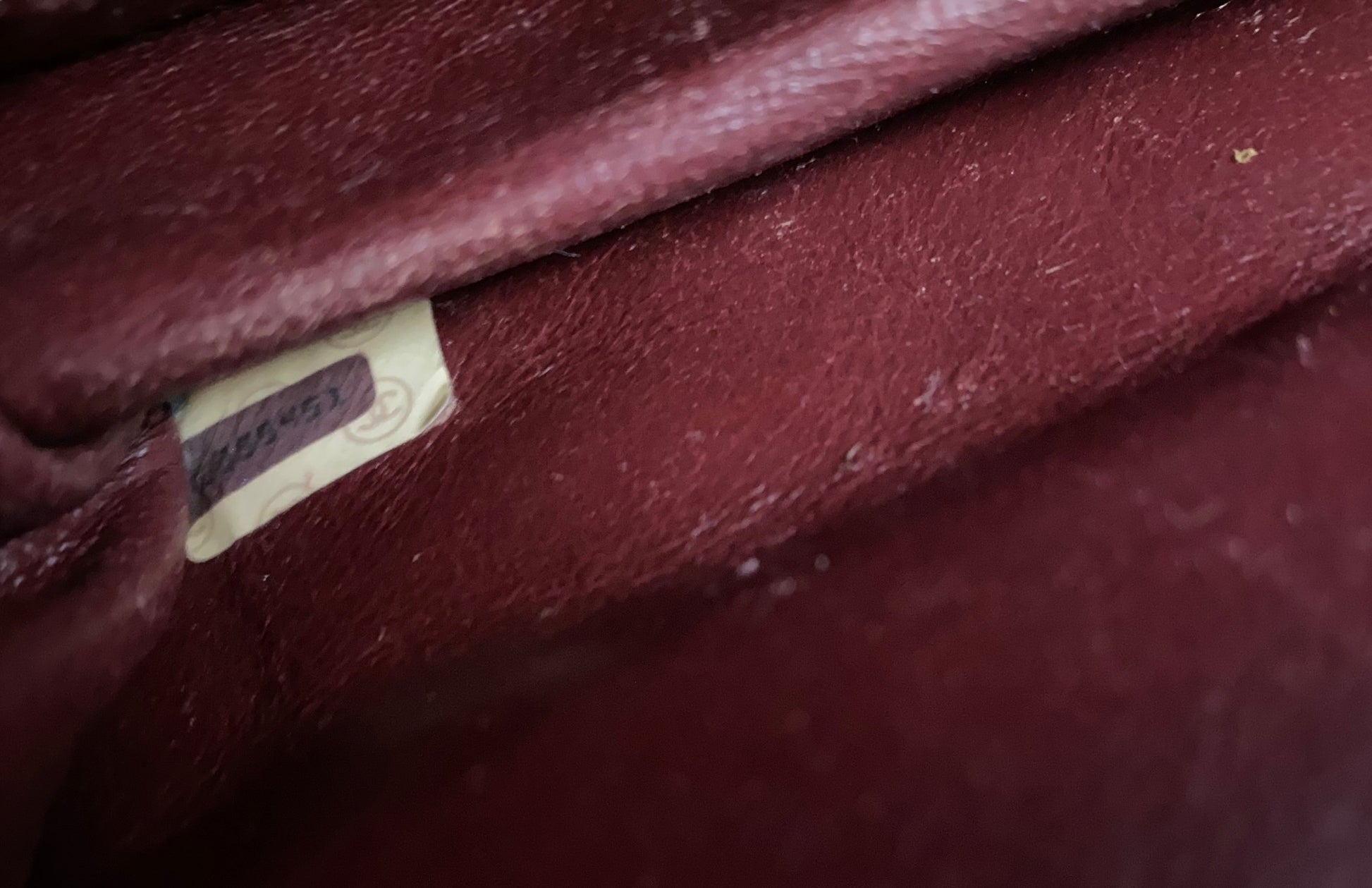 Condition: Shiny 24K Gold Hardware Push-Lock. Black exterior color refresh. Light scratches to burgundy leather interior. Please refer to photos and video. Overall in Very Good Condition.
