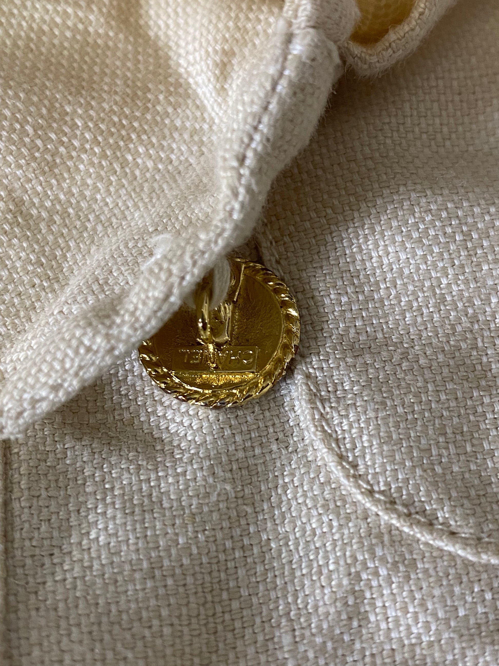 Chanel 1980-1989 Vintage Jacket by Karl Lagerfeld, Very Elegant with 18!!!!! Incredible Quilted Gold Metal Buttons with Chanel Stamp on each Side. Cream linen featuring a v-neck, yellow gold tone metal buttons, and 4 patch button pockets. Made in France.