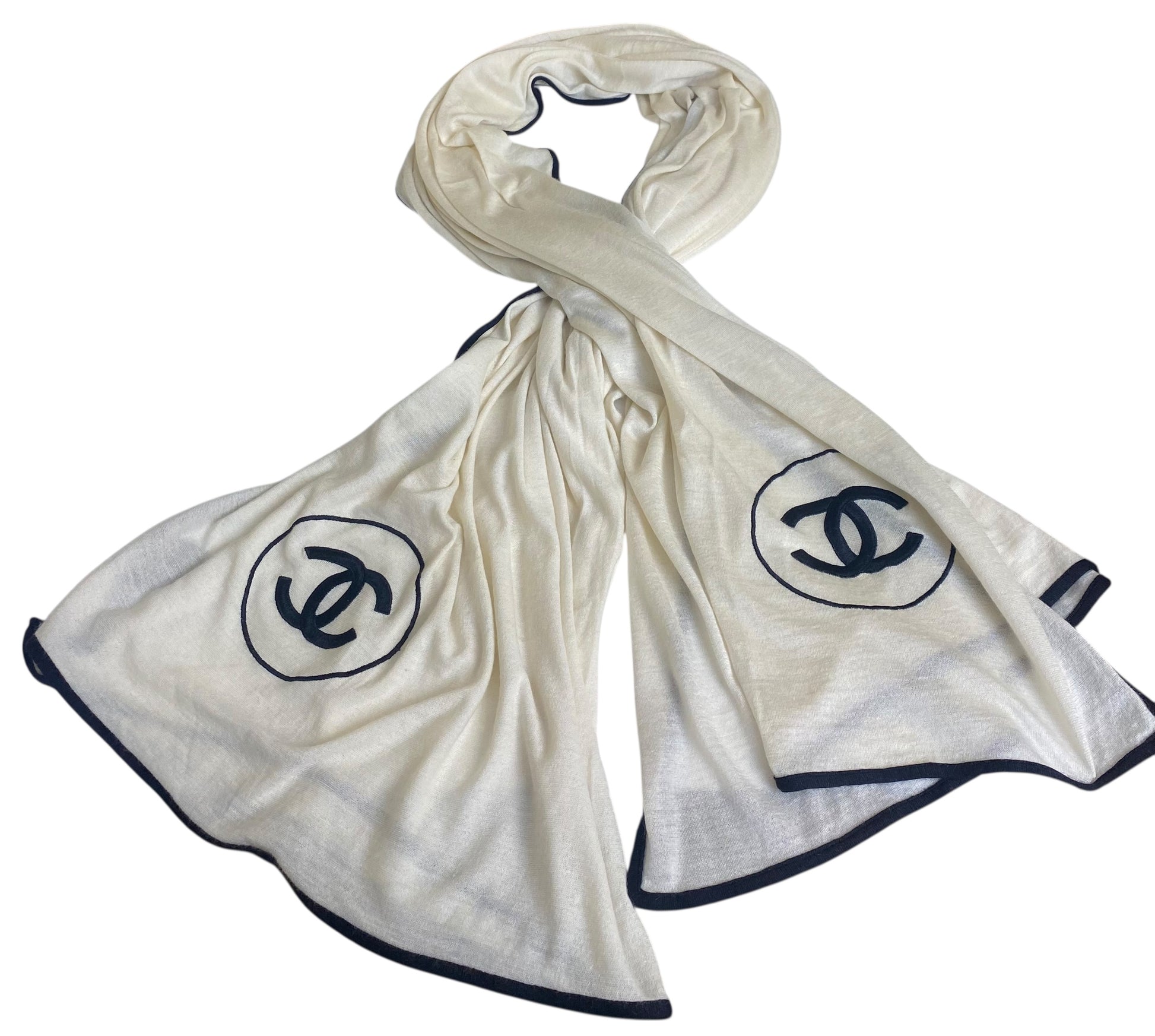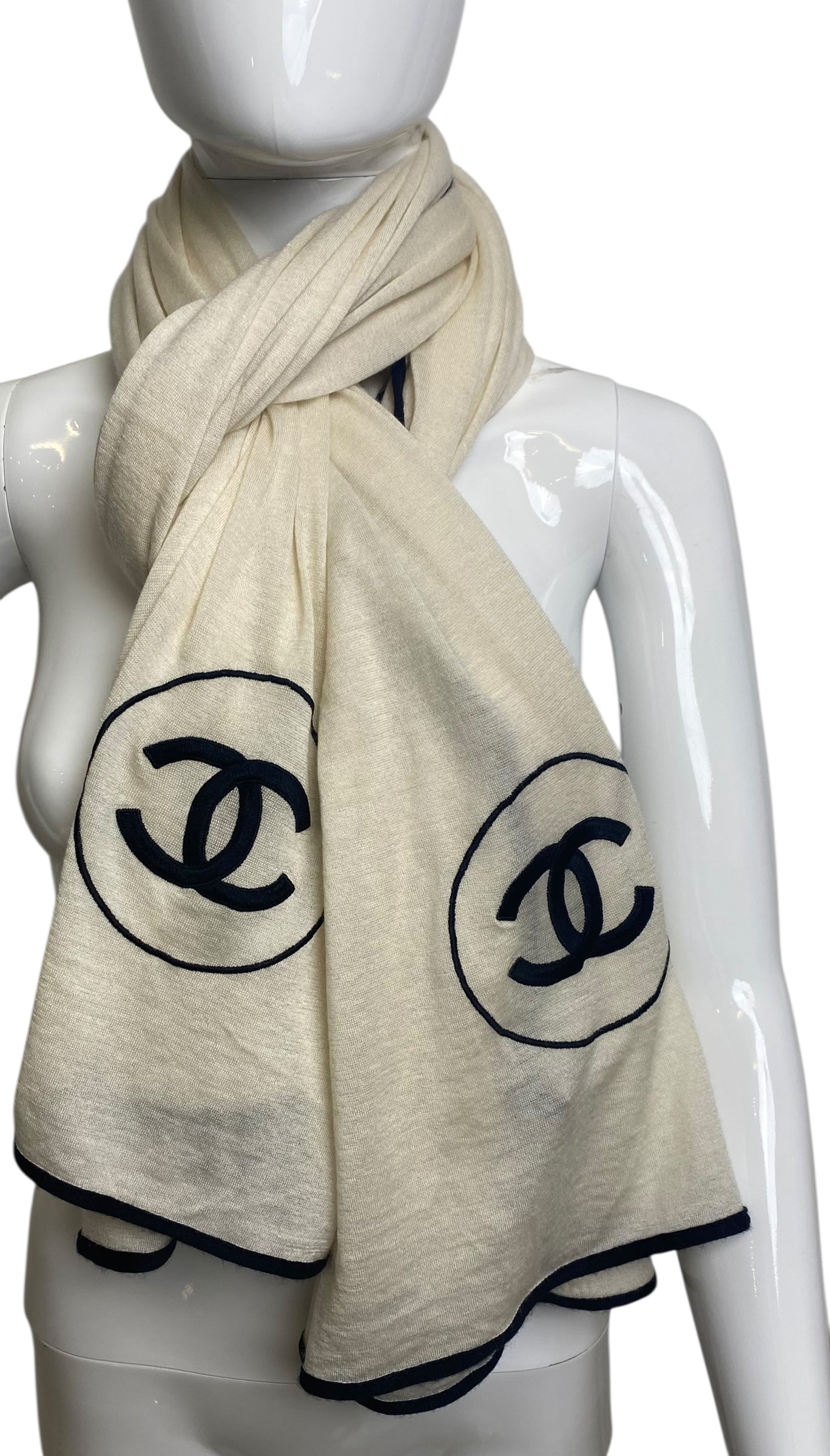Super Soft, Extra Large Chanel stole in ivory white with 2 Black Large CC Embroidered Logos, with black edges.