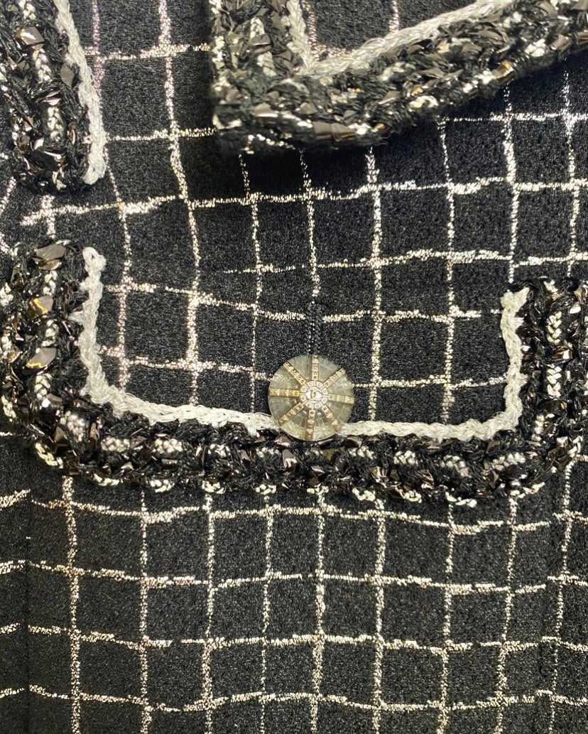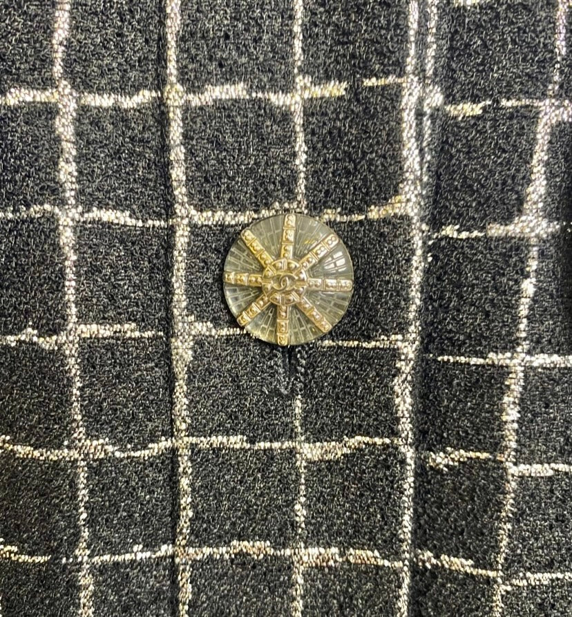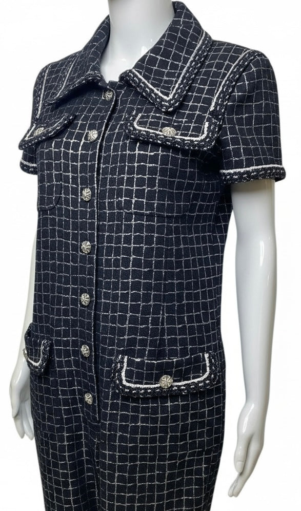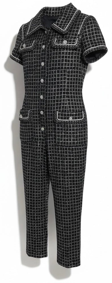 Stunning Short Sleeve Jumpsuit in Black with Fantasy Crepe Metallic Silver Iridescent Checker Tweed Pattern. Large Lucite Clear & Silver Metal CC Buttons, 7 down the front, 4 at patch pockets. Pretty Braided Tweed Metallic Trim.