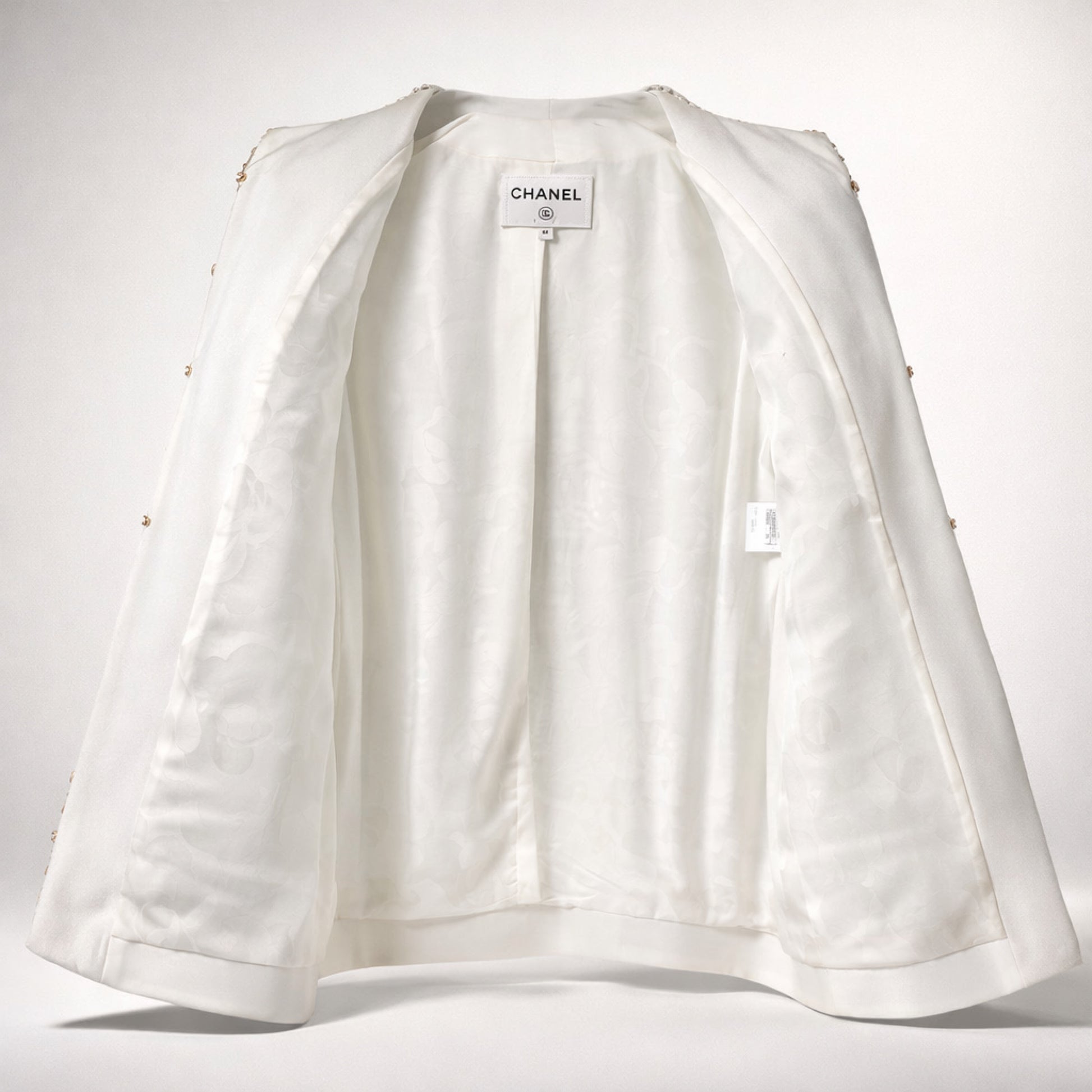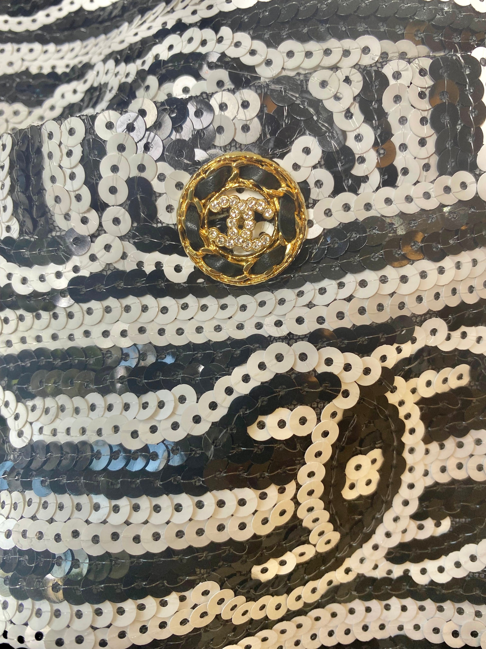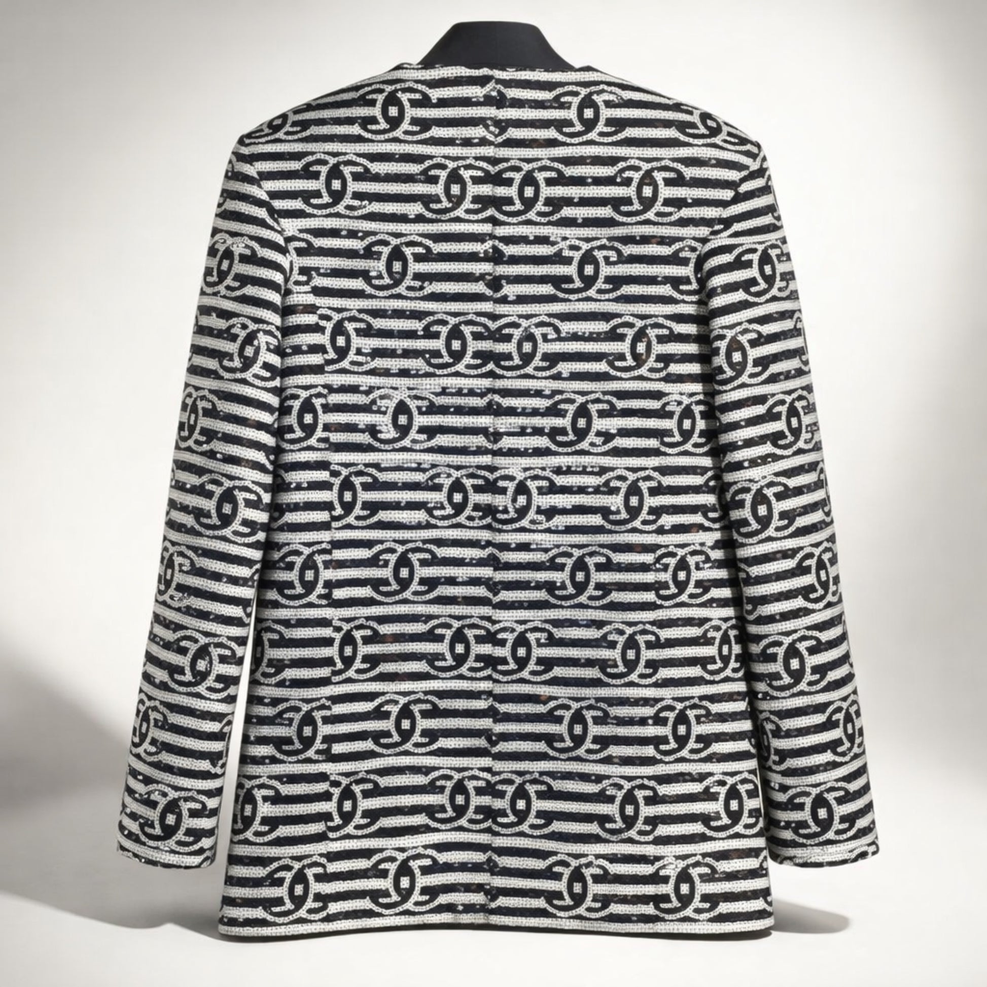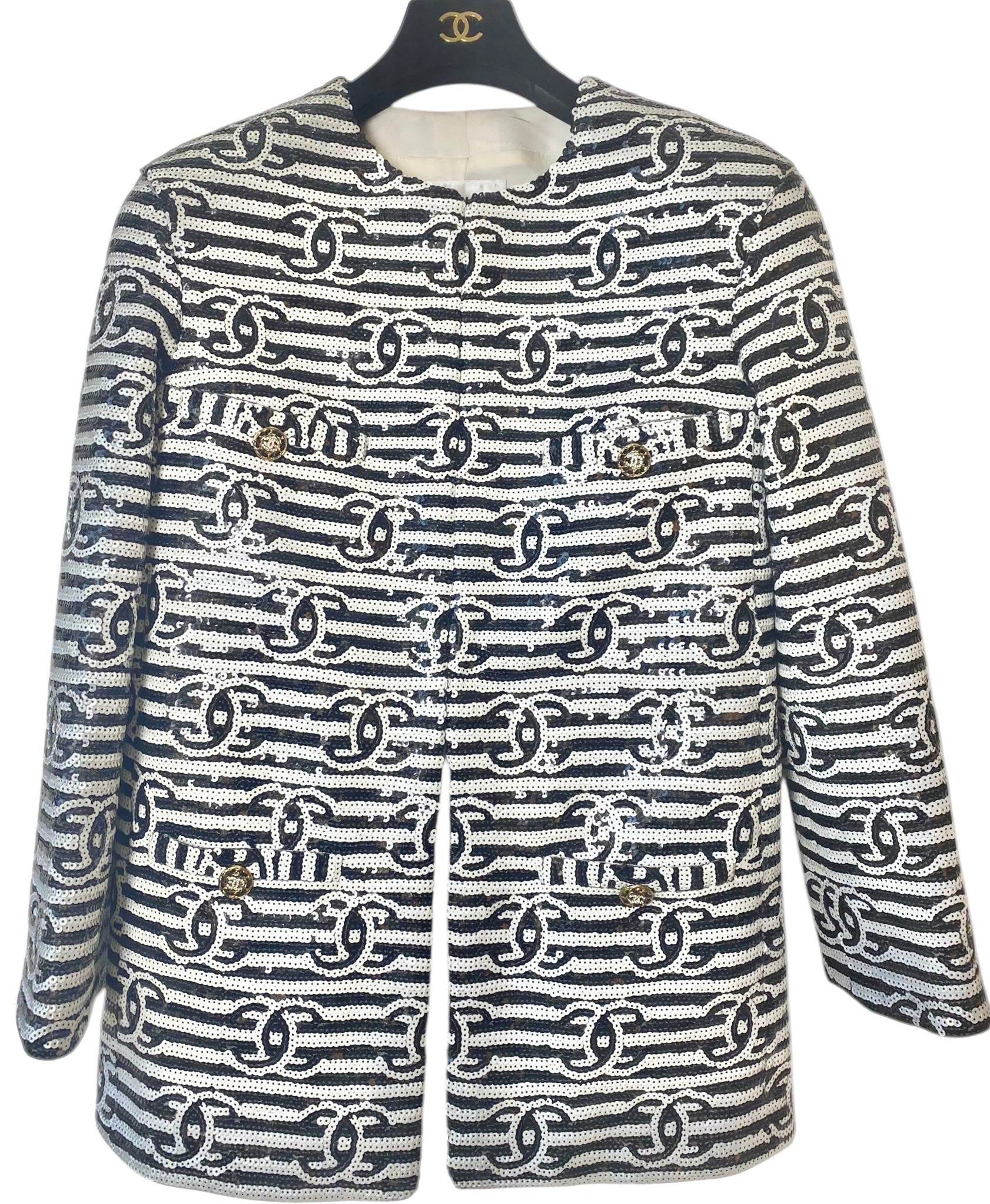 This jacket is fully sequin and features the iconic CC logo all over in a bold black and white color scheme. Lined in Silk. hook and eye closures. 4 patch pockets with CC Buttons in Gold with Crystals and Chain Link Trim. Retail over 15k plus tax.