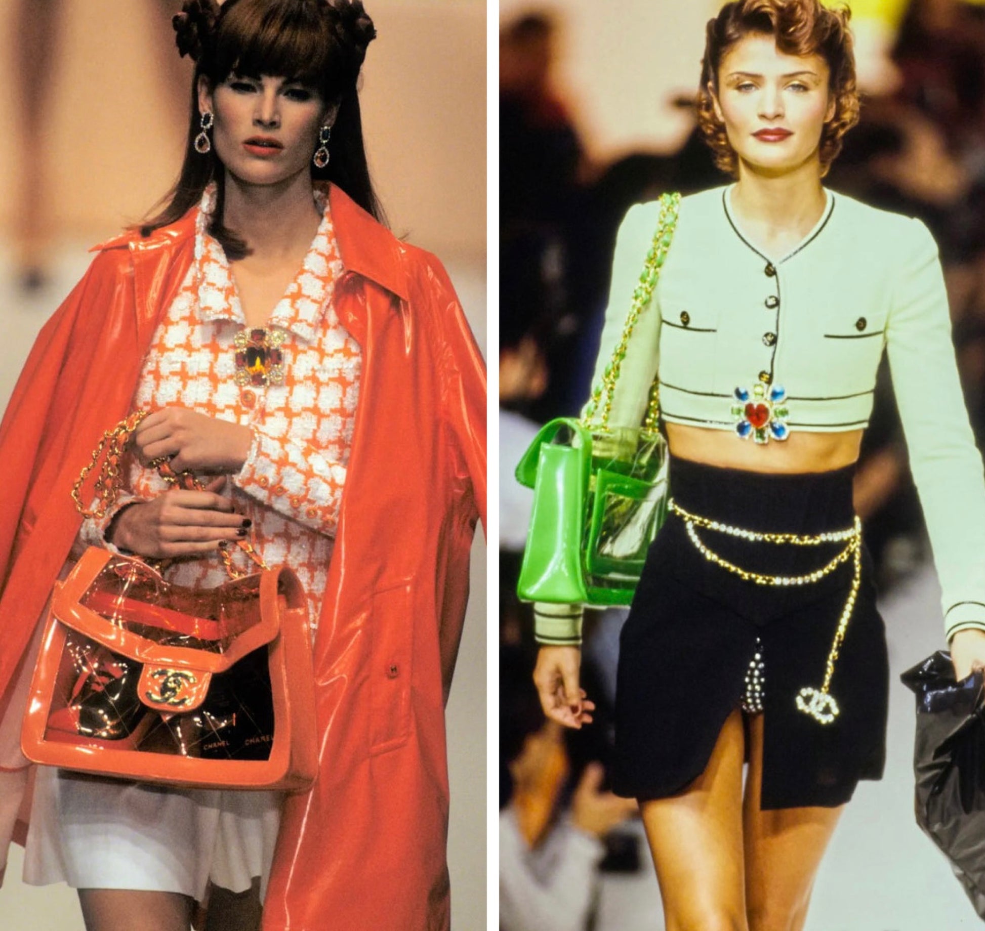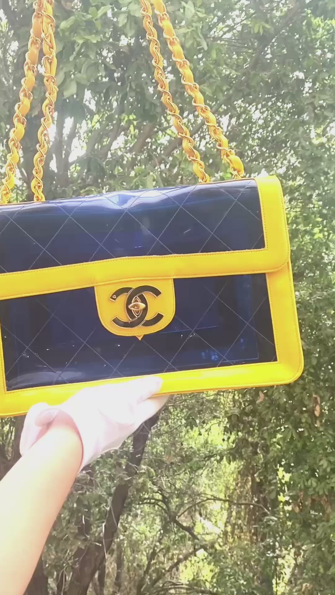 This ultra rare Chanel maxi flap bag from 1995 Spring Runway ‘Barbie Collection’ features an iconic translucent Blue PVC body accented with bold Yellow patent leather trim and a XL 24K Gold Plated striking CC logo at the front.